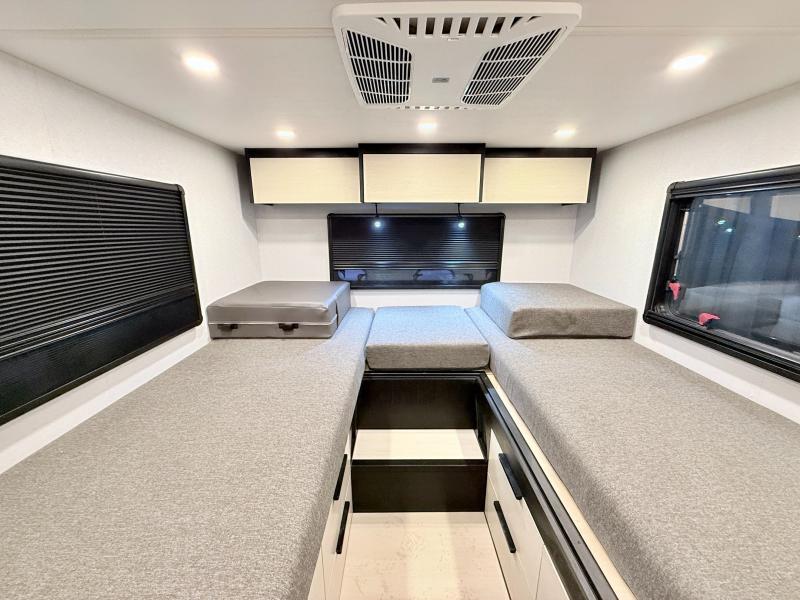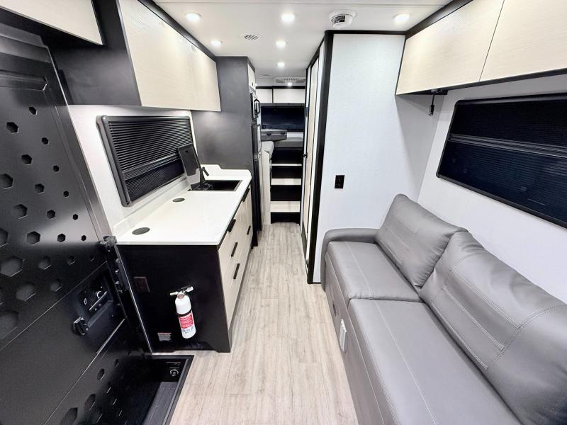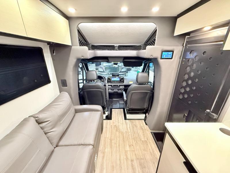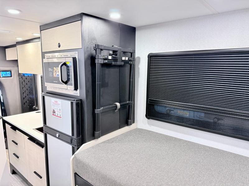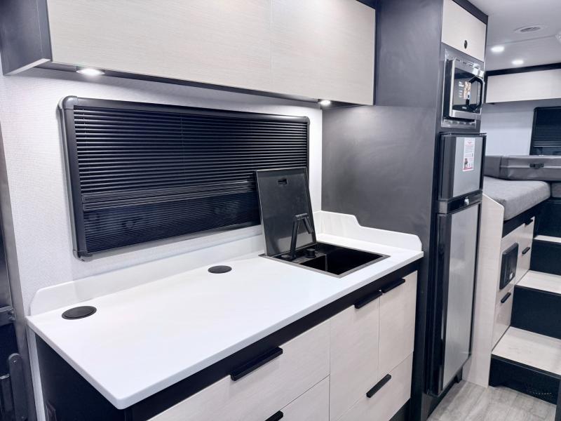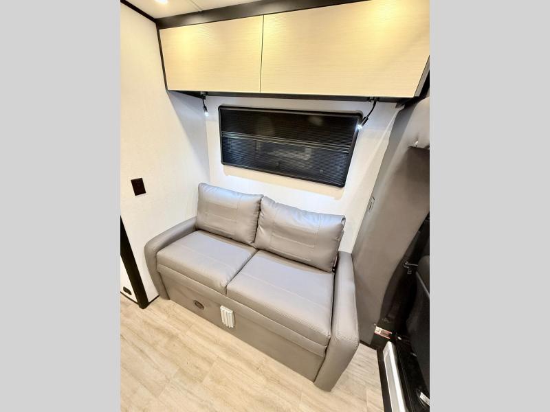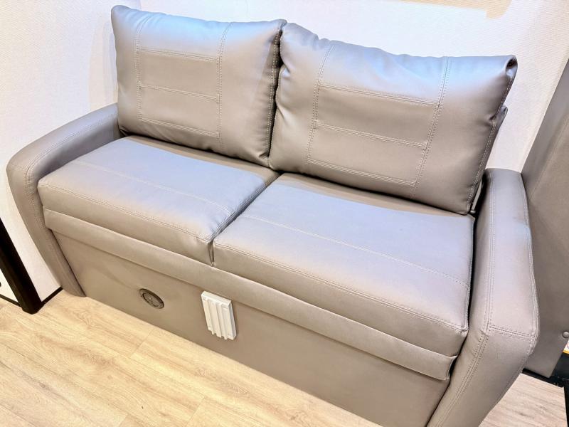 If you're an outdoor enthusiast who doesn't want to sacrifice comfort, this coach is for you! The premium Mercedes captain's seats include heat for added comfort plus they can swivel around to become part of the living area seating. You can make lunch on the single burner portable induction stove or in the stainless steel microwave/air fryer. There is a sleeper sofa for cozy seating and additional sleeping space for a guest, or you can choose the optional L-shaped lounge if you're wanting a table. The full residential-style wet bath includes a roof vent fan, towel and toilet paper holders, an oversized mirror, plus a large black aluminum under-sink cabinet with a GFCI outlet to plug in any accessories you may need. Head to the rear of this coach to find the 32" x 76" twin beds with a nightstand in between, or you can convert them into one king-size bed. There is also an overhead cabinet and dual pull-out closets so you both have a place for your things!