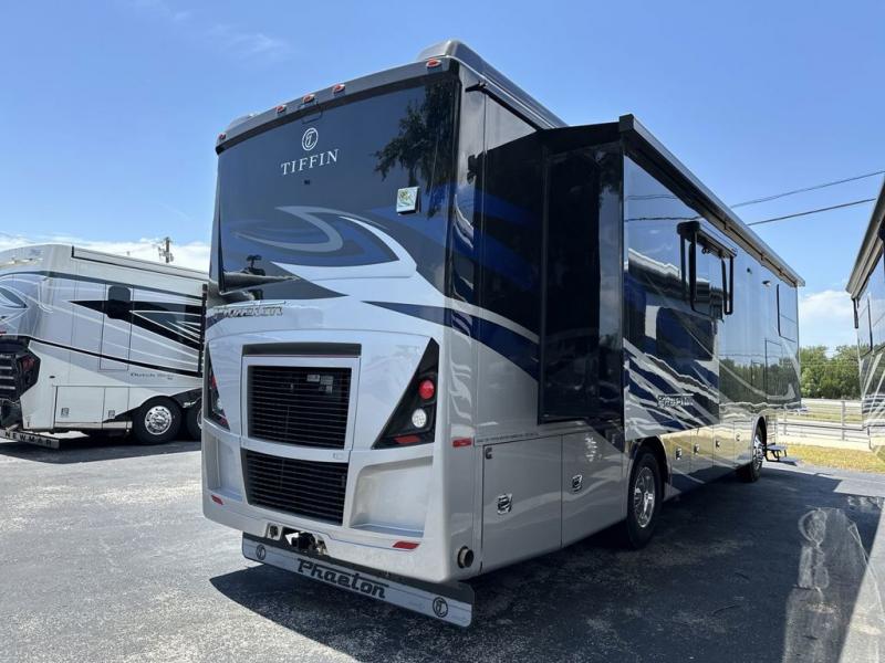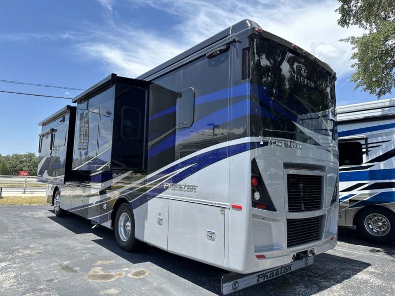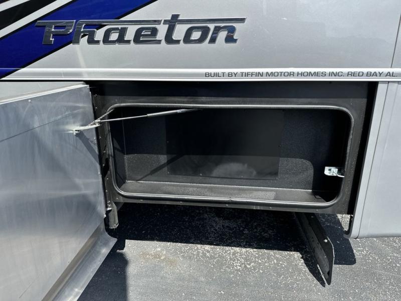 Each one of these Tiffin Motorhomes Phaeton Class A diesel motorhomes offer high-end elegance at every turn! A PowerGlide XC raised rail rear engine diesel chassis will give you a smooth ride for every mile, and each coach comes with a Cummins L9 450 HP engine to power your journeys. There is a 10.0 kW Onan Quiet Diesel generator, three 15k BTU A/C units, and a Firefly integrations Mira module to keep you connected wherever you go. Outside, you'll appreciate the custom rock guard to protect your unit, along with full-body paint with four layers of clear coat and high-performance protection film on the front cap and select areas. A Girard power awning with LED lights also comes standard plus a fiberglass reinforced plastic basement floor, an exterior TV, and more. If you're traveling with pets, the optional Pet Perks Package can be added that includes a pet dish holder and a leash holder at the entrance door for added convenience!
