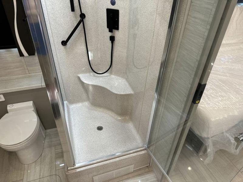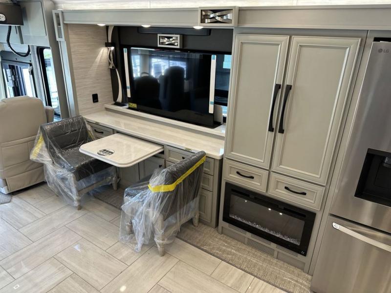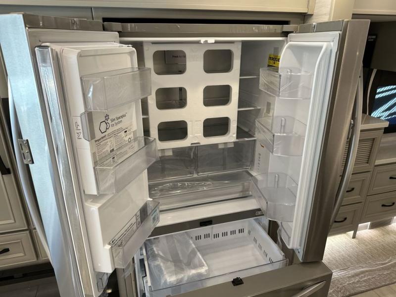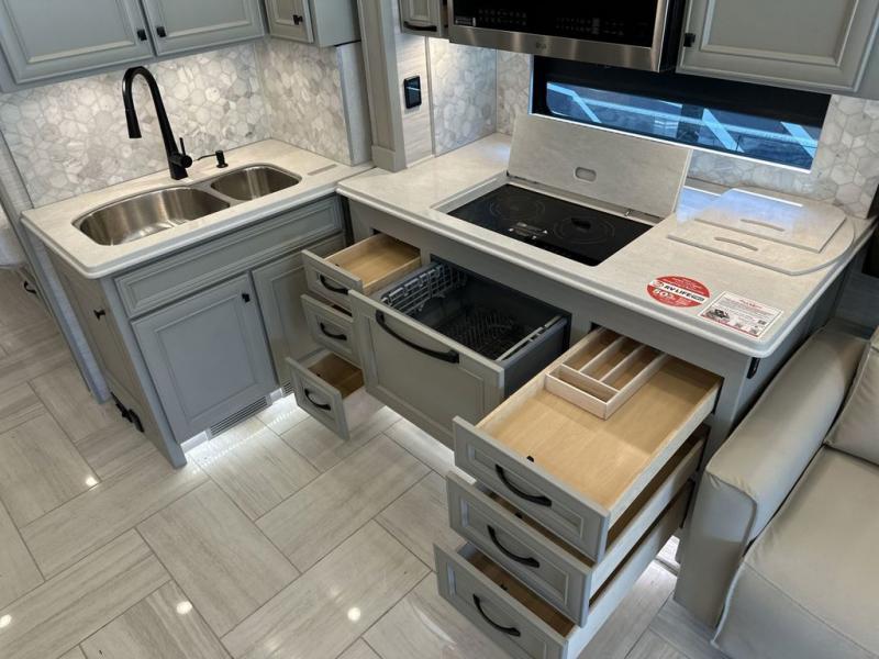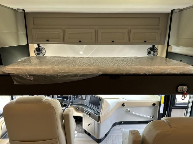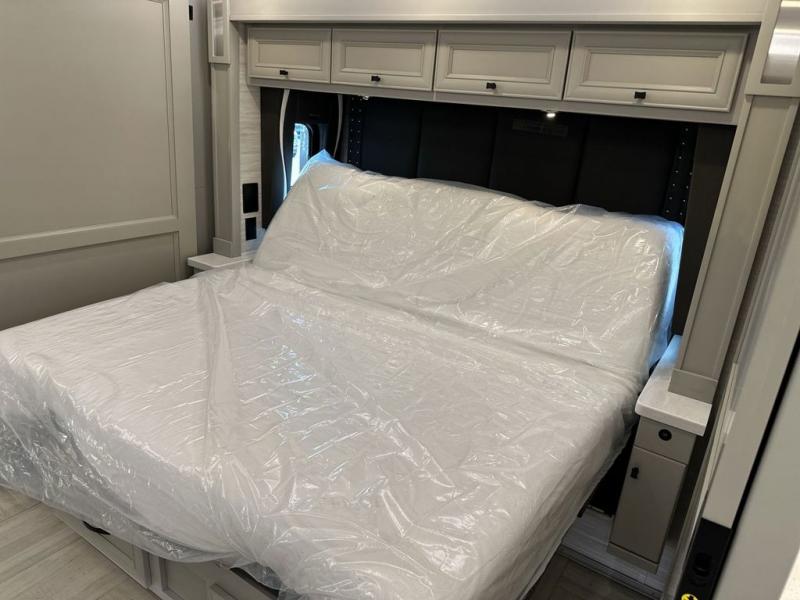 Travel the country with this comfortable motorhome! The full rear bathroom will have you feeling right at home with the dual sink vanity that has a tri-view mirror, a shower with a seat, and a closet with has an area prepped to add an optional stacked washer and dryer. Get a good night's rest on the 72" x 80" king bed slide with nightstands on either side across from stacked drawers and a mounted bedroom TV. You will have everything you need to prepare delicious home cooked meals including a smart convection microwave with an air fryer, storage drawers for ingredients, and you can even add an optional drawer-type dishwasher to make clean up easier. The air coil sofa bed offers another comfortable sleeping space for a guest or two, plus you can add an optional drop-down front bunk for even more sleeping space. This model also includes a dinette with chairs and an optional fireplace if you want to make your space even more cozy!