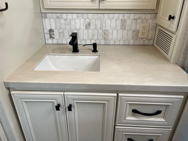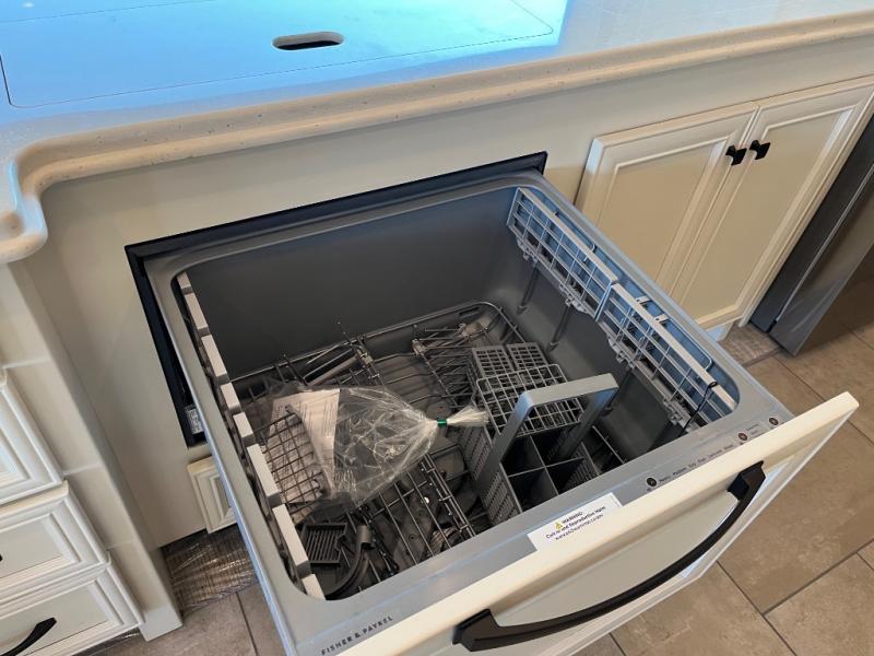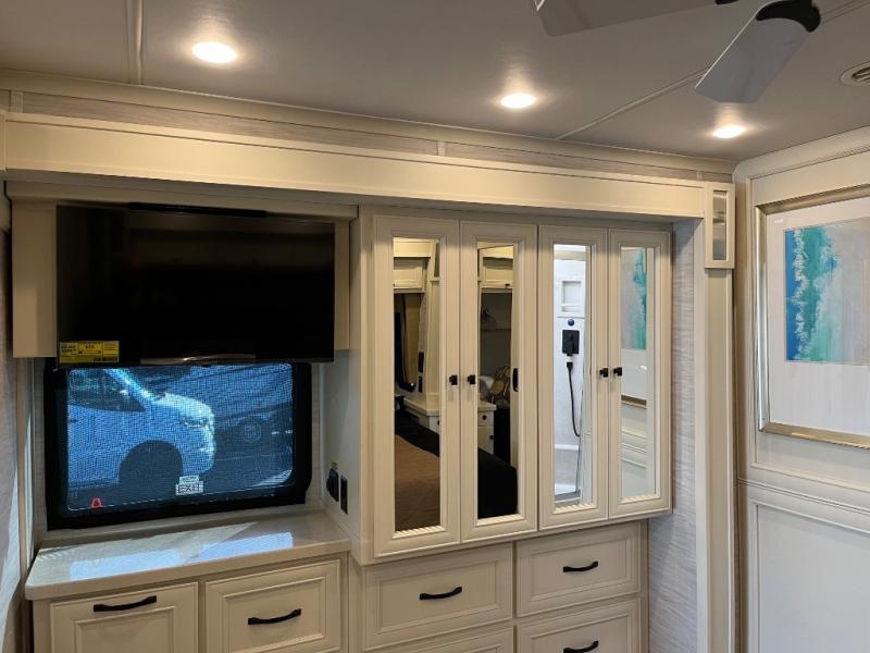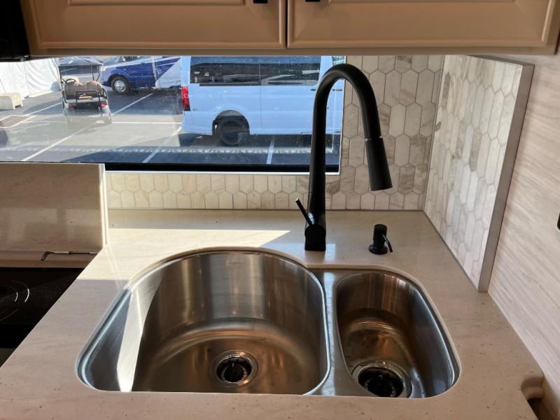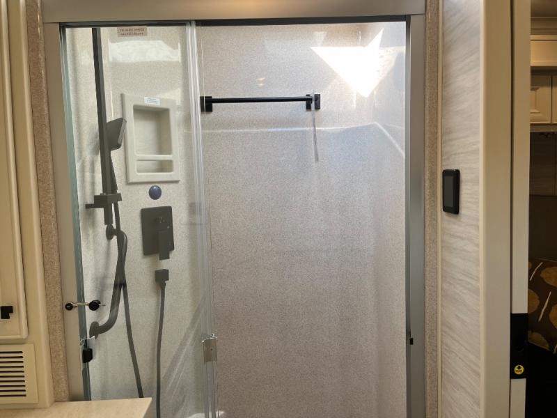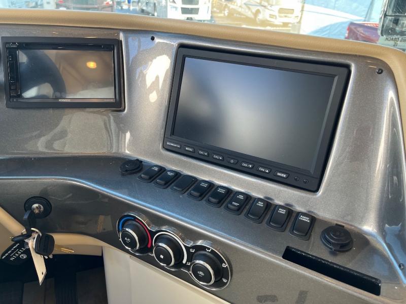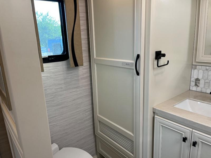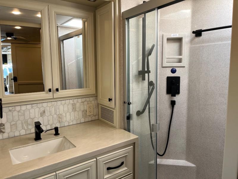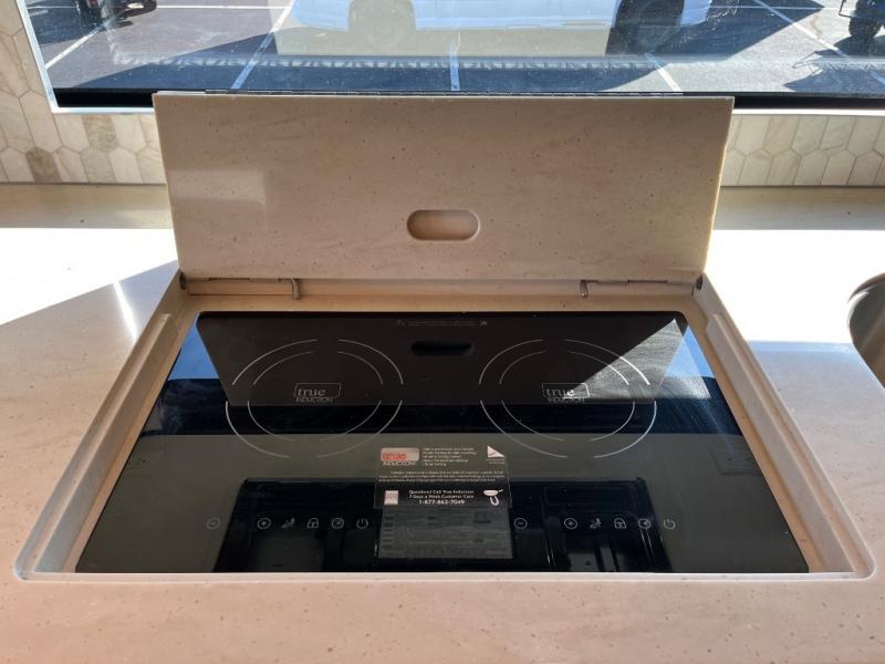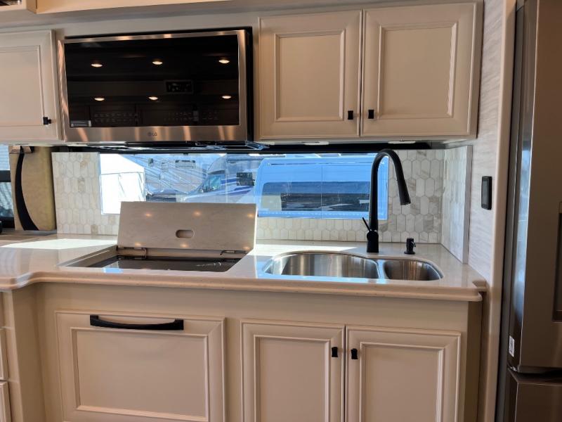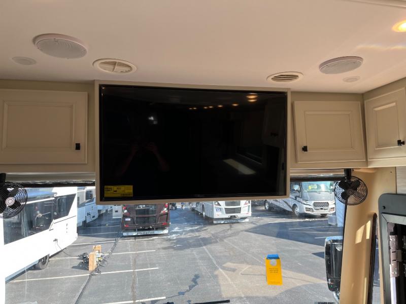 A bath and a half makes life easier on the road with this Phaeton motorhome! The master suite has a king bed slide across from a wardrobe, laundry hamper, and mounted TV, plus access to the full rear bathroom. The bathroom not only has a shower with a seat and a linen closet, but also an area that is prepped to add an optional washer and dryer. The chef can prepare their best meals in the kitchen and clean up will be even easier if you choose to add the optional drawer-type dishwasher. After a long day of traveling, everyone can relax on either the air coil sofa bed, the DE sofa bed with a lift TV behind it, or play some games at the booth dinette. There are many other options you can add to customize it to fit your style like the optional drop-down front bunk, the recliner with lift TV and fireplace, the U-shaped dinette, and theater seating!