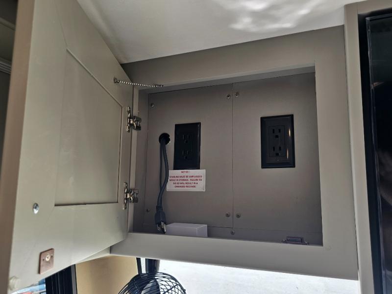 King bed slide in master suite with mounted TV, laundry hamper & stacked drawers