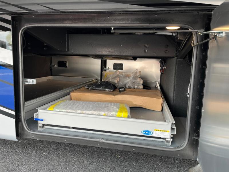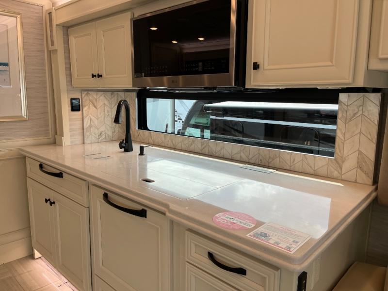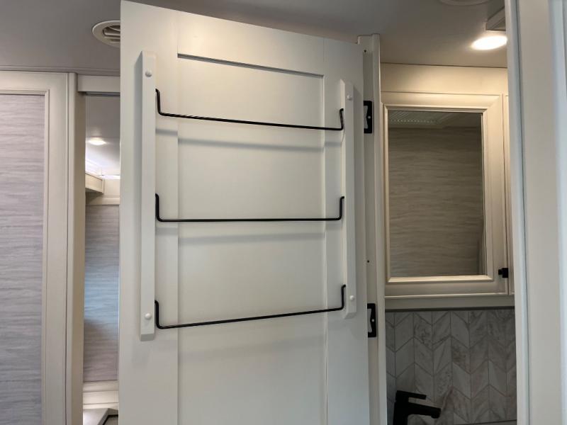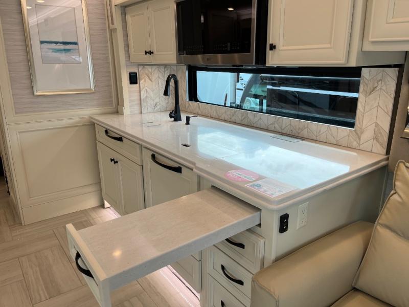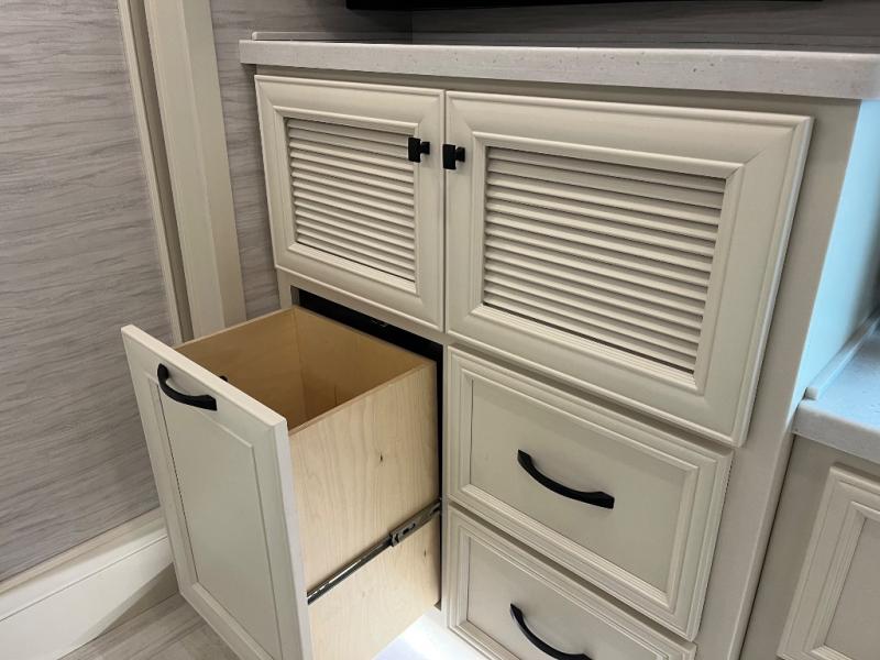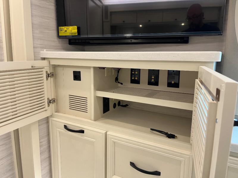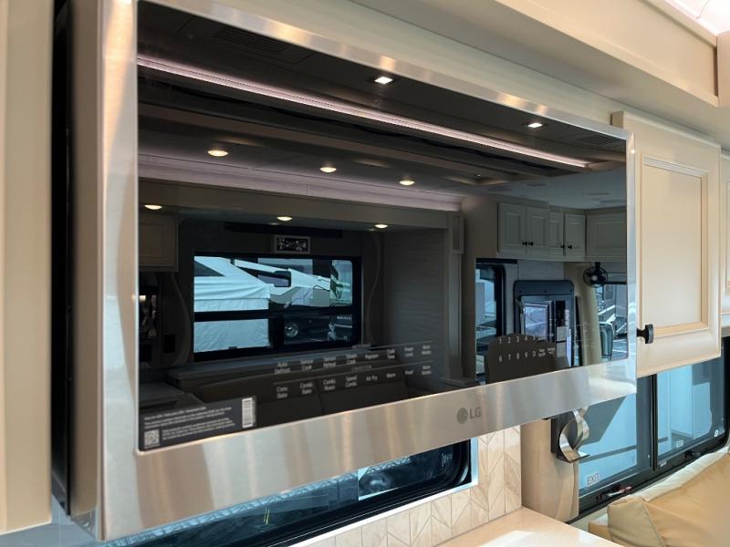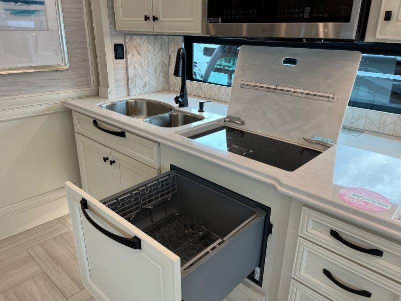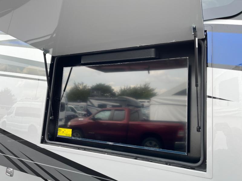 You will feel right at home in this coach with a master suite and king bed slide, mounted TV, laundry hamper, and stacked drawers. You all have quick access to the full rear bathroom. The bathroom not only has a dual sink vanity with a tri-view mirror for two to get ready at once, but also a shower with a seat and a large closet with an area next to it prepped to add an optional washer and dryer. The chef can prepare their best meals either indoors with the countertop extension and cooktop with convection microwave or outside if you add the optional outdoor grill. You can even watch the big game outside with the exterior TV with a sound bar!