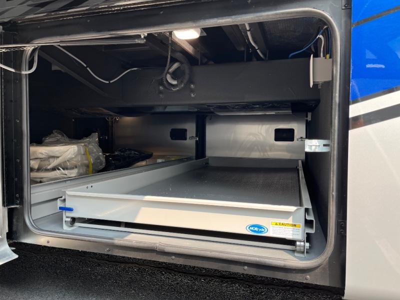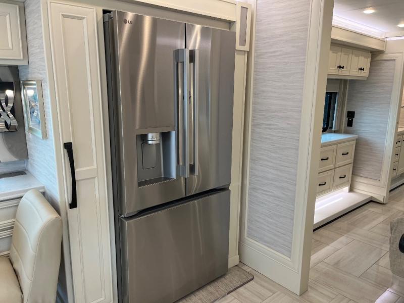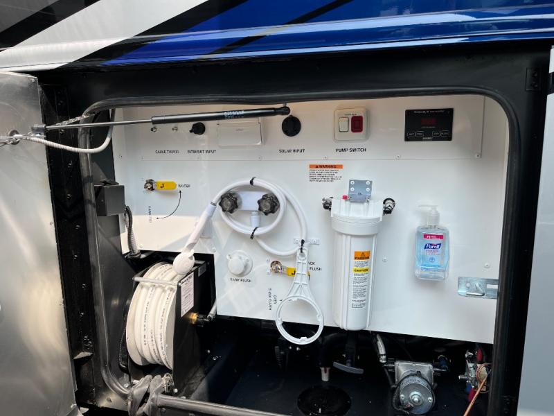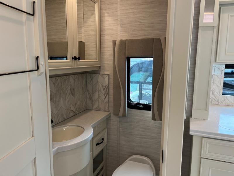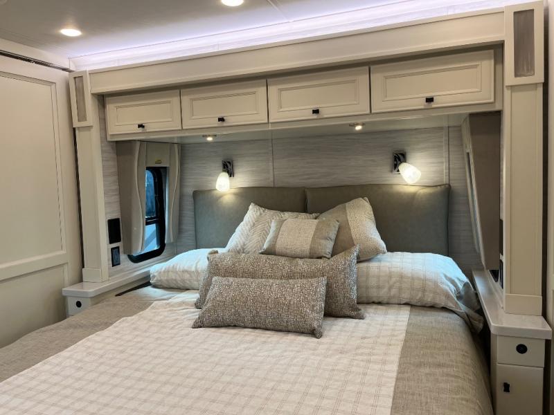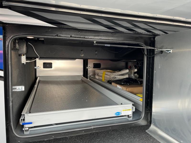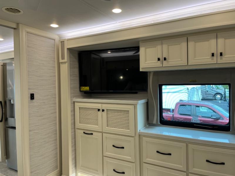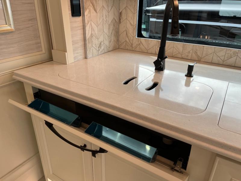 You will feel right at home in this coach with a master suite and king bed slide, mounted TV, laundry hamper, and stacked drawers. You all have quick access to the full rear bathroom. The bathroom not only has a dual sink vanity with a tri-view mirror for two to get ready at once, but also a shower with a seat and a large closet with an area next to it prepped to add an optional washer and dryer. The chef can prepare their best meals either indoors with the countertop extension and cooktop with convection microwave or outside if you add the optional outdoor grill. You can even watch the big game outside with the exterior TV with a sound bar!