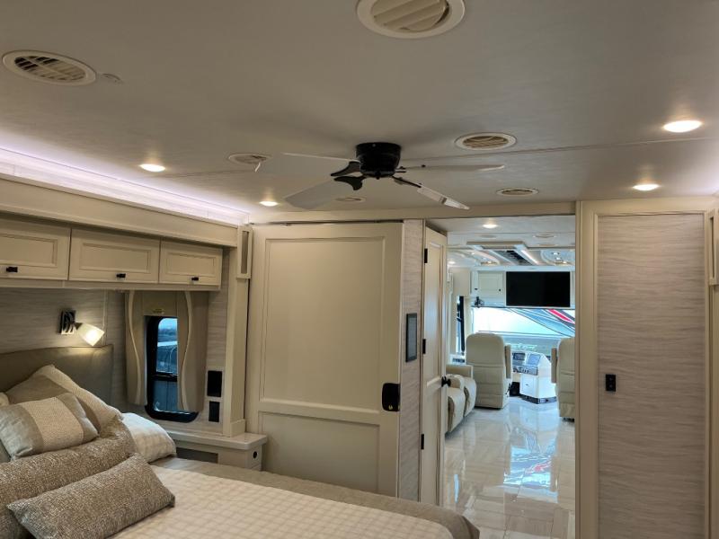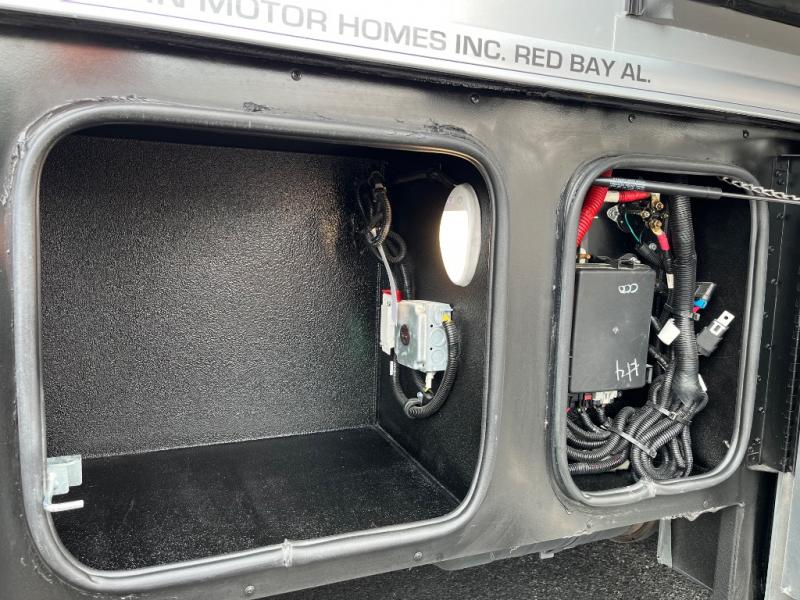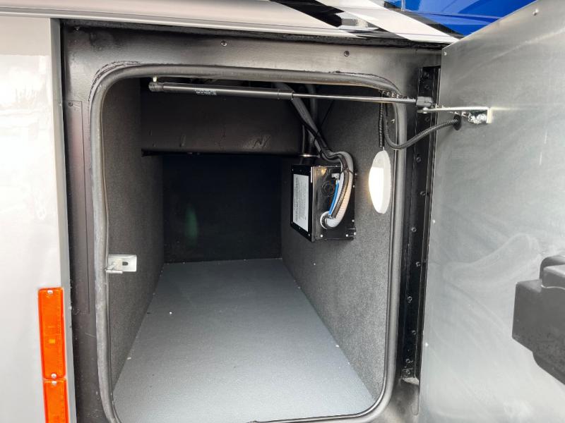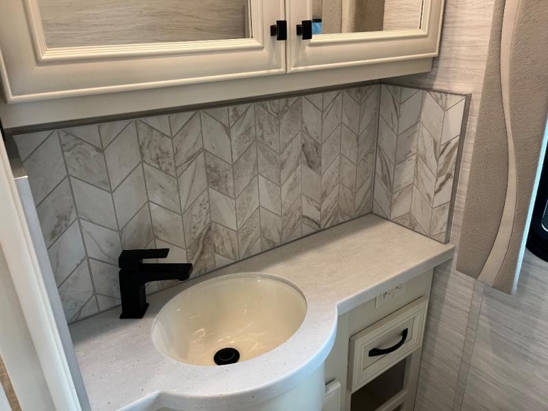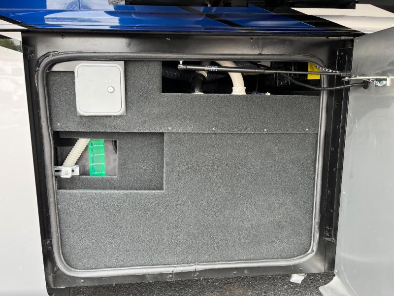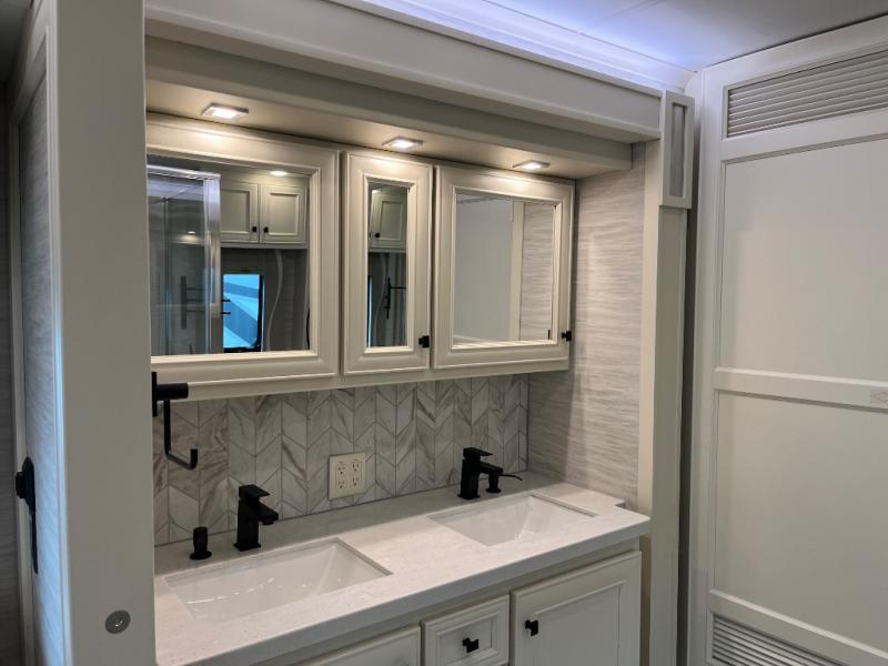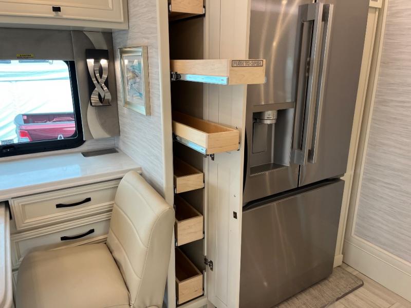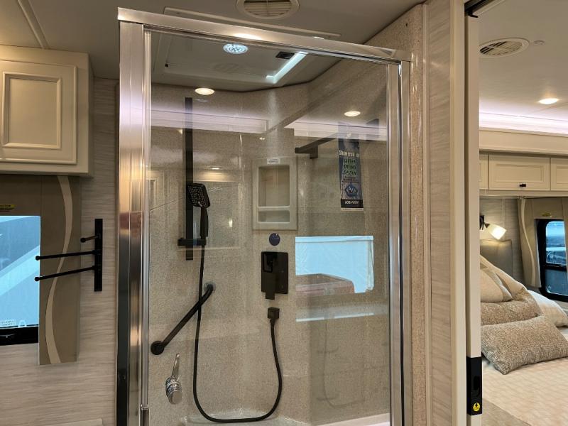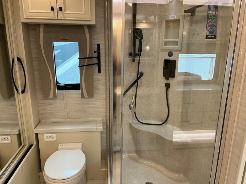 You will feel right at home in this coach with a master suite and king bed slide, mounted TV, laundry hamper, and stacked drawers. You all have quick access to the full rear bathroom. The bathroom not only has a dual sink vanity with a tri-view mirror for two to get ready at once, but also a shower with a seat and a large closet with an area next to it prepped to add an optional washer and dryer. The chef can prepare their best meals either indoors with the countertop extension and cooktop with convection microwave or outside if you add the optional outdoor grill. You can even watch the big game outside with the exterior TV with a sound bar!