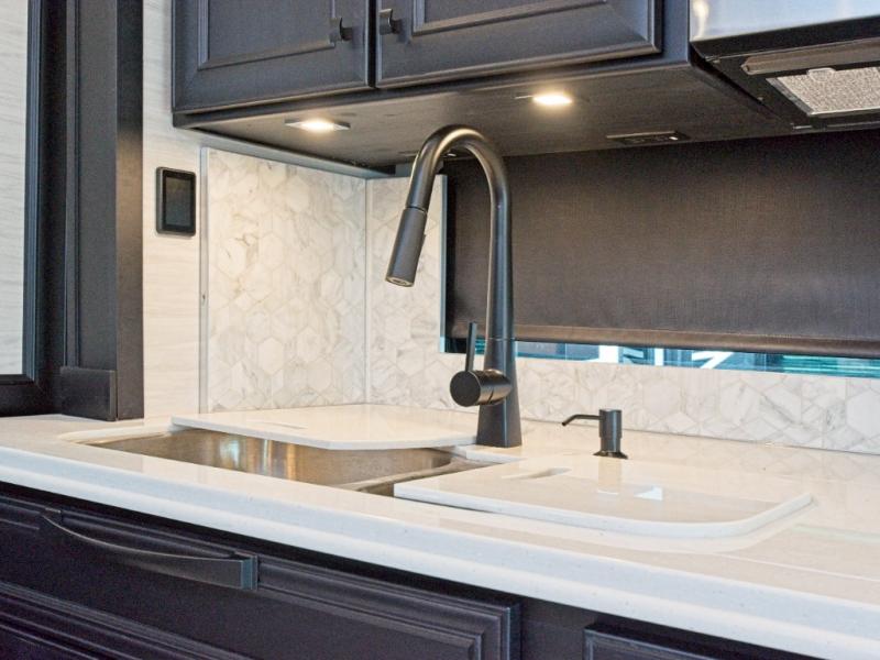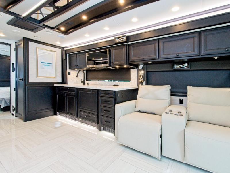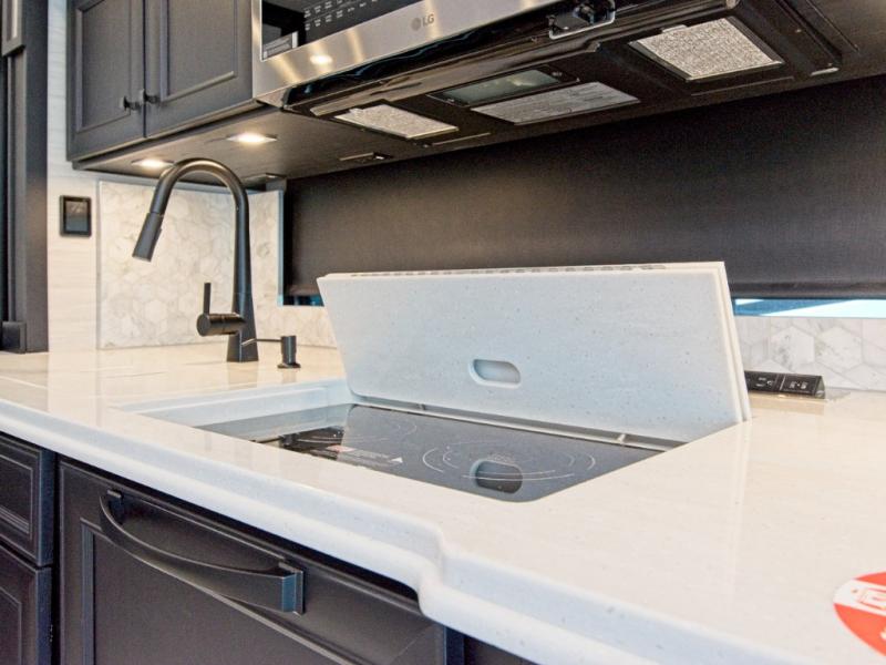 Prepare meals in the fully equipped kitchen with a cooktop, convection microwave with air fryer, and countertop extension. Add the optional outdoor grill for alfresco cooking, and enjoy entertainment outside with the exterior TV and sound bar.