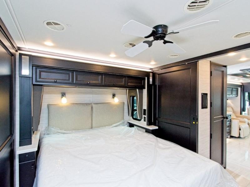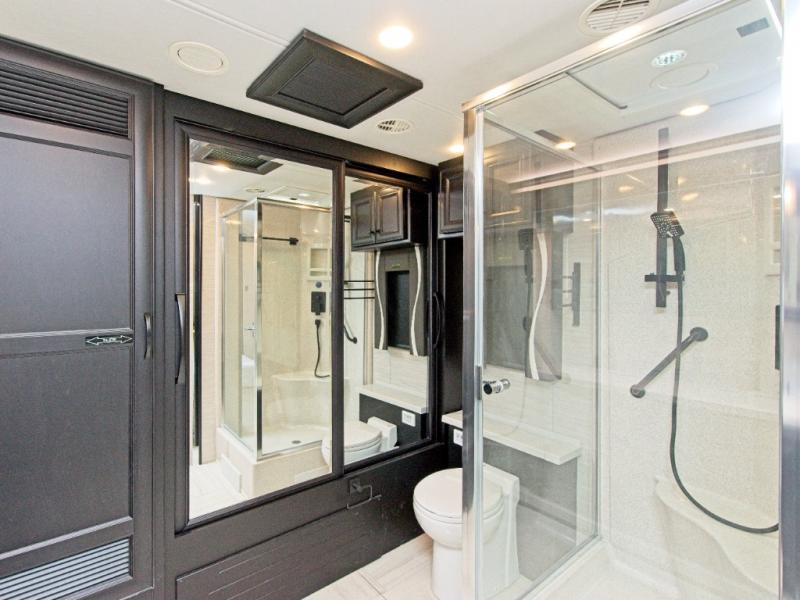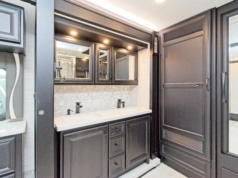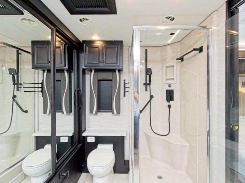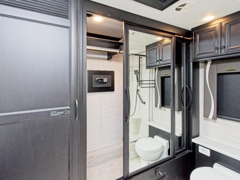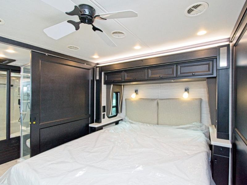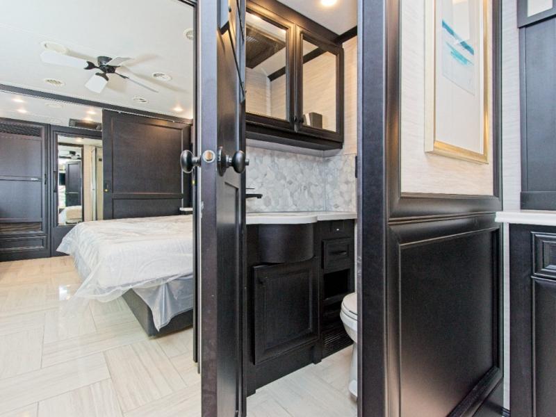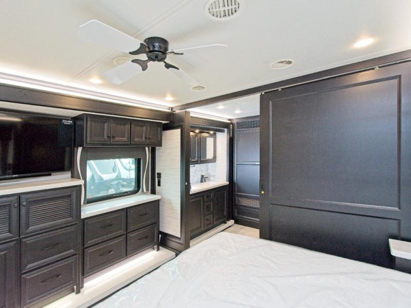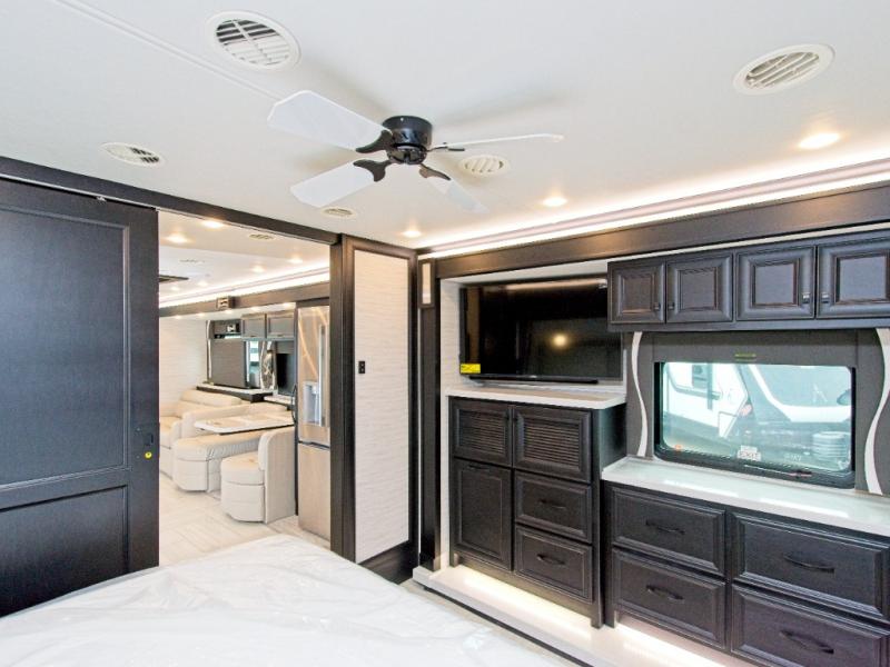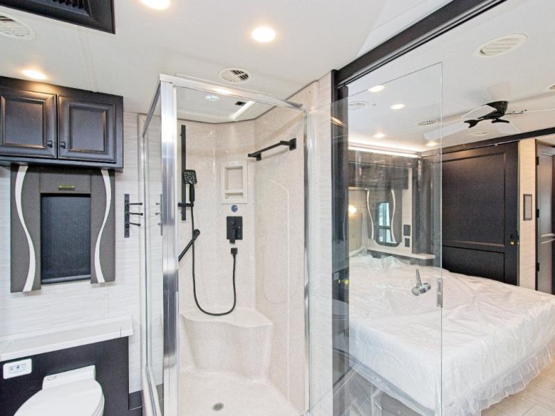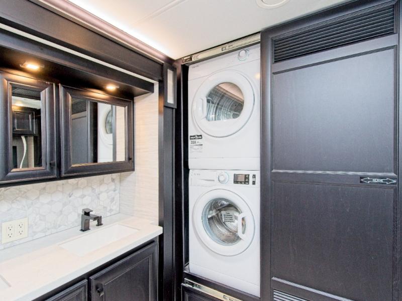 Enjoy the luxury of a private master suite featuring a king bed slide-out, mounted TV, laundry hamper, and stacked drawers for organized storage. The rear full bathroom offers dual vanities with a tri-view mirror, a seated shower, and a large wardrobe with washer/dryer prep—perfect for extended stays.