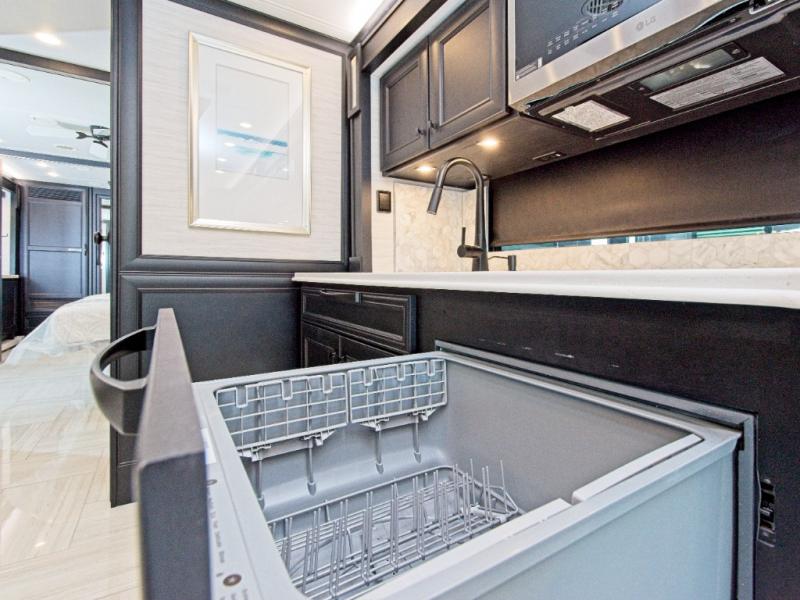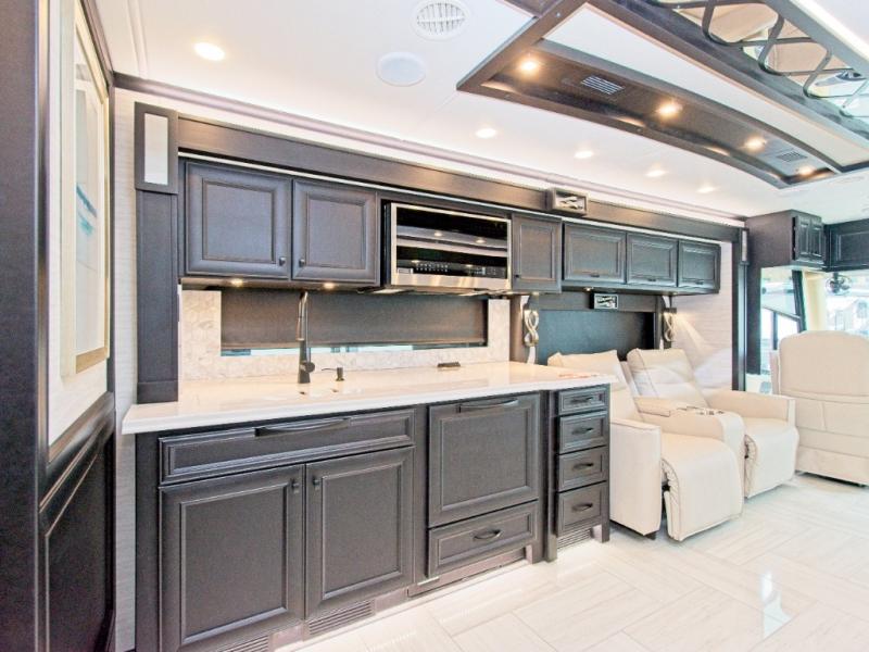 Experience luxury on the road with the Tiffin Phaeton 40 IH, featuring a spacious master suite with a king bed slide-out and a gourmet kitchen equipped with a convection microwave and air fryer.