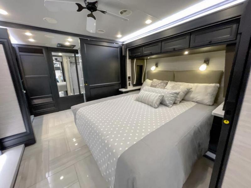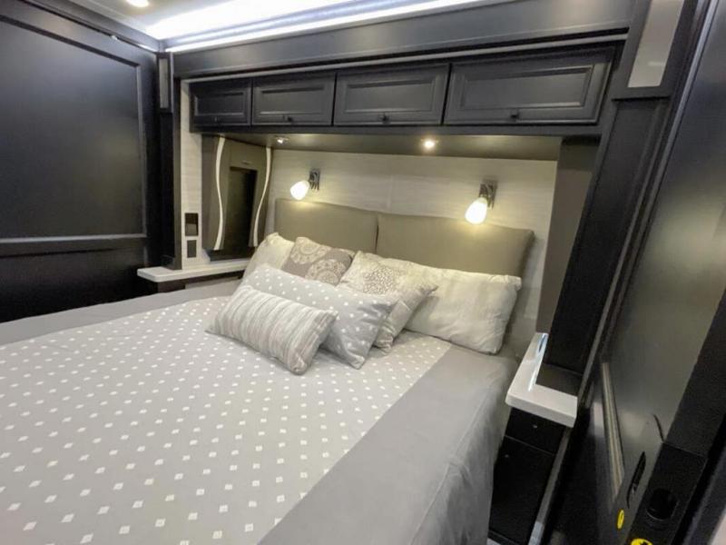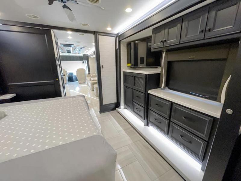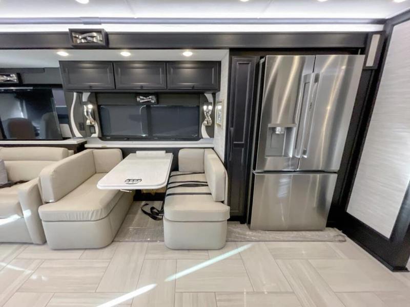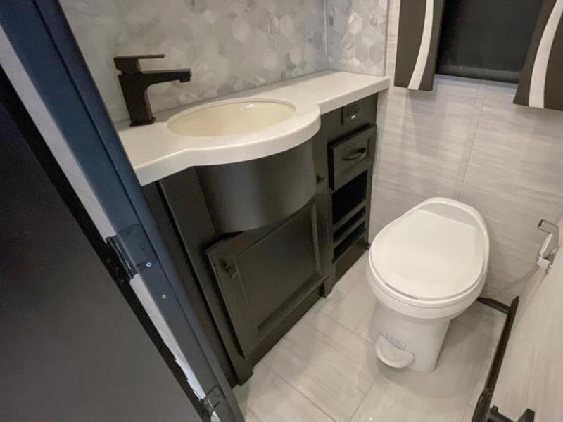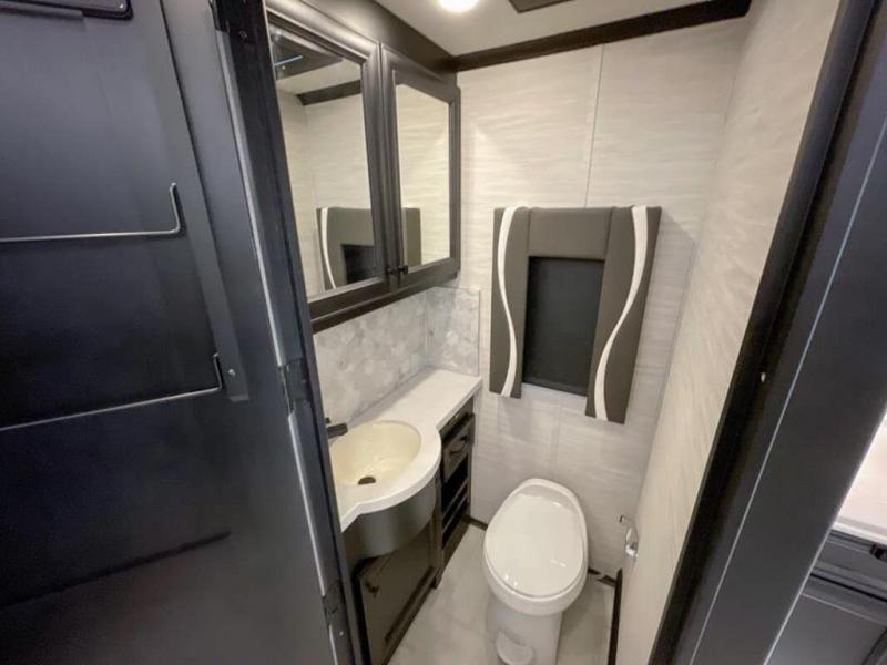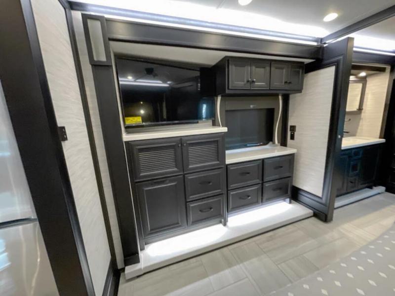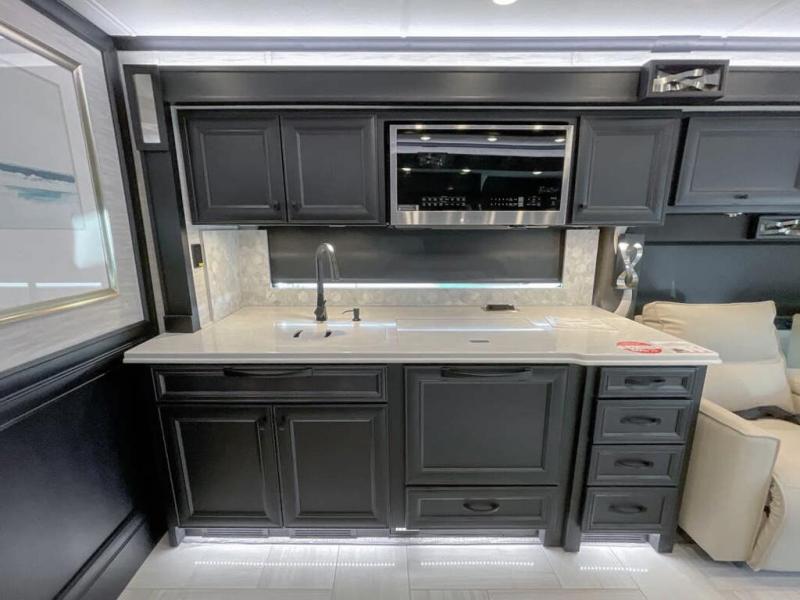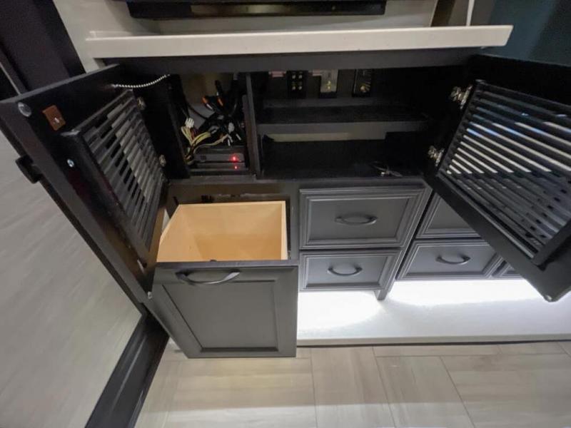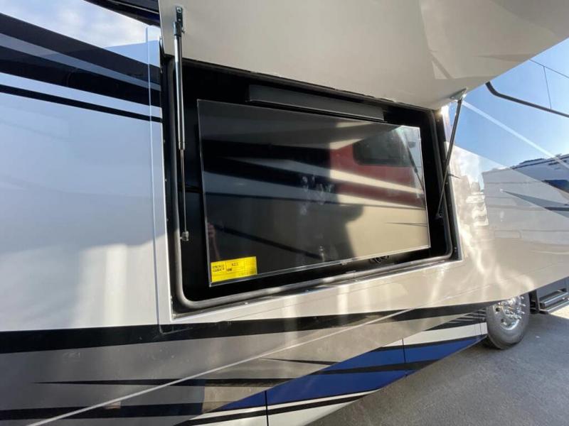 You will feel right at home in this coach with a master suite and king bed slide, mounted TV, laundry hamper, and stacked drawers. You all have quick access to the full rear bathroom. The bathroom not only has a dual sink vanity with a tri-view mirror for two to get ready at once, but also a shower with a seat and a large closet with an area next to it prepped to add an optional washer and dryer. The chef can prepare their best meals either indoors with the countertop extension and cooktop with convection microwave or outside if you add the optional outdoor grill. You can even watch the big game outside with the exterior TV with a sound bar!