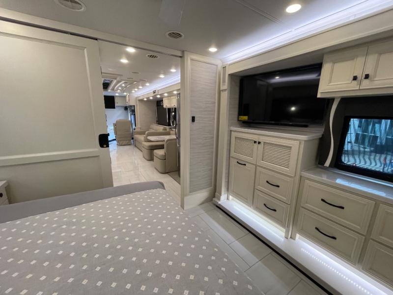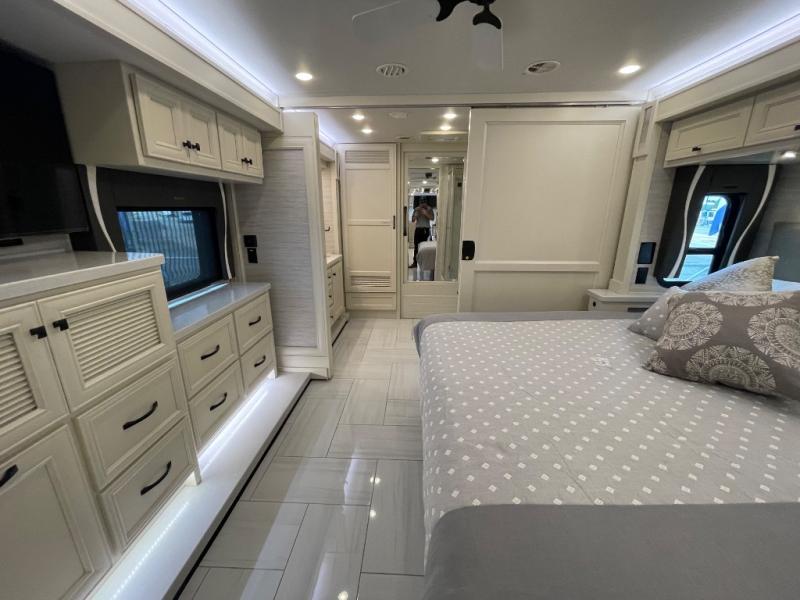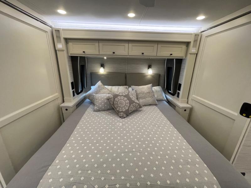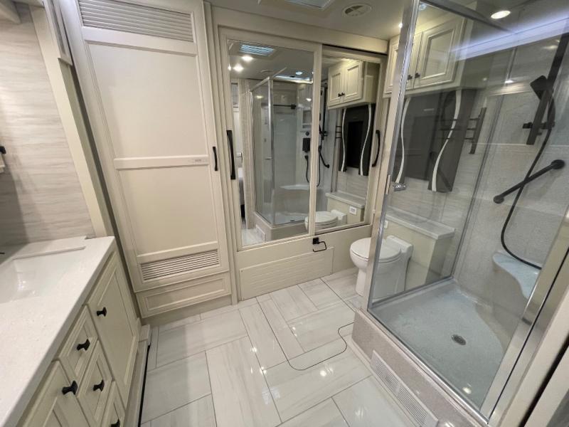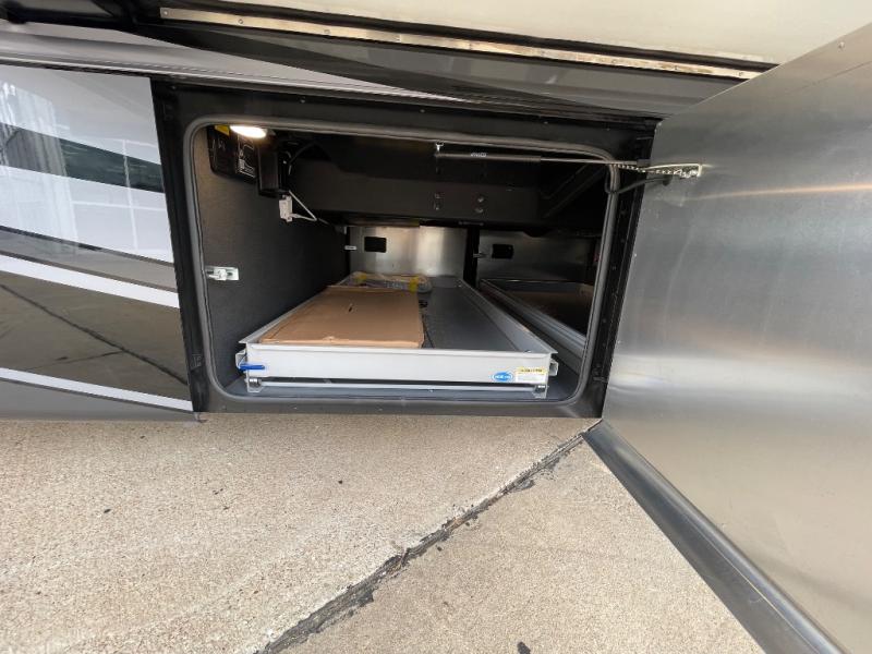You will feel right at home in this coach with a master suite and king bed slide, mounted TV, laundry hamper, and stacked drawers. You all have quick access to the full rear bathroom. The bathroom not only has a dual sink vanity with a tri-view mirror for two to get ready at once, but also a shower with a seat and a large closet with an area next to it prepped to add an optional washer and dryer. The chef can prepare their best meals either indoors with the countertop extension and cooktop with convection microwave or outside if you add the optional outdoor grill. You can even watch the big game outside with the exterior TV with a sound bar!