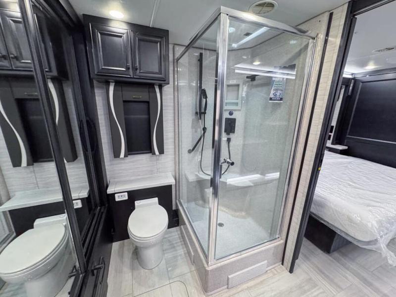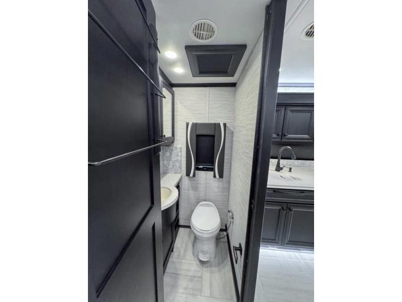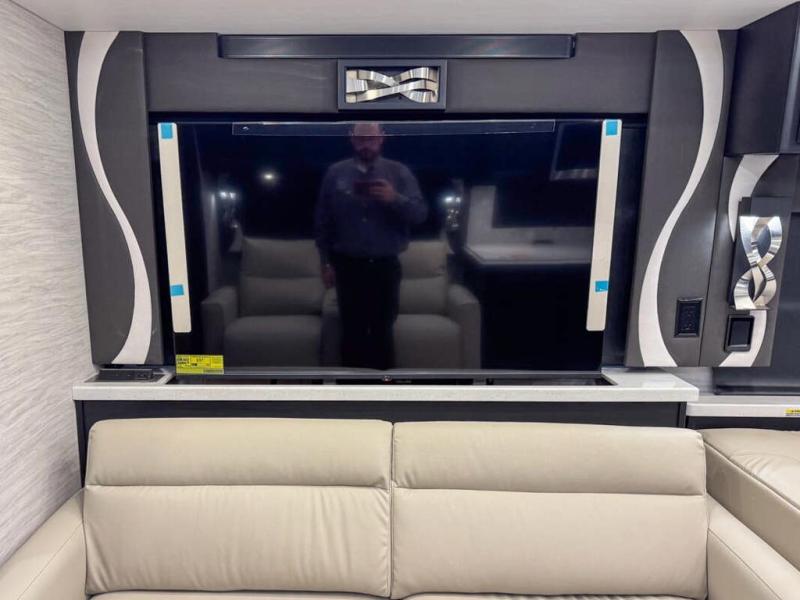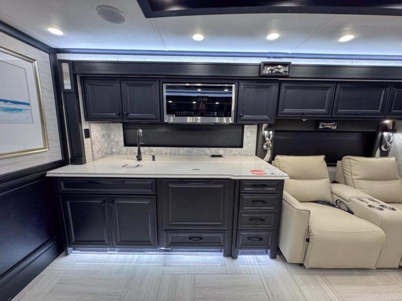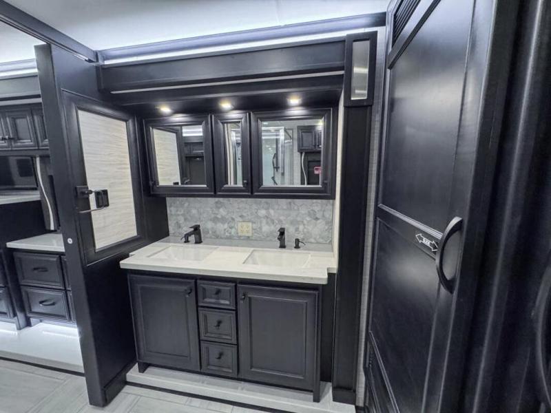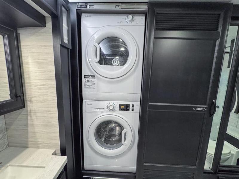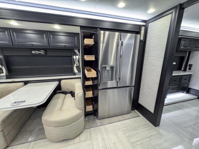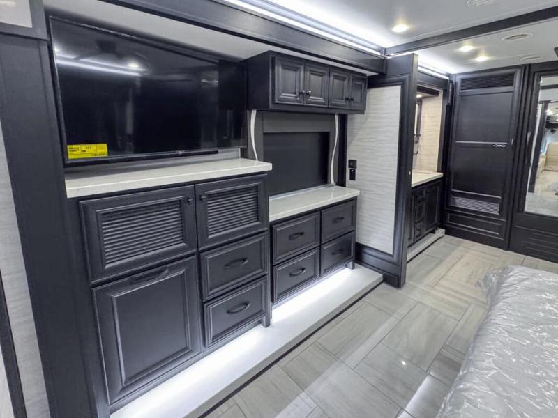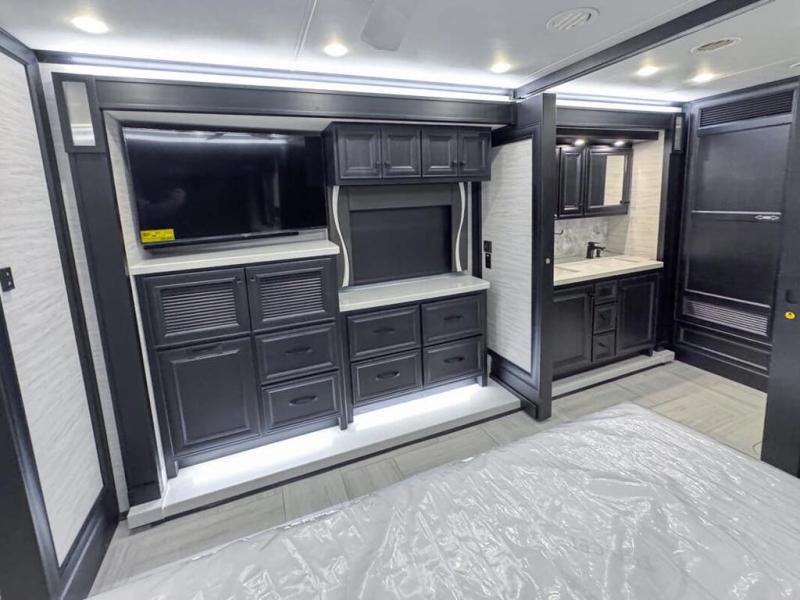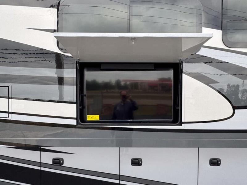 You will feel right at home in this coach with a master suite and king bed slide, mounted TV, laundry hamper, and stacked drawers. You all have quick access to the full rear bathroom. The bathroom not only has a dual sink vanity with a tri-view mirror for two to get ready at once, but also a shower with a seat and a large closet with an area next to it prepped to add an optional washer and dryer. The chef can prepare their best meals either indoors with the countertop extension and cooktop with convection microwave or outside if you add the optional outdoor grill. You can even watch the big game outside with the exterior TV with a sound bar!