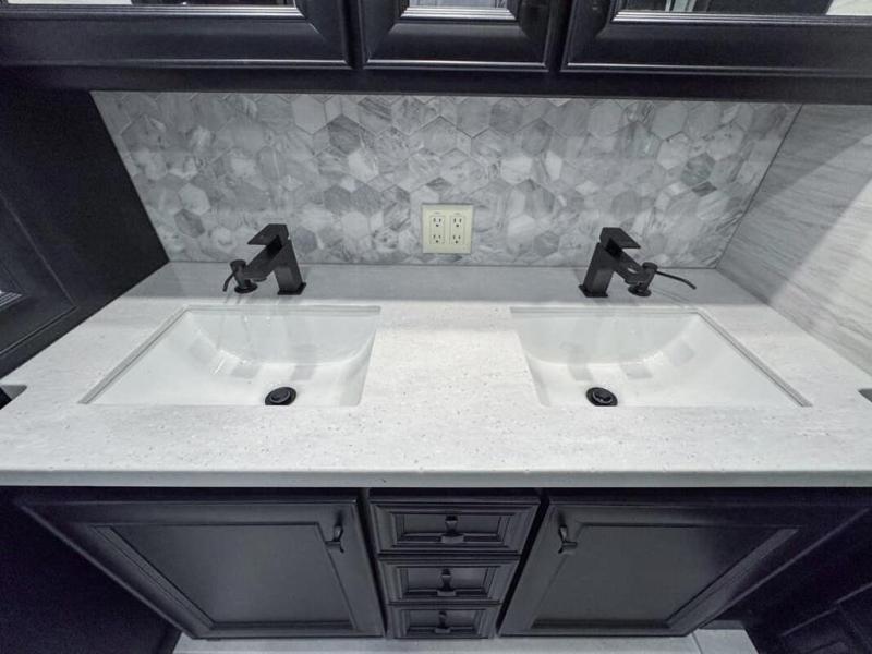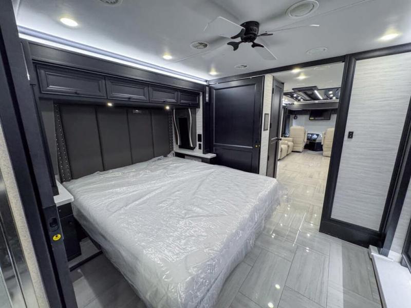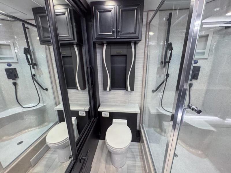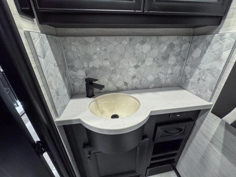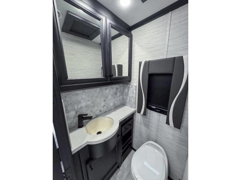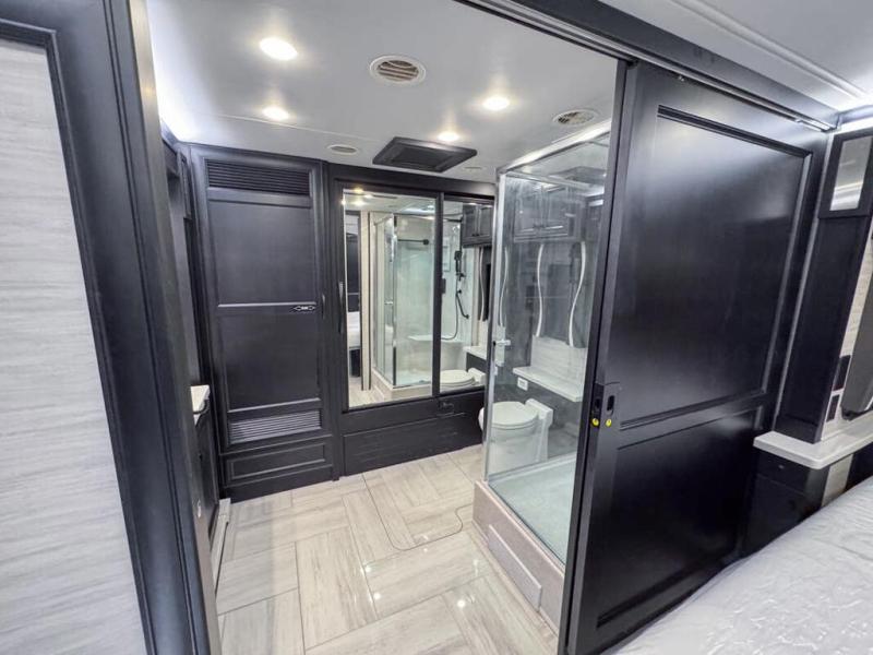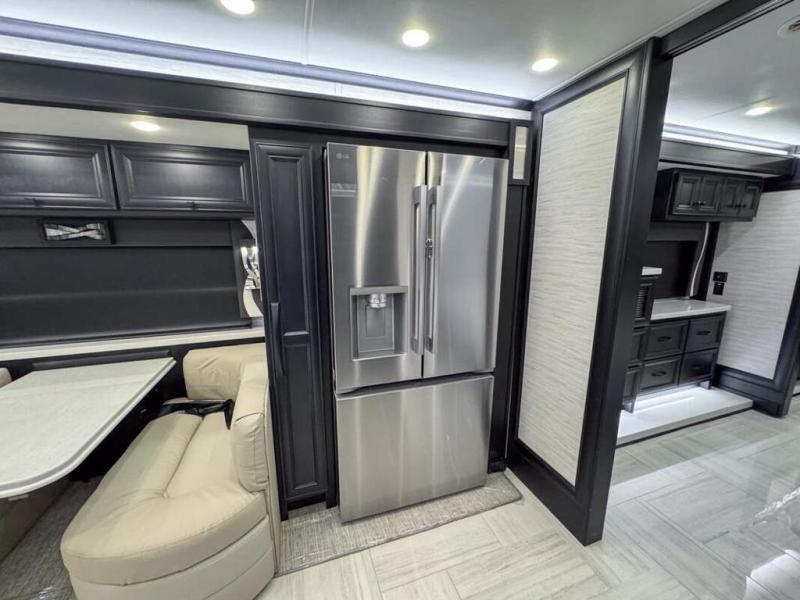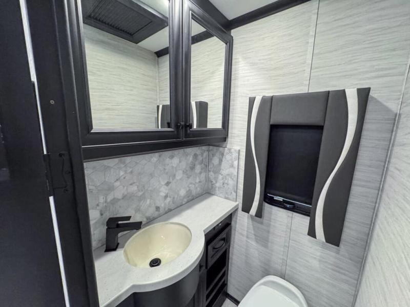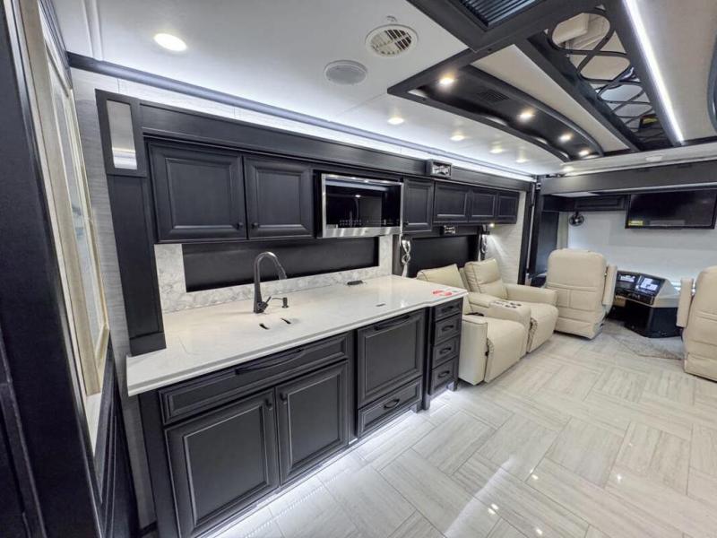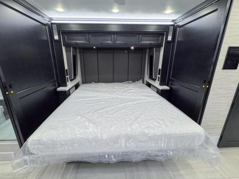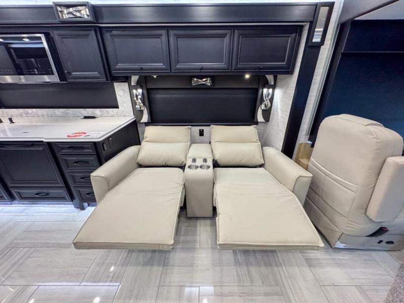 You will feel right at home in this coach with a master suite and king bed slide, mounted TV, laundry hamper, and stacked drawers. You all have quick access to the full rear bathroom. The bathroom not only has a dual sink vanity with a tri-view mirror for two to get ready at once, but also a shower with a seat and a large closet with an area next to it prepped to add an optional washer and dryer. The chef can prepare their best meals either indoors with the countertop extension and cooktop with convection microwave or outside if you add the optional outdoor grill. You can even watch the big game outside with the exterior TV with a sound bar!