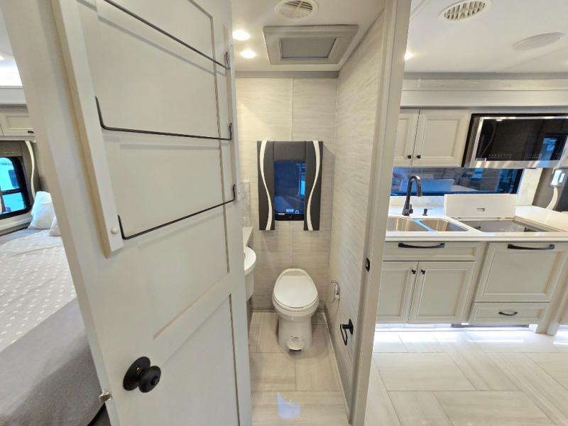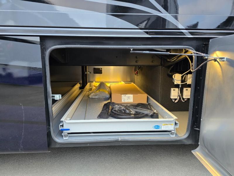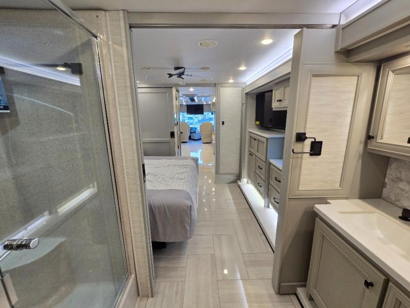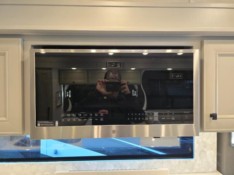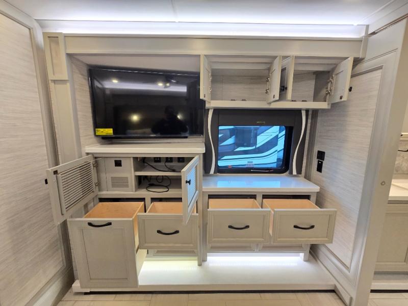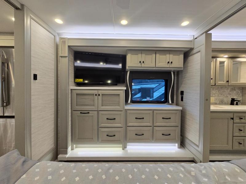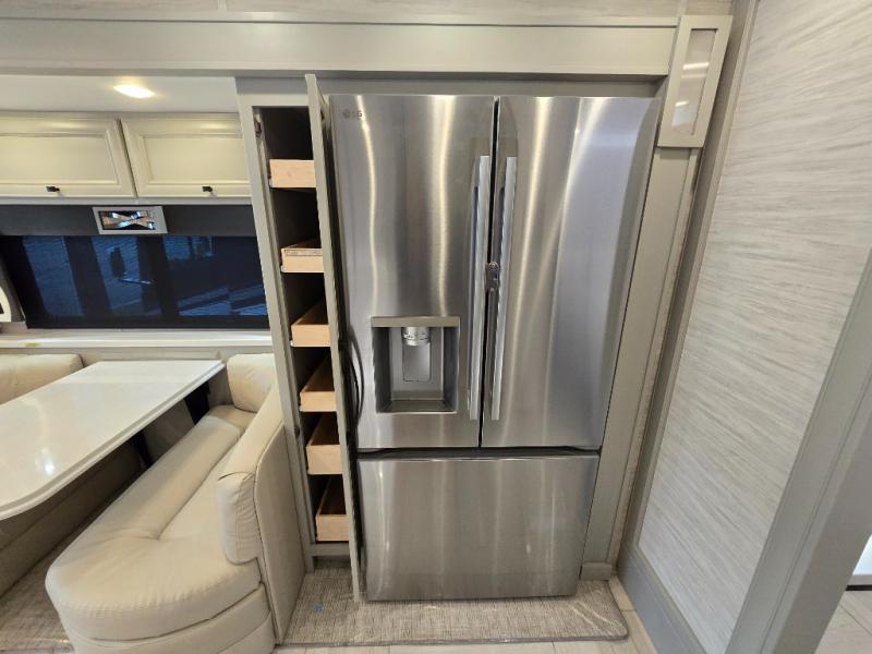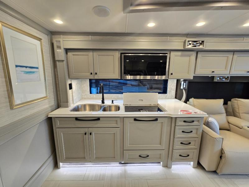You will feel right at home in this coach with a master suite and king bed slide, mounted TV, laundry hamper, and stacked drawers. You all have quick access to the full rear bathroom. The bathroom not only has a dual sink vanity with a tri-view mirror for two to get ready at once, but also a shower with a seat and a large closet with an area next to it prepped to add an optional washer and dryer. The chef can prepare their best meals either indoors with the countertop extension and cooktop with convection microwave or outside if you add the optional outdoor grill. You can even watch the big game outside with the exterior TV with a sound bar!