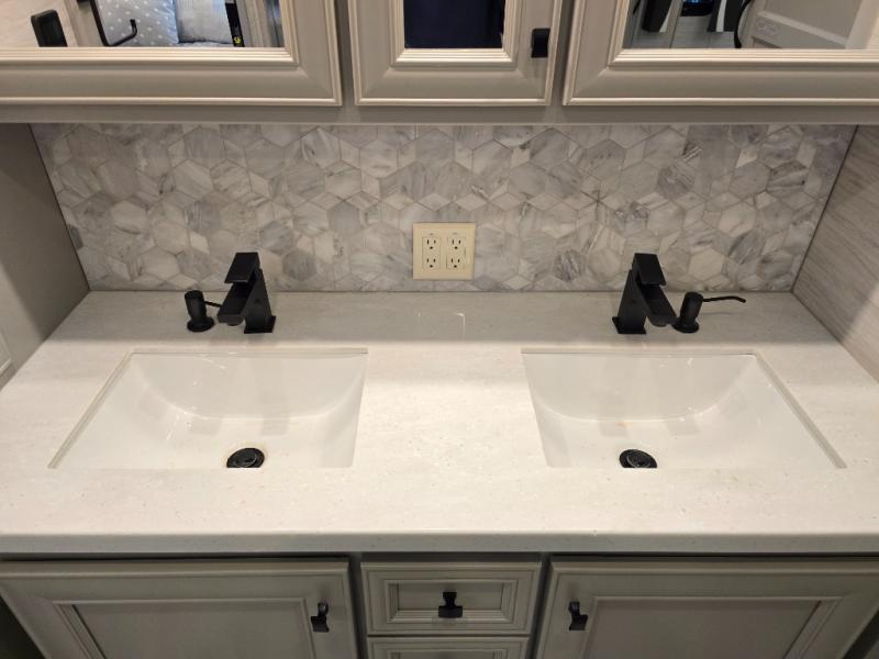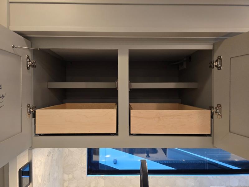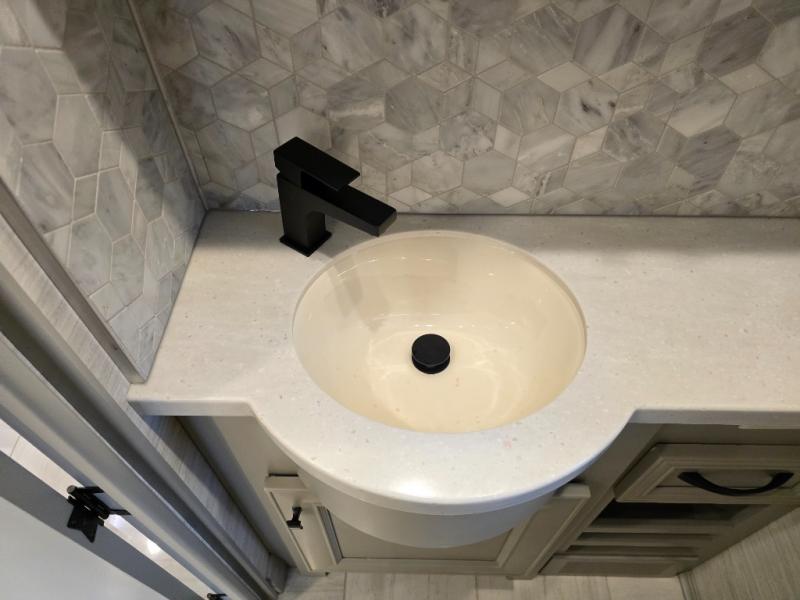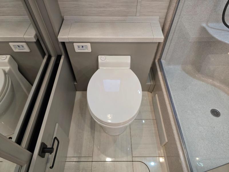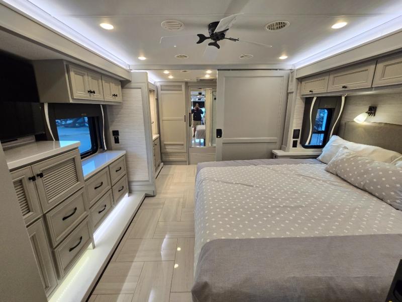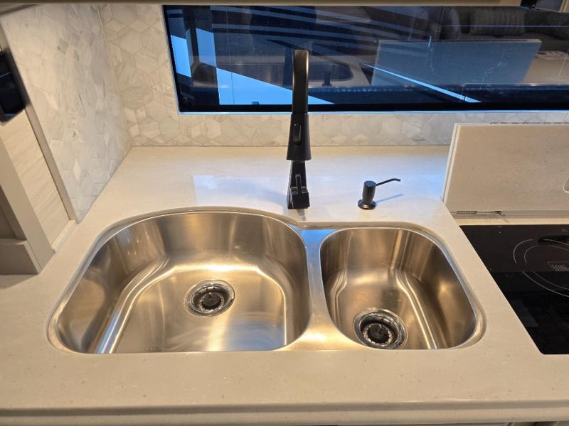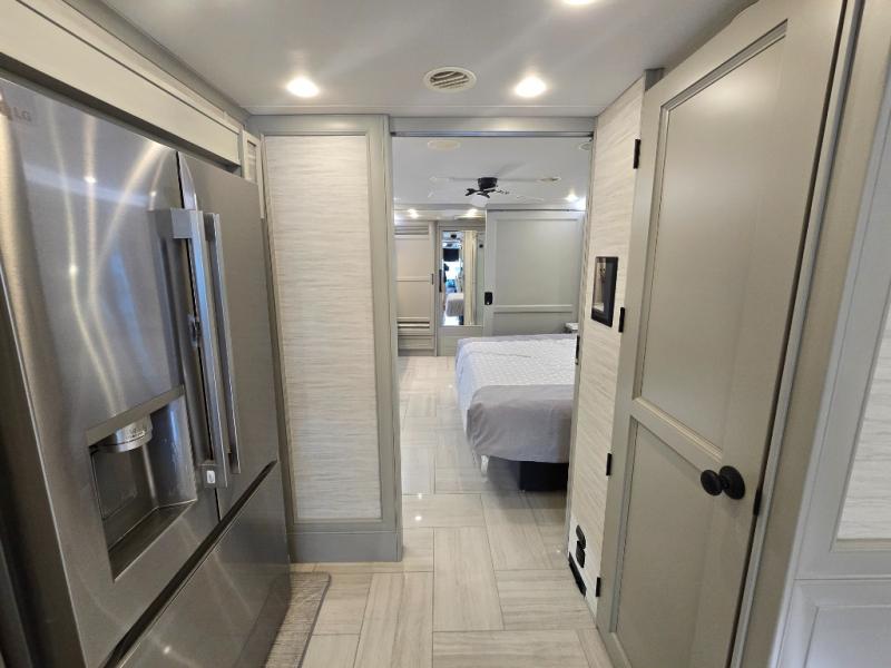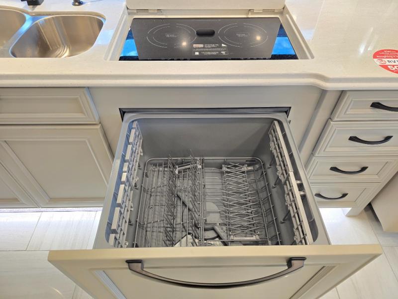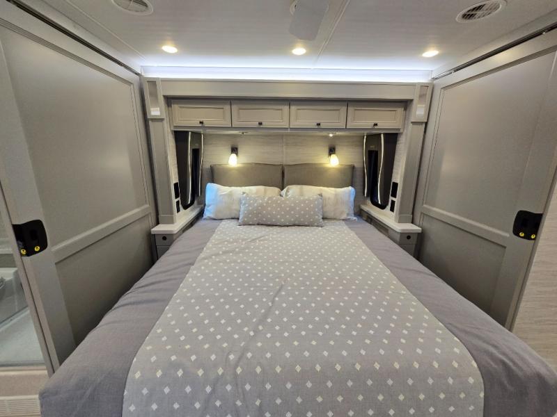 You will feel right at home in this coach with a master suite and king bed slide, mounted TV, laundry hamper, and stacked drawers. You all have quick access to the full rear bathroom. The bathroom not only has a dual sink vanity with a tri-view mirror for two to get ready at once, but also a shower with a seat and a large closet with an area next to it prepped to add an optional washer and dryer. The chef can prepare their best meals either indoors with the countertop extension and cooktop with convection microwave or outside if you add the optional outdoor grill. You can even watch the big game outside with the exterior TV with a sound bar!