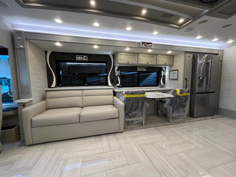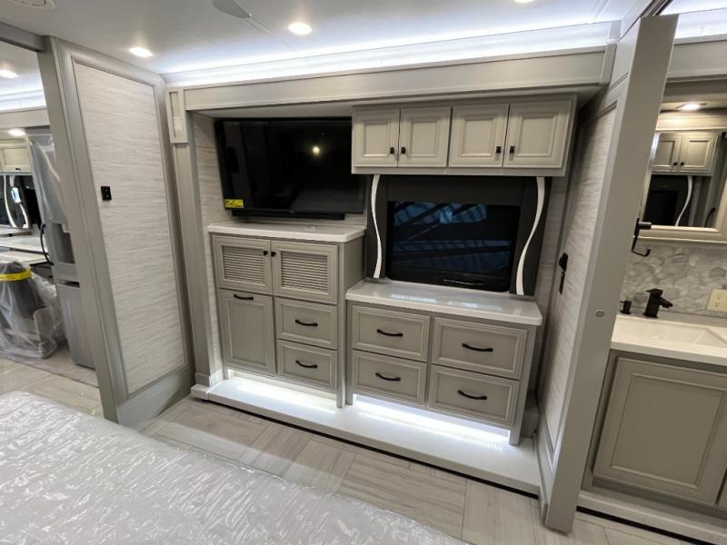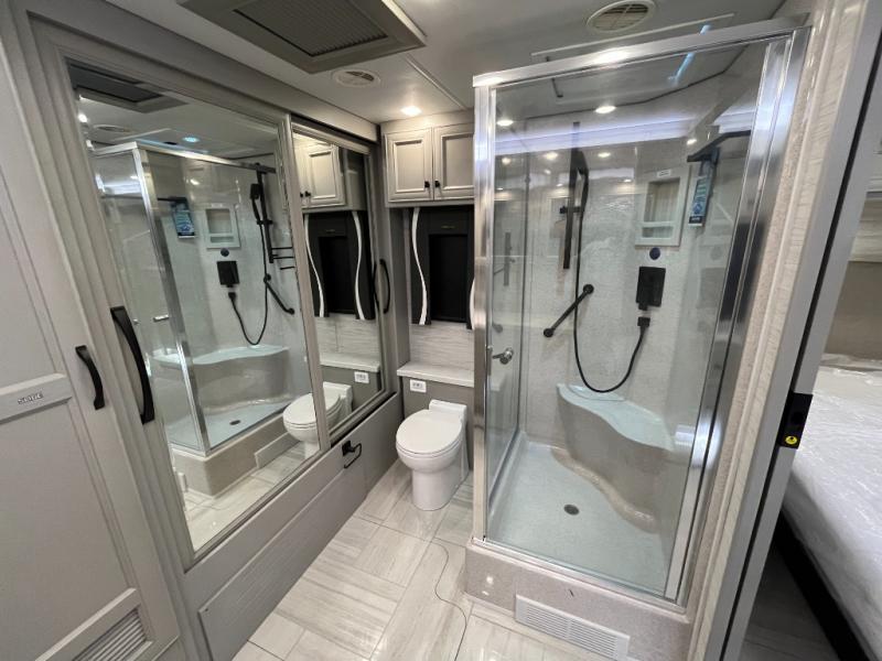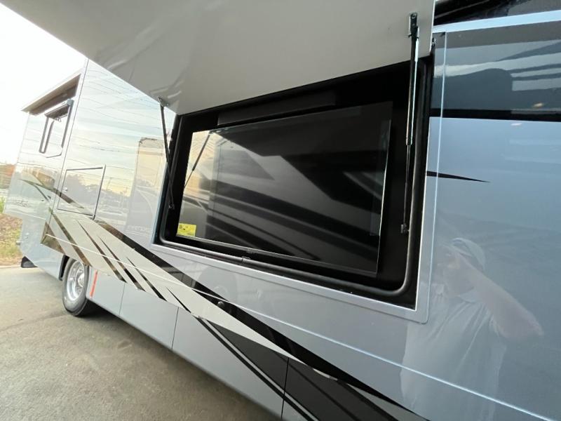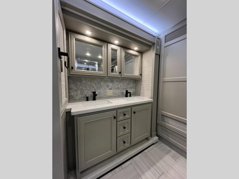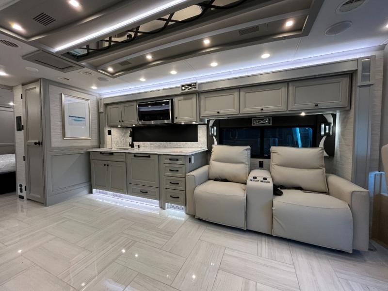 You will feel right at home in this coach with a master suite and king bed slide, mounted TV, laundry hamper, and stacked drawers. You all have quick access to the full rear bathroom. The bathroom not only has a dual sink vanity with a tri-view mirror for two to get ready at once, but also a shower with a seat and a large closet with an area next to it prepped to add an optional washer and dryer. The chef can prepare their best meals either indoors with the countertop extension and cooktop with convection microwave or outside if you add the optional outdoor grill. You can even watch the big game outside with the exterior TV with a sound bar!
