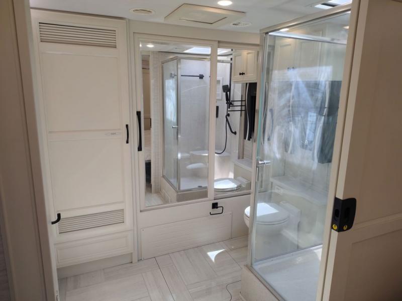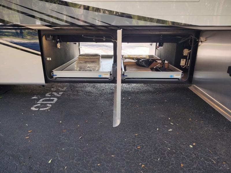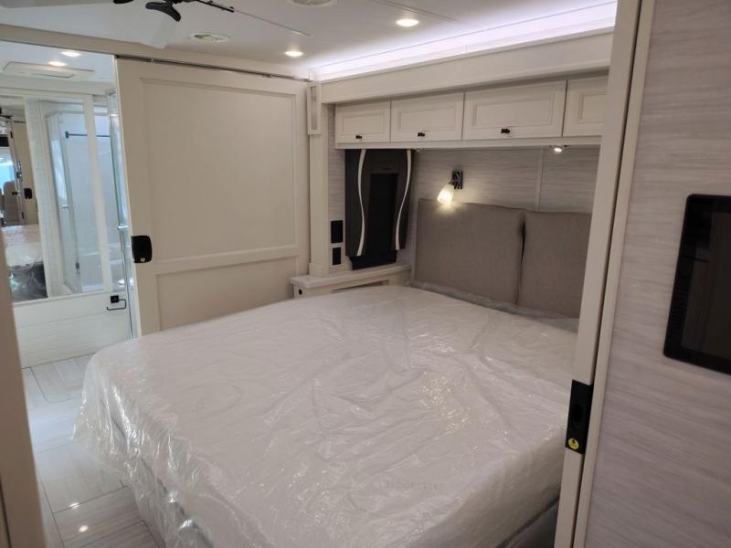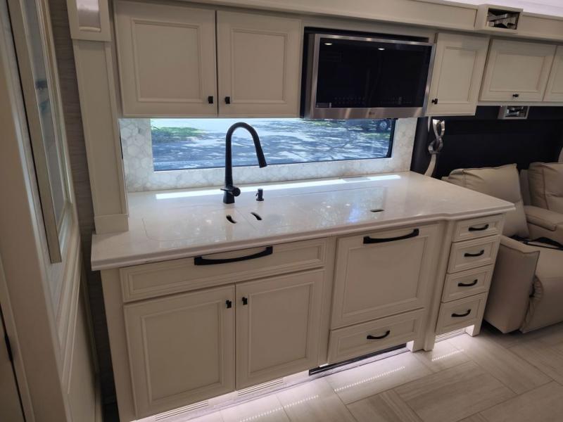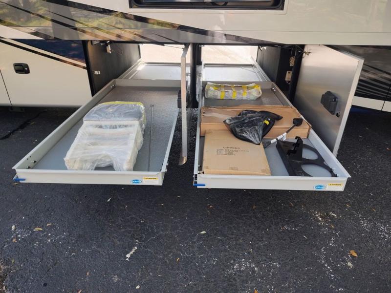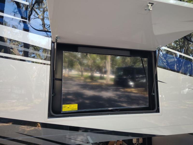 You will feel right at home in this coach with a master suite and king bed slide, mounted TV, laundry hamper, and stacked drawers. You all have quick access to the full rear bathroom. The bathroom not only has a dual sink vanity with a tri-view mirror for two to get ready at once, but also a shower with a seat and a large closet with an area next to it prepped to add an optional washer and dryer. The chef can prepare their best meals either indoors with the countertop extension and cooktop with convection microwave or outside if you add the optional outdoor grill. You can even watch the big game outside with the exterior TV with a sound bar!