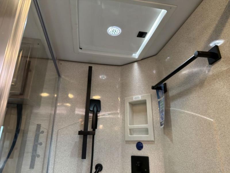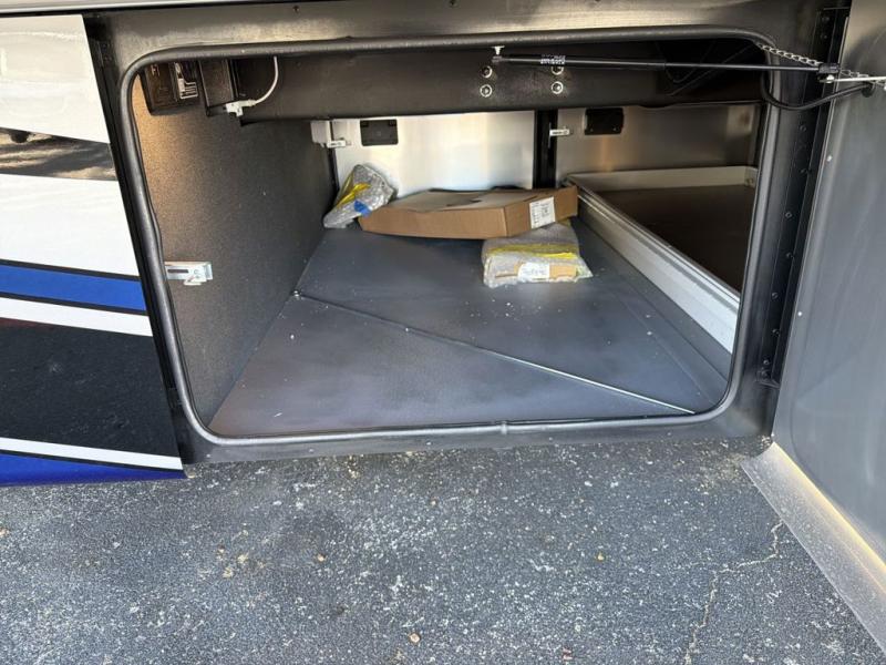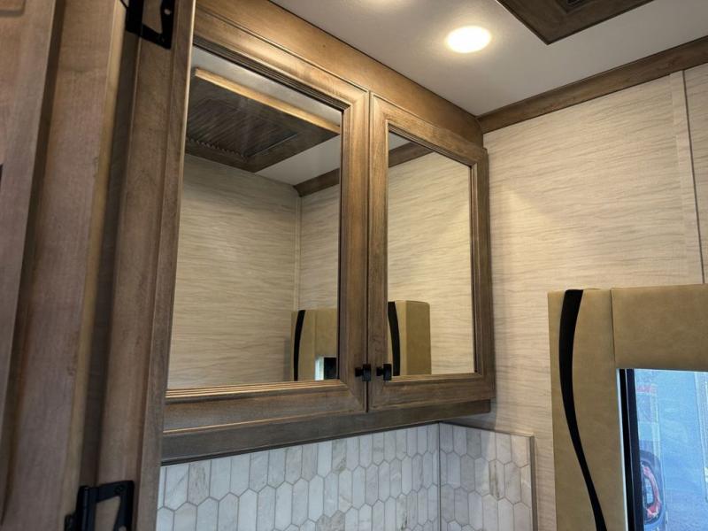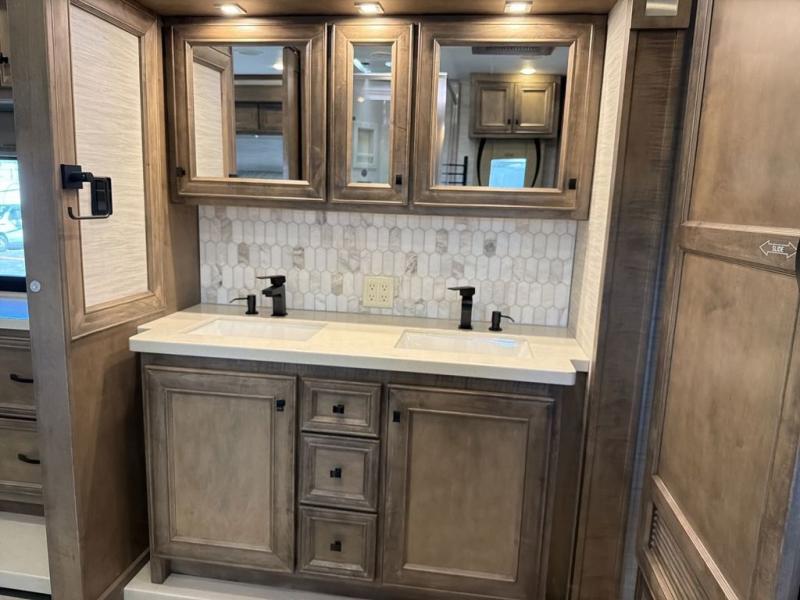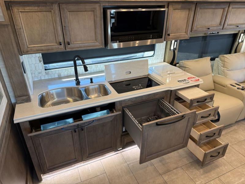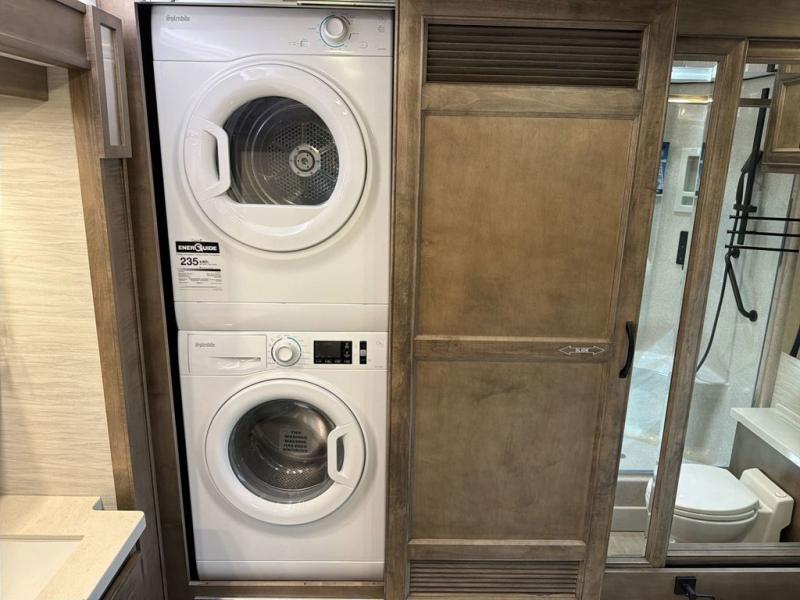 You will feel right at home in this coach with a master suite and king bed slide, mounted TV, laundry hamper, and stacked drawers. You all have quick access to the full rear bathroom. The bathroom not only has a dual sink vanity with a tri-view mirror for two to get ready at once, but also a shower with a seat and a large closet with an area next to it prepped to add an optional washer and dryer. The chef can prepare their best meals either indoors with the countertop extension and cooktop with convection microwave or outside if you add the optional outdoor grill. You can even watch the big game outside with the exterior TV with a sound bar!