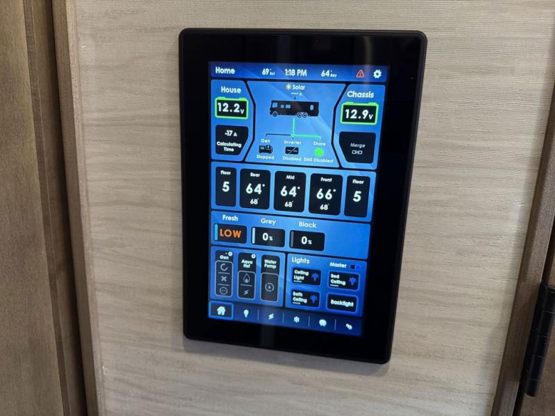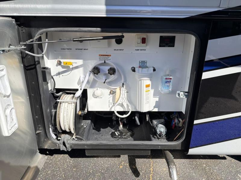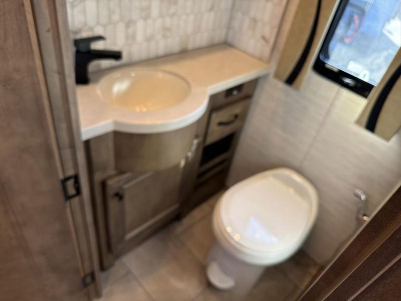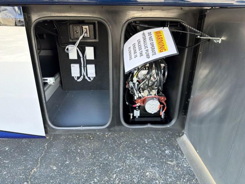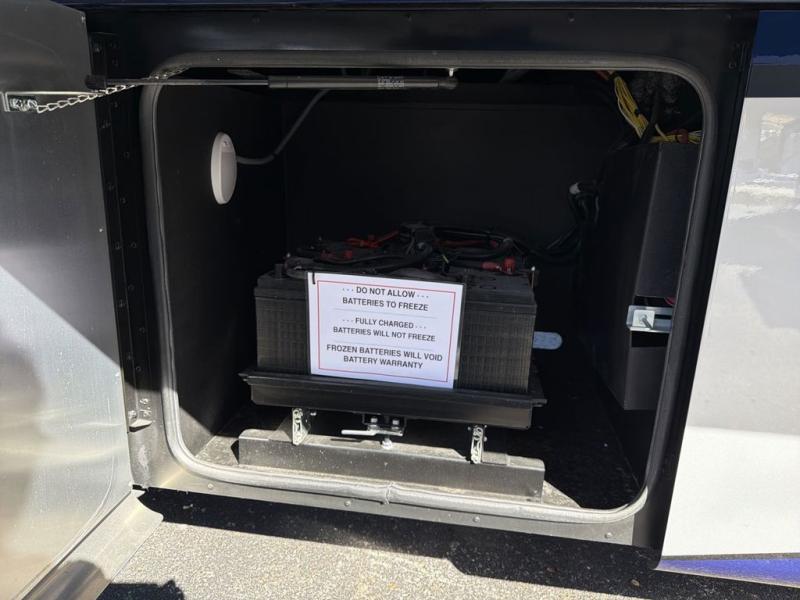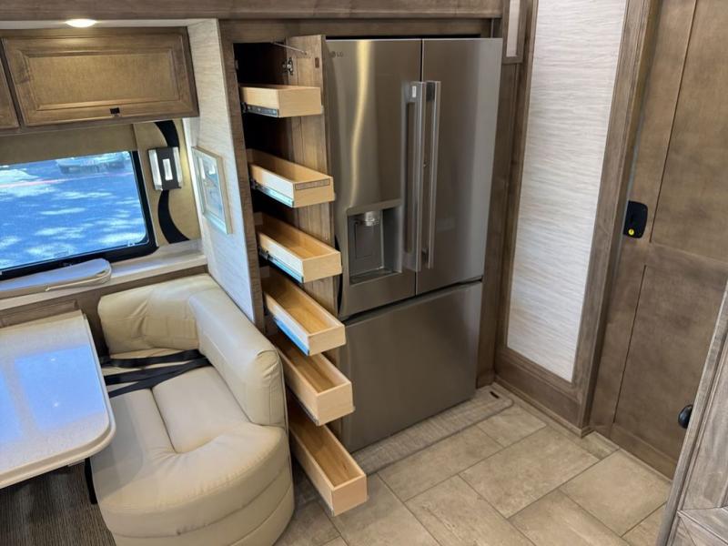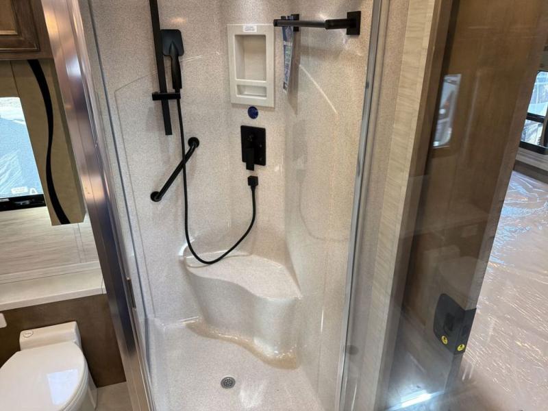 You will feel right at home in this coach with a master suite and king bed slide, mounted TV, laundry hamper, and stacked drawers. You all have quick access to the full rear bathroom. The bathroom not only has a dual sink vanity with a tri-view mirror for two to get ready at once, but also a shower with a seat and a large closet with an area next to it prepped to add an optional washer and dryer. The chef can prepare their best meals either indoors with the countertop extension and cooktop with convection microwave or outside if you add the optional outdoor grill. You can even watch the big game outside with the exterior TV with a sound bar!