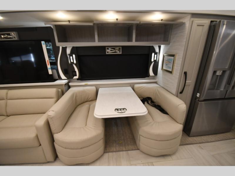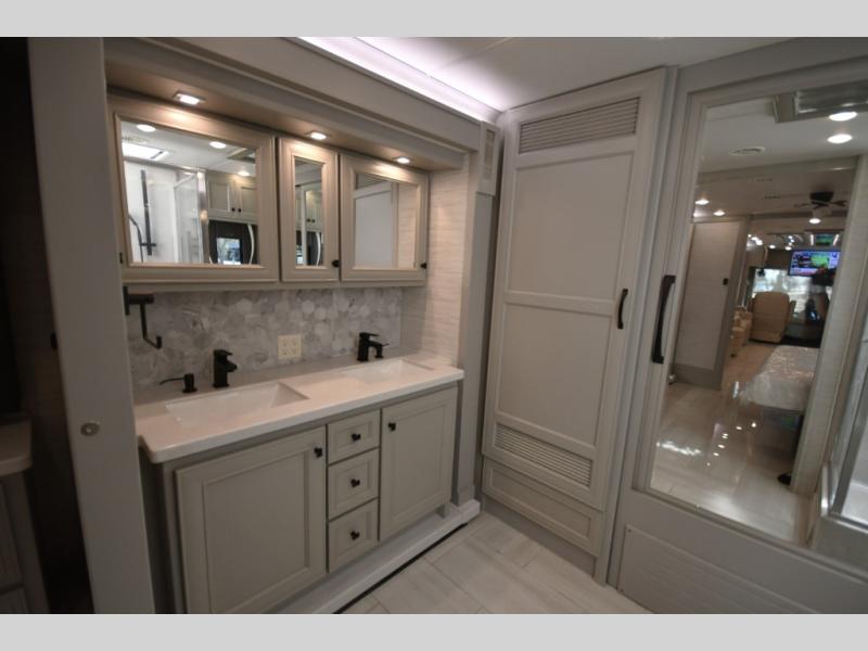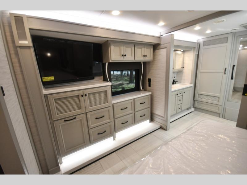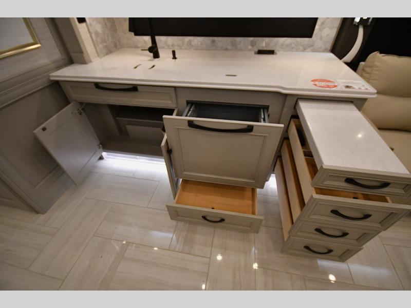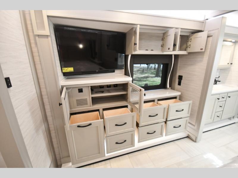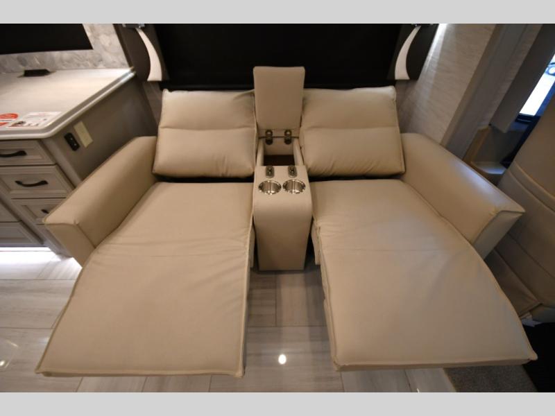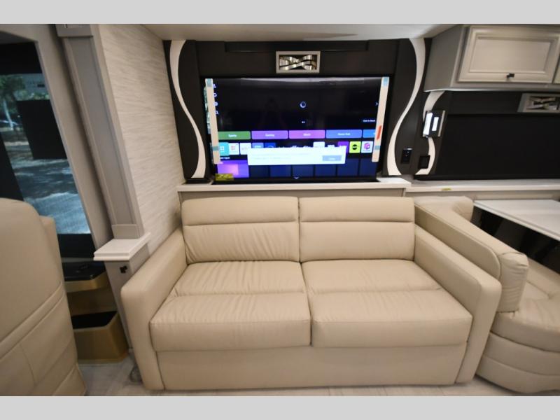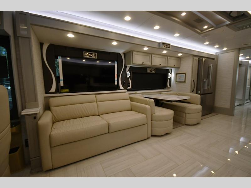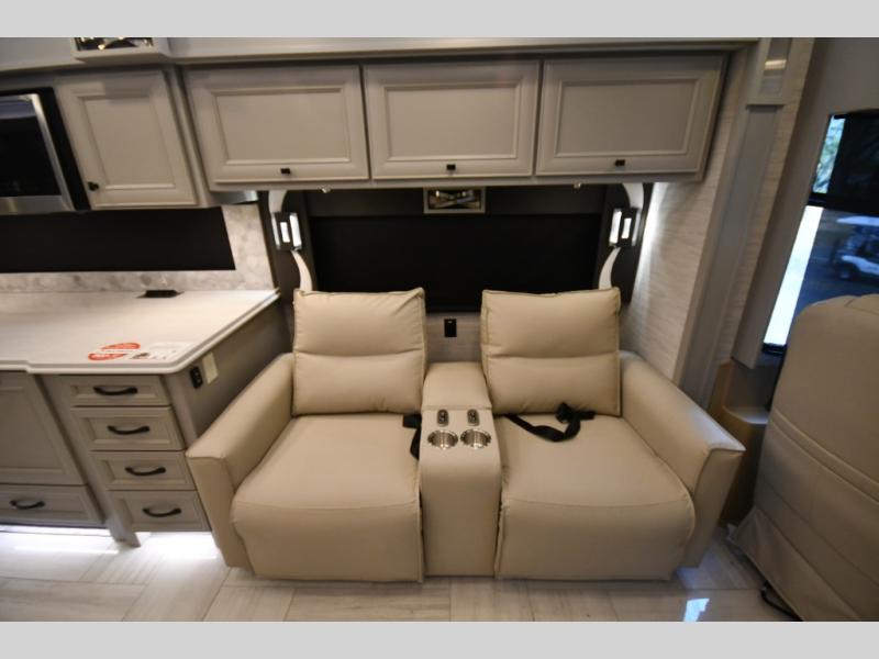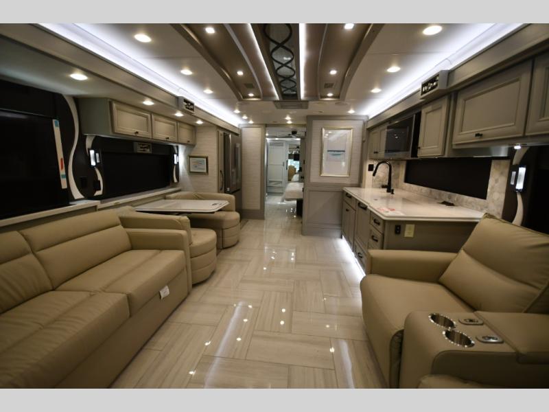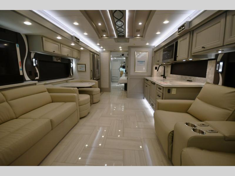 Step inside and discover a beautifully appointed interior crafted for extended travel and upscale living. The 40 IH floorplan features four slide-outs that create an expansive living space, complete with premium furnishings, polished tile flooring, and residential-style finishes throughout. Relax on plush seating while enjoying the large entertainment system, or host guests in a living area designed with comfort and elegance in mind.
