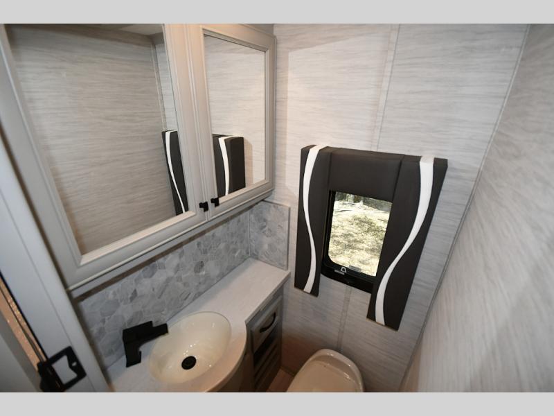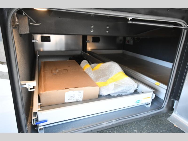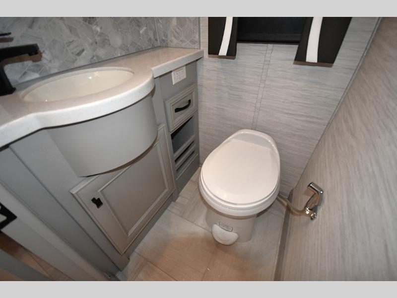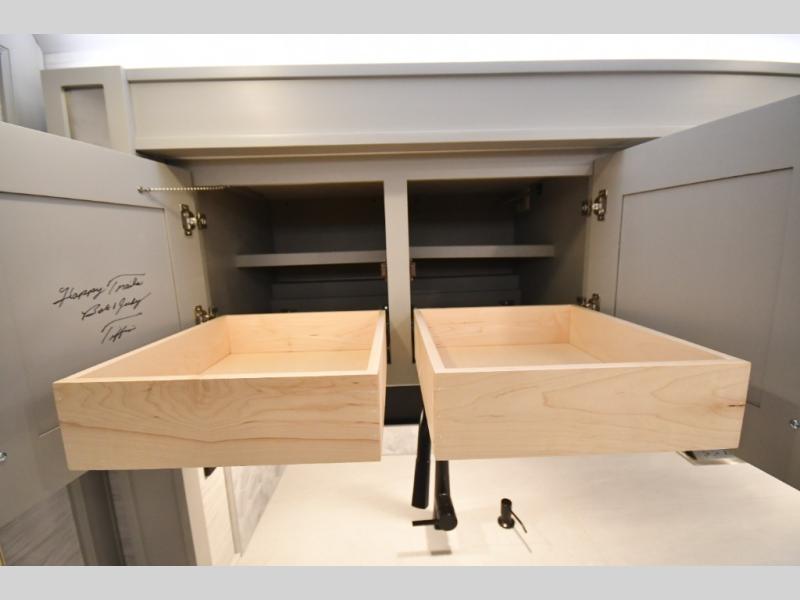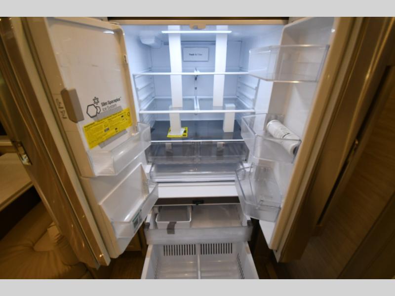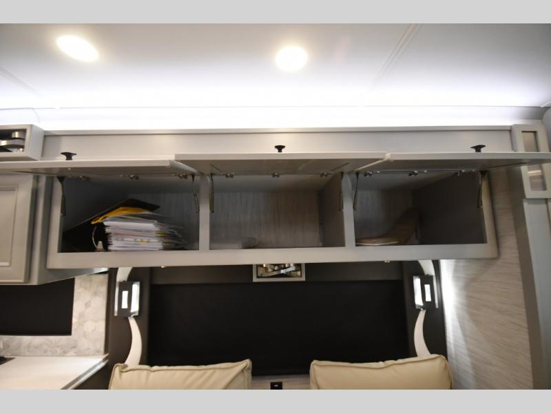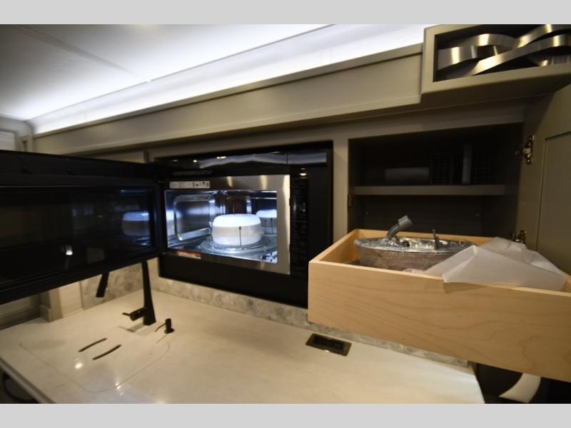 The gourmet kitchen is equipped for real cooking on the road, featuring solid-surface countertops, a residential refrigerator, induction cooktop, convection microwave, and generous storage. Whether you're preparing a quick breakfast or a full dinner after a day of exploring, the Phaeton makes every meal feel like home.