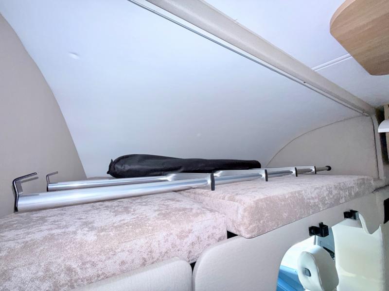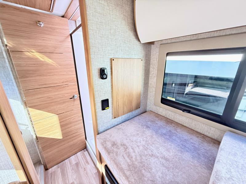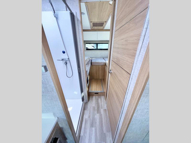Head out to explore whenever the mood hits you! This coach provides a comfortable and luxurious way to travel from the cab features to the sleeping accommodations. The driver and passenger will have a tray for smartphones with charging ports, heated/electric adjustable mirrors, heated seats, and they might like to add the side-view cameras option. You can dine at the tri-fold sofa after whipping up a meal using the kitchen appliances including a stainless steel convection microwave. The split bathroom includes a shower along one side and a private toilet and sink on the opposite so two people can get ready at the same time. At night, fall quickly to sleep on the rear twin beds which allow you easy access to the bathroom, plus the nightstand will come in handy to place your cellphones and drinks. You will also find overhead cabinets for storage, and you might like to add an optional TV to watch.