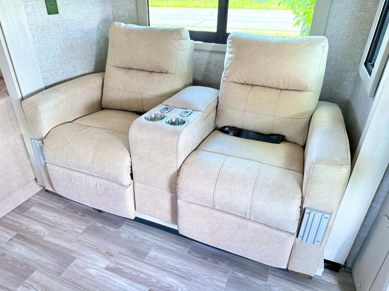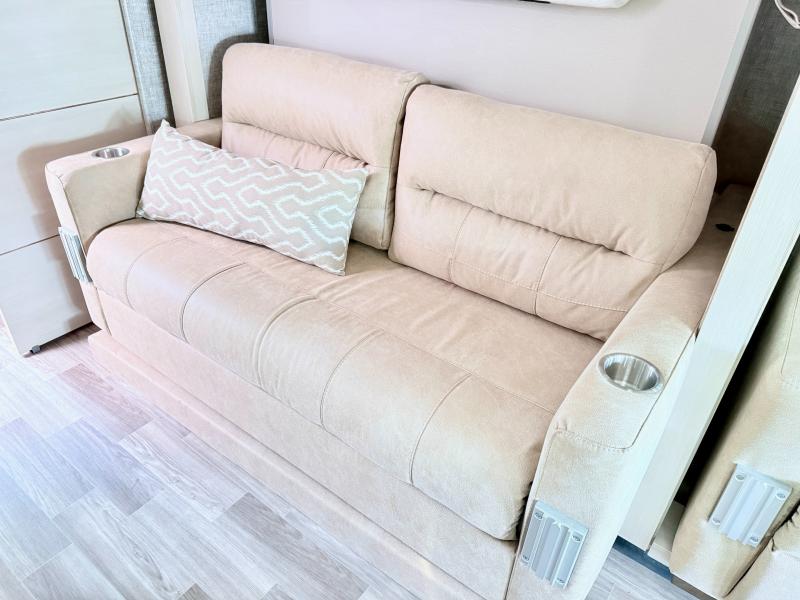 Travel with your favorite person, family, or some friends to see nature along the highways, up close and where ever the road takes you! You will find sleeping space for five with the bunk over the cab, the booth dinette-sleeper, and the versatile queen-size Murphy bed and sofa combo! The rear full bathroom gives you privacy, and the galley kitchen lets you make meals on the two burner cooktop and convection microwave oven. You might like to add a few options to customize your coach such as optional theater seating, or a tri-fold sofa in place of the dinette, a central vacuum system, an overhead entertainment center in place of the bunk, and/or an exterior TV to enjoy under the awning.