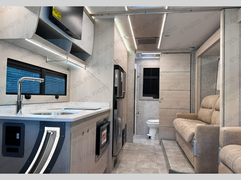 Travel with your favorite person, family, or some friends to see nature along the highways, up close and where ever the road takes you! You will find sleeping space for five with the bunk over the cab, the booth dinette-sleeper, and the versatile queen-size Murphy bed and sofa combo! The rear full bathroom gives you privacy, and the galley kitchen lets you make meals on the two burner cooktop and convection microwave oven. You might like to add a few options to customize your coach such as optional theater seating, or a tri-fold sofa in place of the dinette, a central vacuum system, an overhead entertainment center in place of the bunk, and/or an exterior TV to enjoy under the awning.