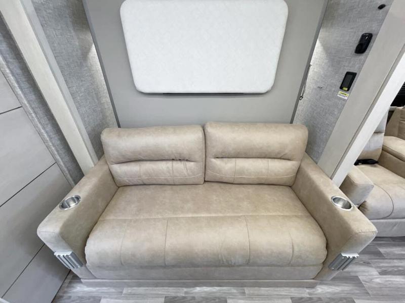 Travel with your favorite person, family, or some friends to see nature along the highways, up close and where ever the road takes you! You will find sleeping space for five with the bunk over the cab, the booth dinette-sleeper, and the versatile queen-size Murphy bed and sofa combo! The rear full bathroom gives you privacy, and the galley kitchen lets you make meals on the two burner cooktop and convection microwave oven. You might like to add a few options to customize your coach such as optional theater seating, or a tri-fold sofa in place of the dinette, a central vacuum system, an overhead entertainment center in place of the bunk, and/or an exterior TV to enjoy under the awning.