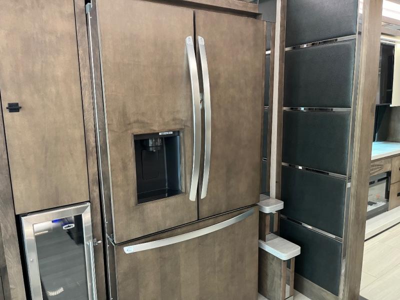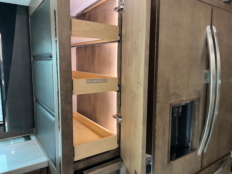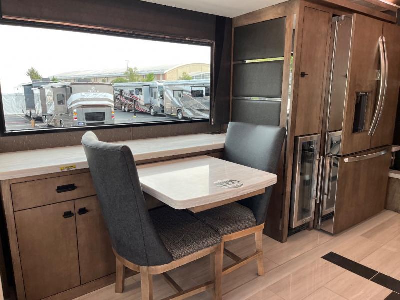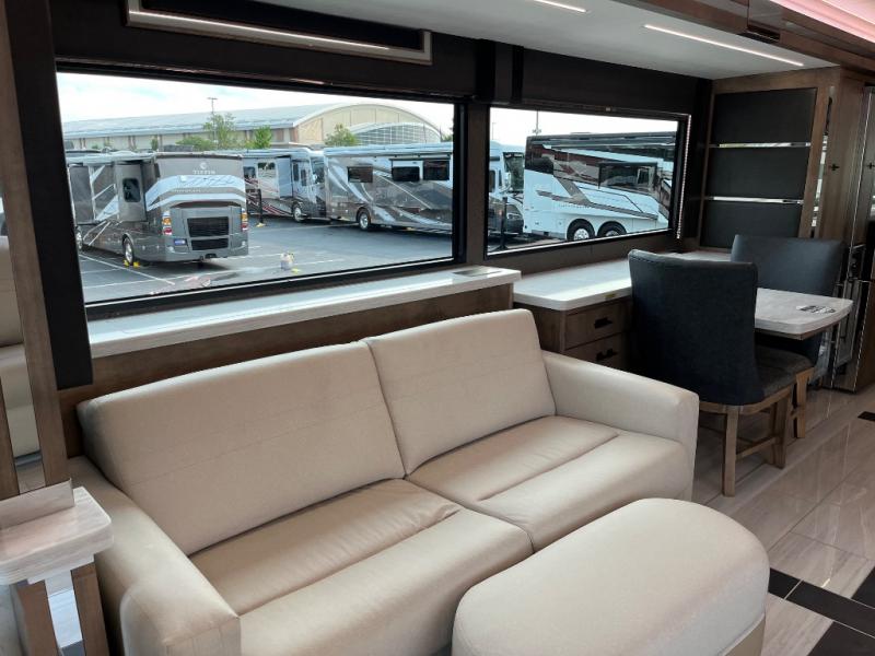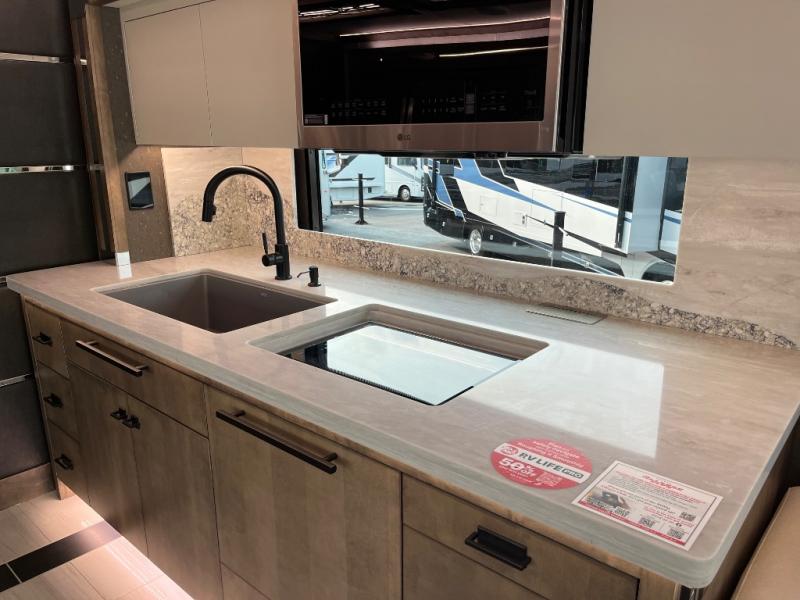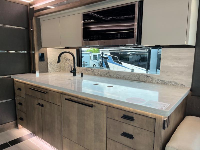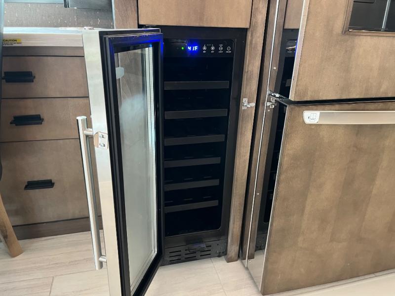 Touring the country is easier than ever in this spacious coach with four slides! Once you stop for the day, you can make lunch in the full kitchen that includes a Wolf induction cooktop, drawer-style dishwasher, smart convection microwave, and a 22 cu. ft. stainless steel residential refrigerator with French doors and a bottom freezer. There is a dinette with chairs where you can dine together, plus two sofa beds and an ottoman with storage for throw blankets. The mid-coach half bath will be especially convenient when traveling with guests, and you'll find the full rear bath decked out with dual sinks, a tri-view mirror, and a floor-to-ceiling bath closet with shoe storage. There is even a stacked washer and dryer to make laundry day a breeze!