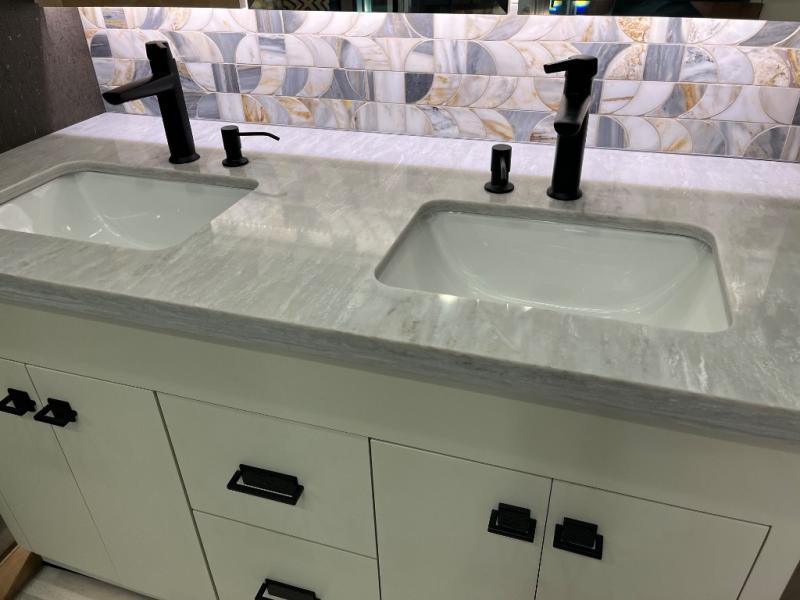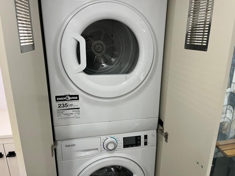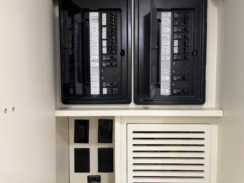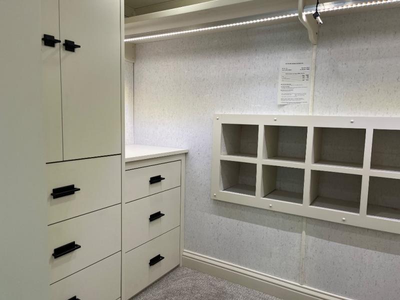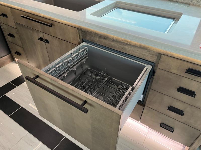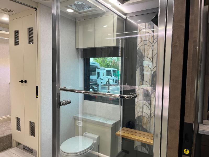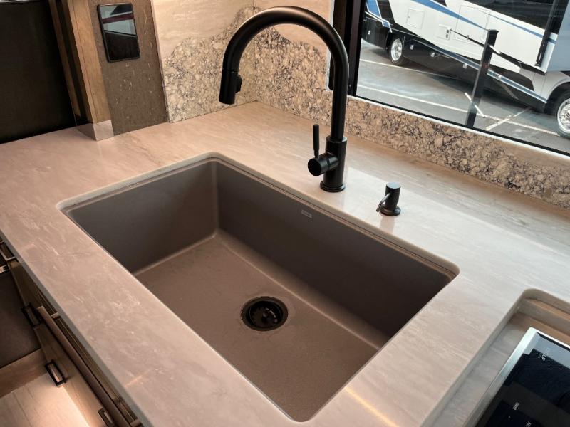 Touring the country is easier than ever in this spacious coach with four slides! Once you stop for the day, you can make lunch in the full kitchen that includes a Wolf induction cooktop, drawer-style dishwasher, smart convection microwave, and a 22 cu. ft. stainless steel residential refrigerator with French doors and a bottom freezer. There is a dinette with chairs where you can dine together, plus two sofa beds and an ottoman with storage for throw blankets. The mid-coach half bath will be especially convenient when traveling with guests, and you'll find the full rear bath decked out with dual sinks, a tri-view mirror, and a floor-to-ceiling bath closet with shoe storage. There is even a stacked washer and dryer to make laundry day a breeze!