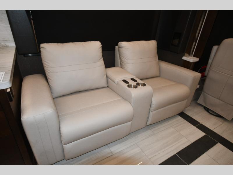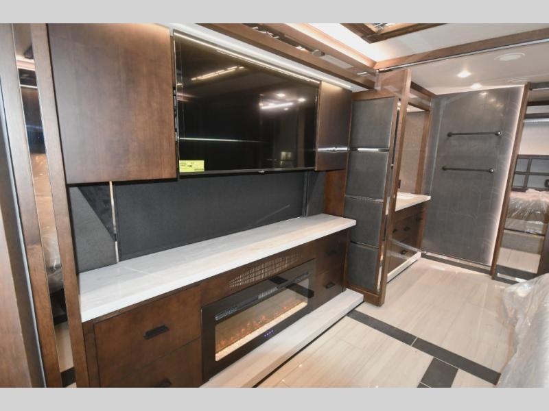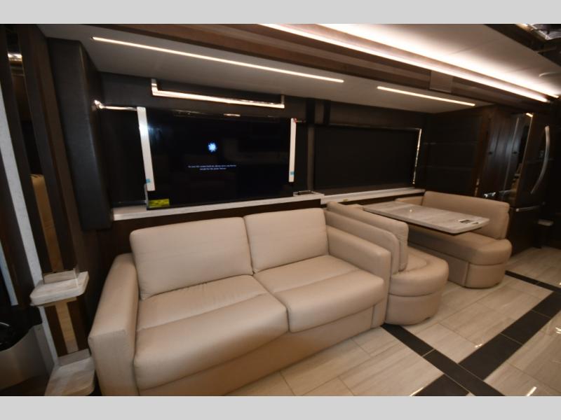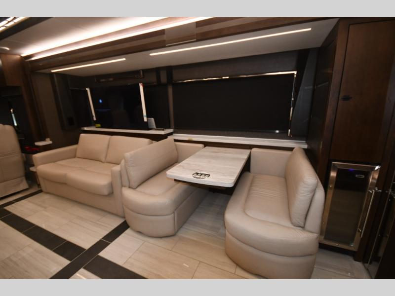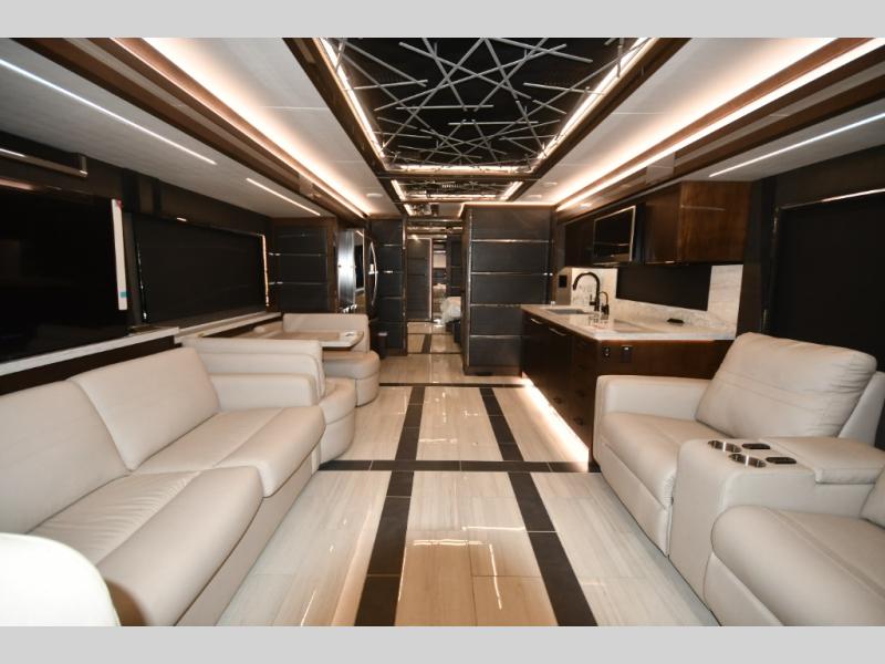 The 45 PZ floorplan offers expansive living space with multiple slide-outs, creating an open-concept design perfect for extended travel or full-time RV living.