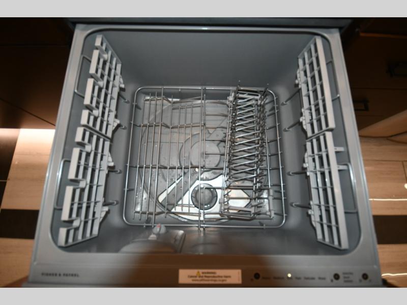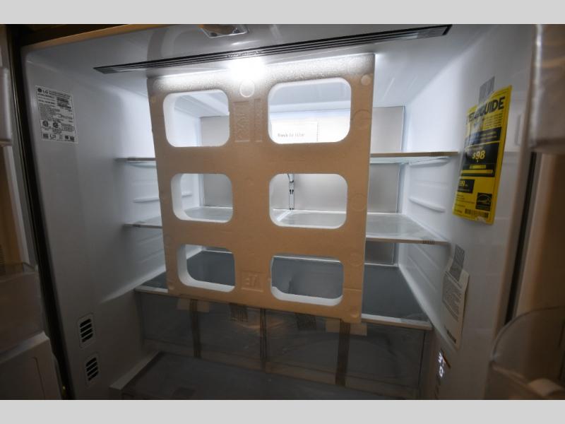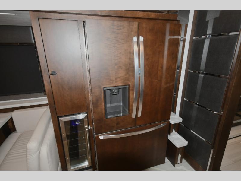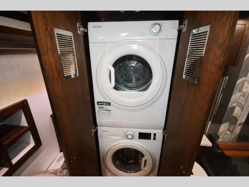 Touring the country is easier than ever in this spacious coach with four slides! Once you stop for the day, you can make lunch in the full kitchen that includes a Wolf induction cooktop, drawer-style dishwasher, smart convection microwave, and a 22 cu. ft. stainless steel residential refrigerator with French doors and a bottom freezer. There is a dinette with chairs where you can dine together, plus two sofa beds and an ottoman with storage for throw blankets. The mid-coach half bath will be especially convenient when traveling with guests, and you'll find the full rear bath decked out with dual sinks, a tri-view mirror, and a floor-to-ceiling bath closet with shoe storage. There is even a stacked washer and dryer to make laundry day a breeze!