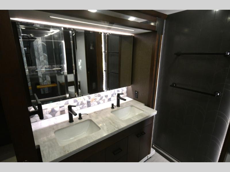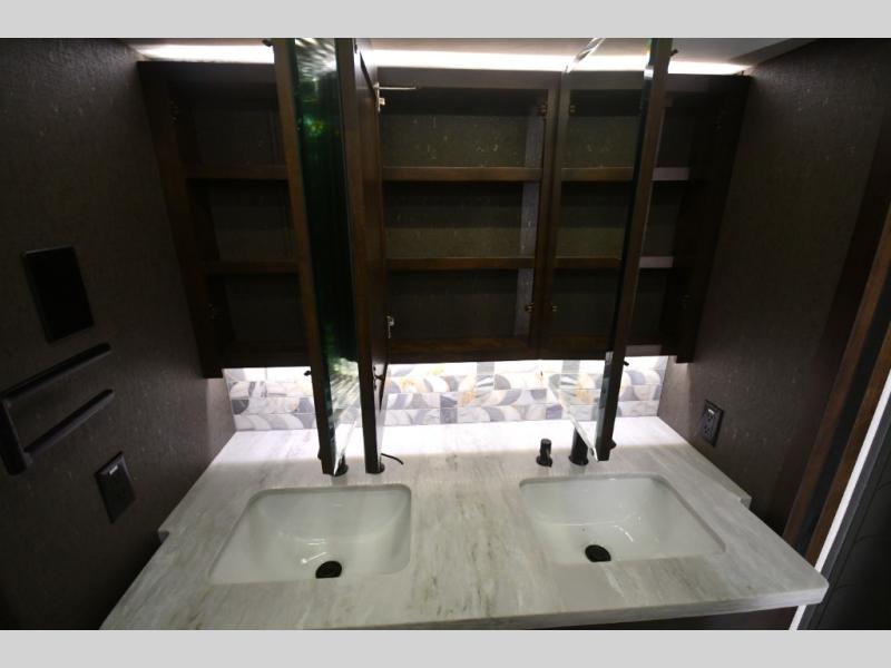 Dual bathroom sinks; dual sofa beds; pantry; residential fridge