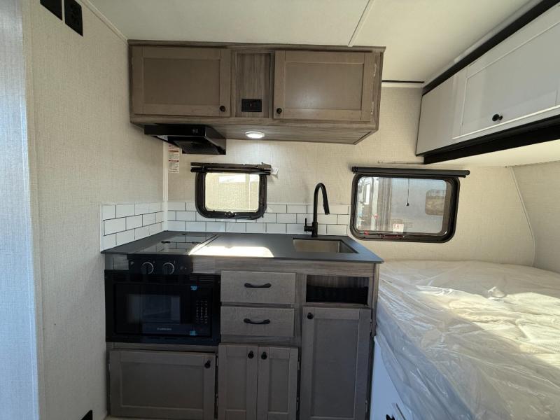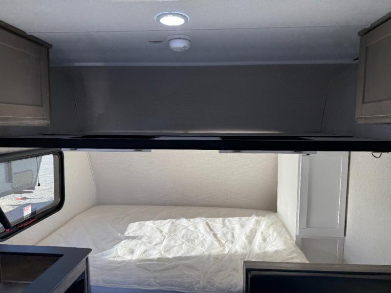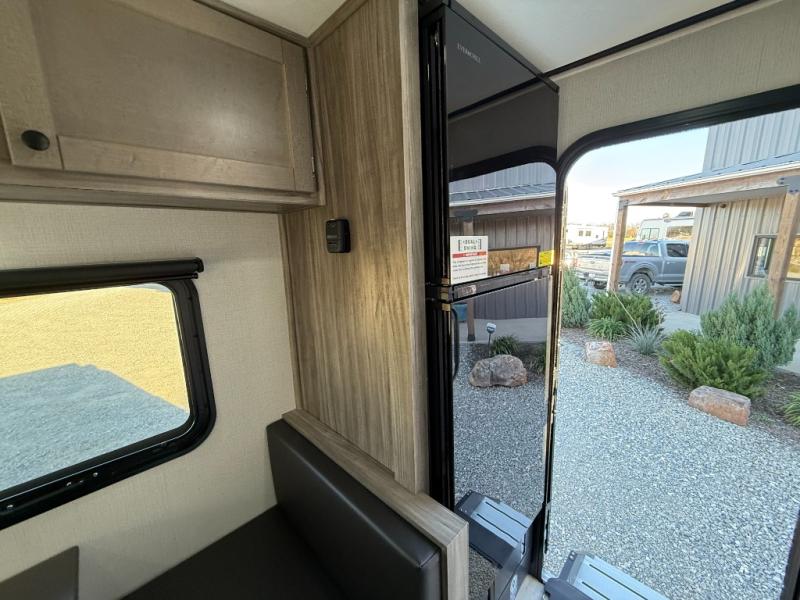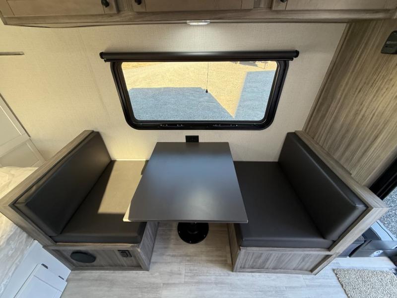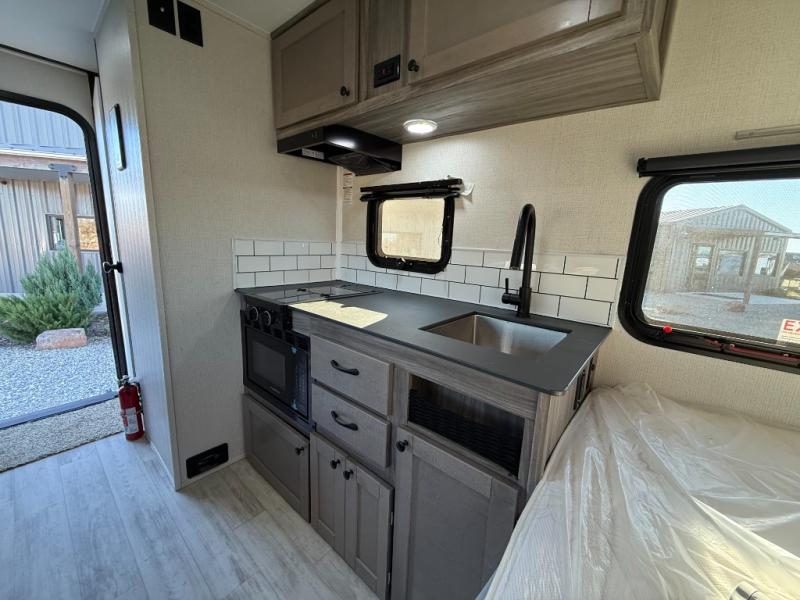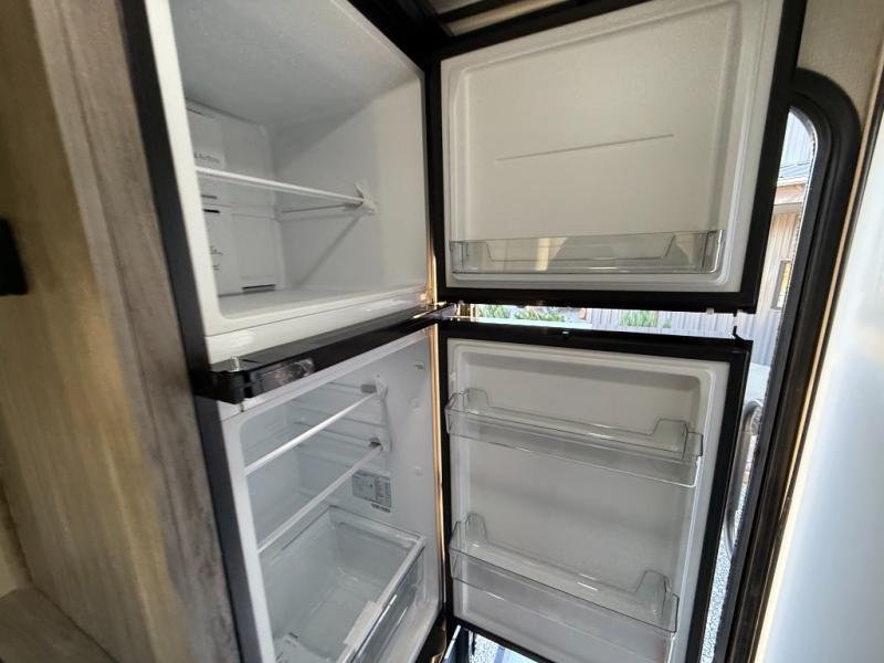 Camping trips just got a whole lot sweeter in this single axle travel trailer! You can comfortably sleep four between the front bed with a wall mounted bunk bed above plus the dinette with two seats. A two burner cooktop and an air fryer will let you make meals each day, and there is a 10.7 cu. ft. full-size Everchill 12V refrigerator to keep your cold items fresh. After you've made dinner and freshened up in the shower, head outdoor to relax under the patio awning!