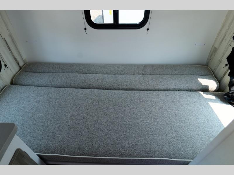 Head to the great outdoors in this travel trailer! Prepare a delicious home cooked meal with the two burner stainless steel stovetop, clean up the dishes in the single bowl stainless steel sink with high rise faucet, and store any leftovers in the 12V 3 cu. ft. refrigerator. The front dinette is great for eating meals, playing games, and transforming into a 54" x 74" bed for an extra sleeping space. The rear sofa can also transform into a 36" x 74" bed, and it has a overhead cabinet/bunk bed above it. The wet bathroom has a 12V power vent to eliminate any unwanted steam. When you desire extra privacy, simply close the soft shades!