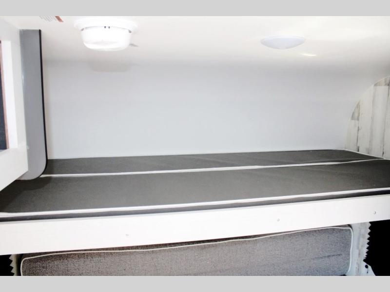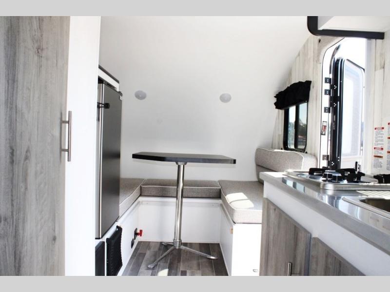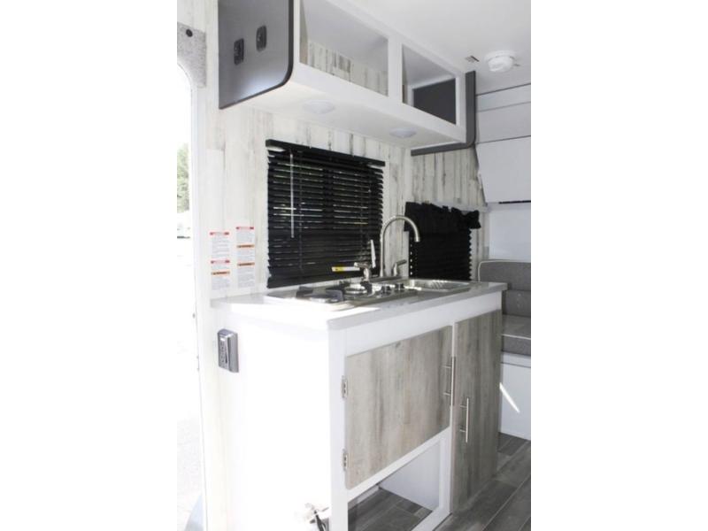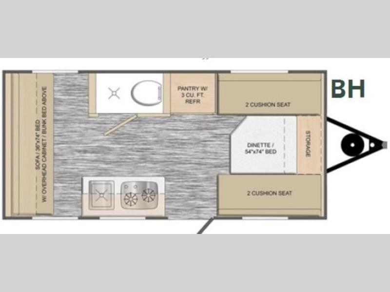 Head to the great outdoors in this travel trailer! Prepare a delicious home cooked meal with the two burner stovetop, clean up the dishes in the single bowl sink, and store any leftovers in the 12V 3 cu. ft. refrigerator. The front dinette is great for eating meals, playing games, and transforming into a 54" x 74" bed for an extra sleeping space. The rear sofa can also transform into a 36" x 74" bed, and it has a overhead cabinet/bunk bed above it. The wet bathroom has a 12V power vent to eliminate any unwanted steam. When you desire extra privacy, simply close the soft shades!