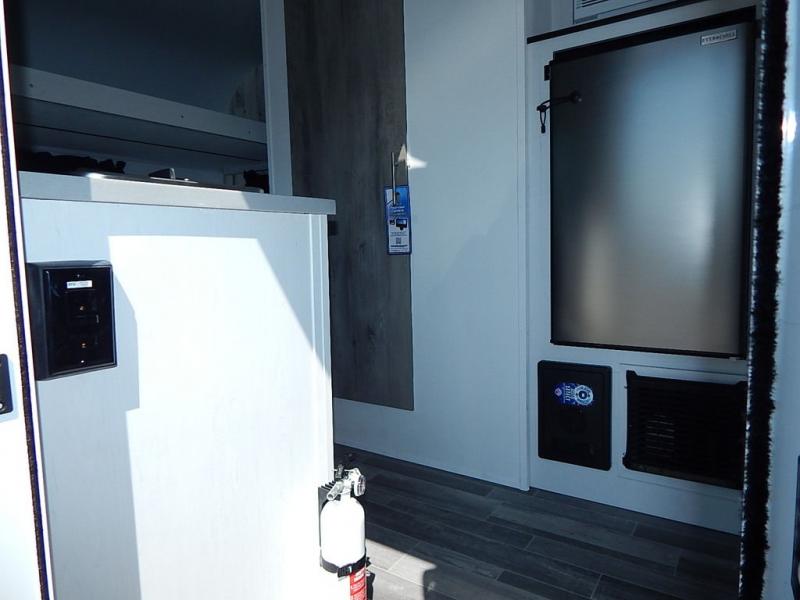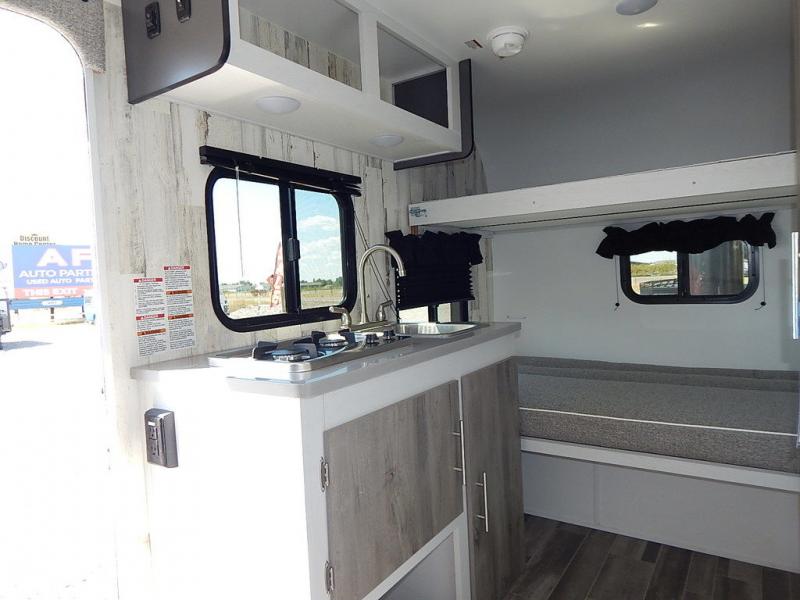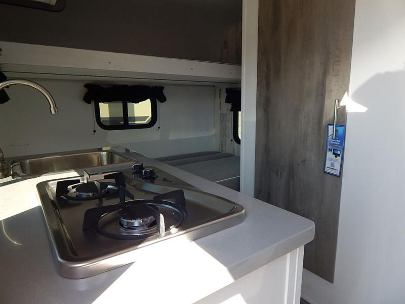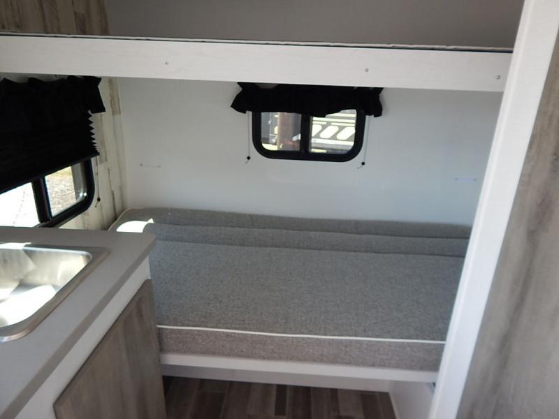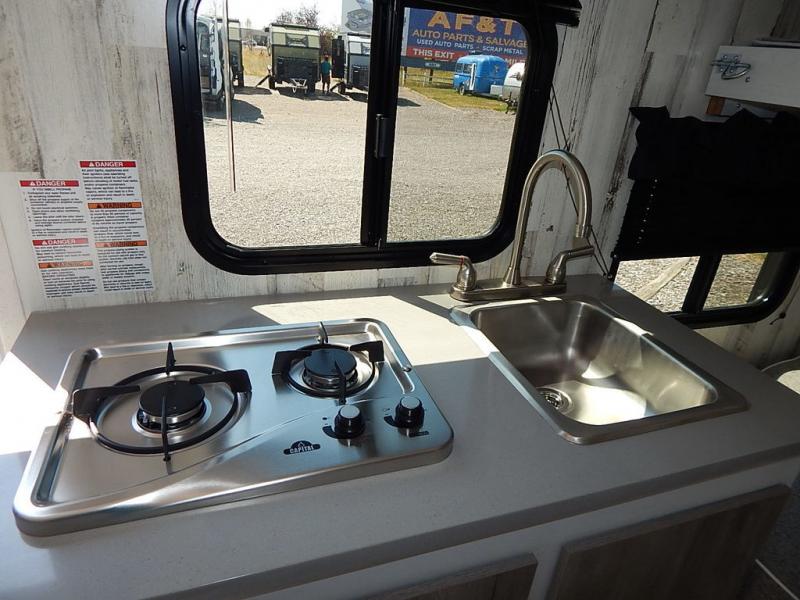 Head to the great outdoors in this travel trailer! Prepare a delicious home cooked meal with the two burner stovetop, clean up the dishes in the single bowl sink, and store any leftovers in the 12V 3 cu. ft. refrigerator. The front dinette is great for eating meals, playing games, and transforming into a 54" x 74" bed for an extra sleeping space. The rear sofa can also transform into a 36" x 74" bed, and it has a overhead cabinet/bunk bed above it. The wet bathroom has a 12V power vent to eliminate any unwanted steam. When you desire extra privacy, simply close the soft shades!