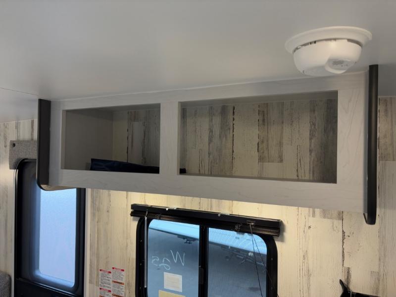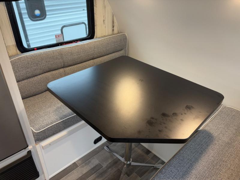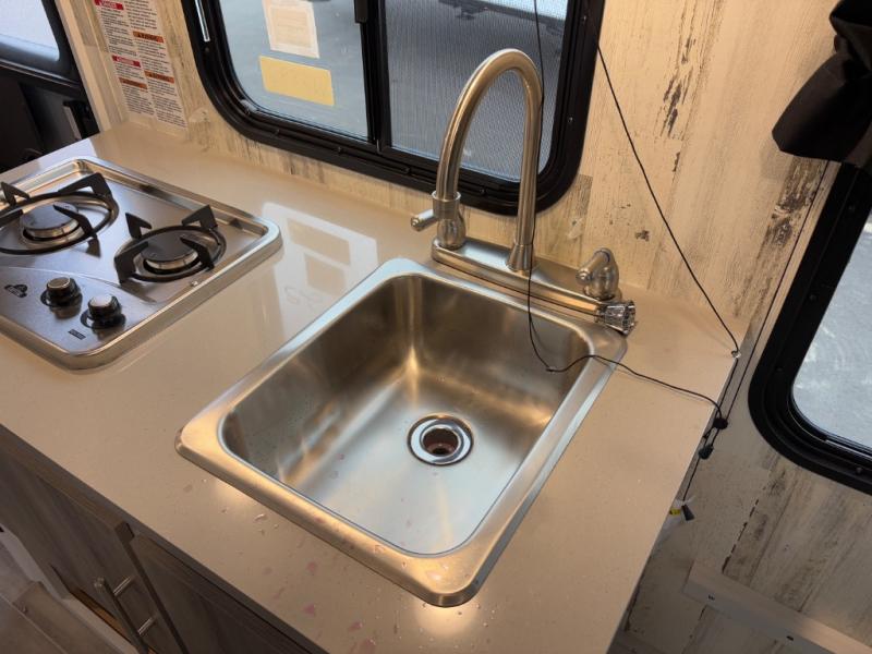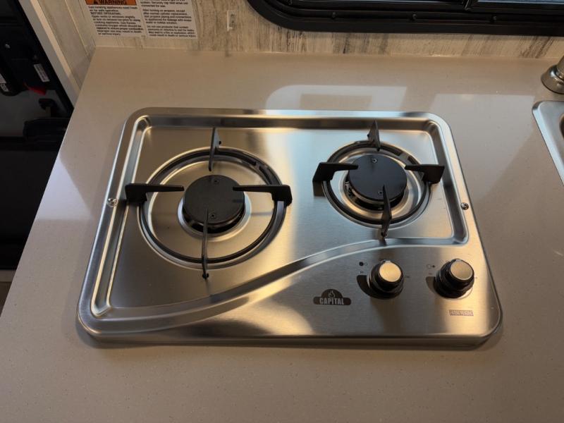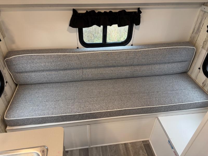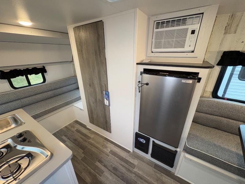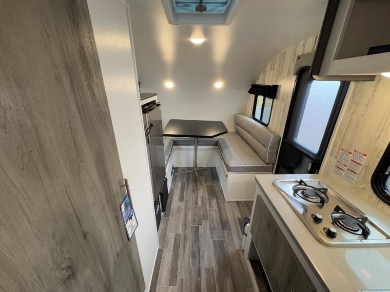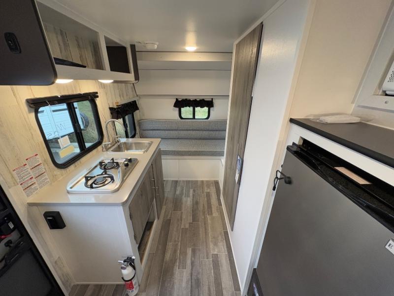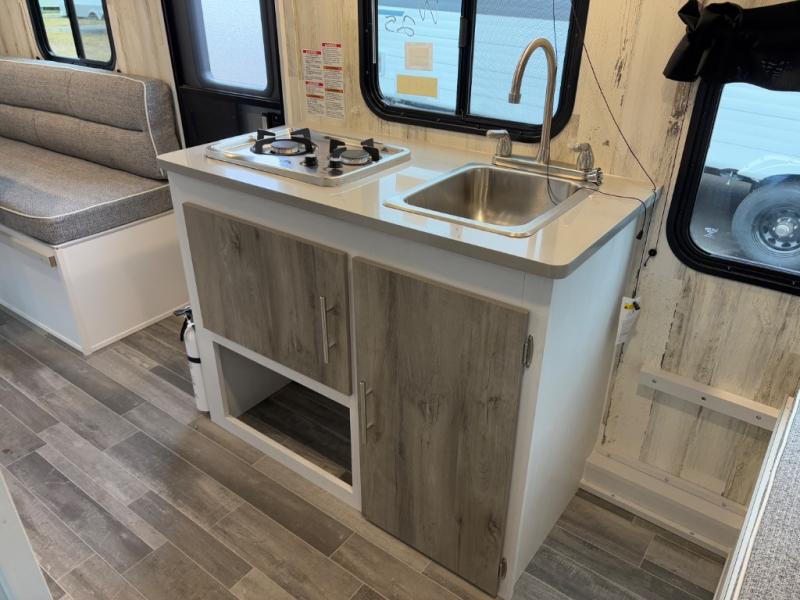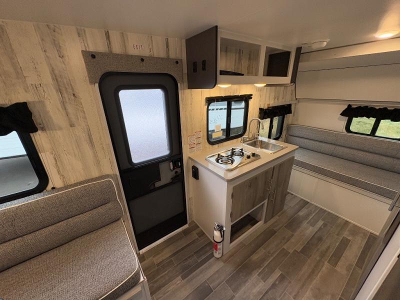 Head to the great outdoors in this travel trailer! Prepare a delicious home cooked meal with the two burner stovetop, clean up the dishes in the single bowl sink, and store any leftovers in the 12V 3 cu. ft. refrigerator. The front dinette is great for eating meals, playing games, and transforming into a 54" x 74" bed for an extra sleeping space. The rear sofa can also transform into a 36" x 74" bed, and it has a overhead cabinet/bunk bed above it. The wet bathroom has a 12V power vent to eliminate any unwanted steam. When you desire extra privacy, simply close the soft shades!