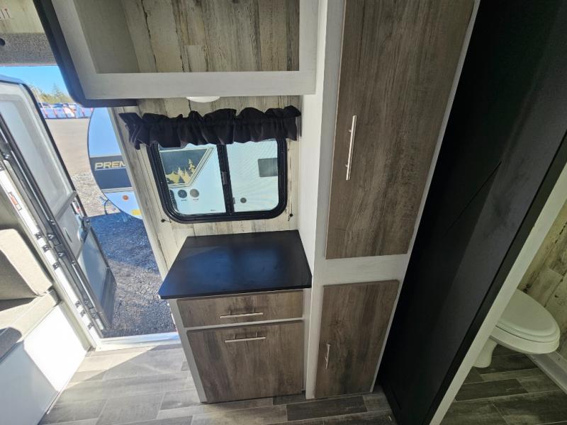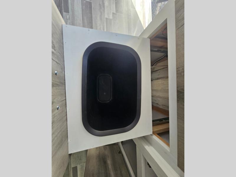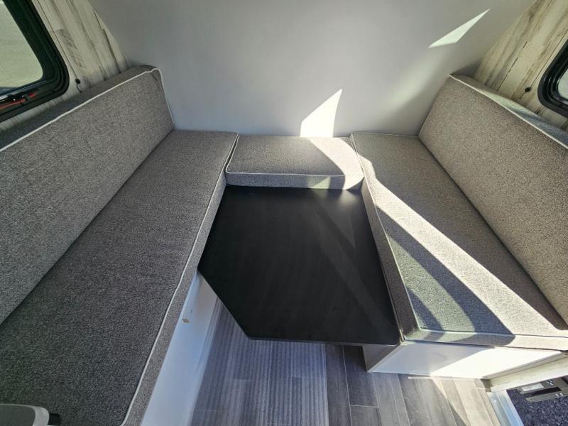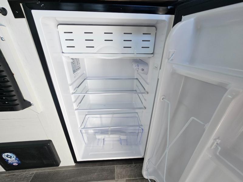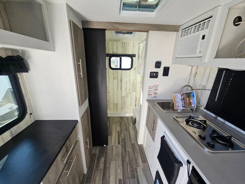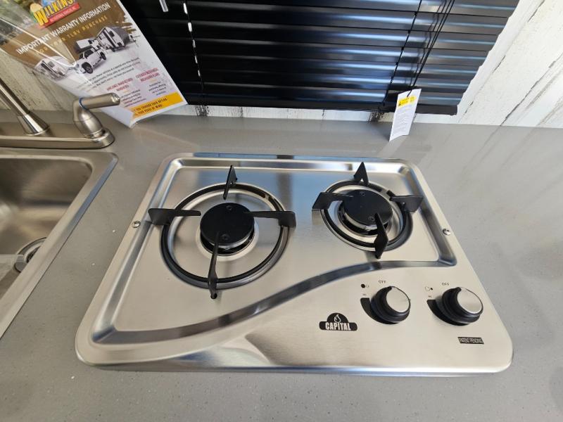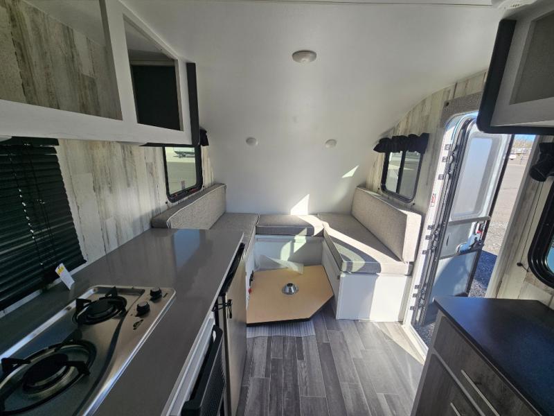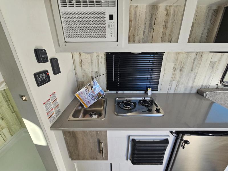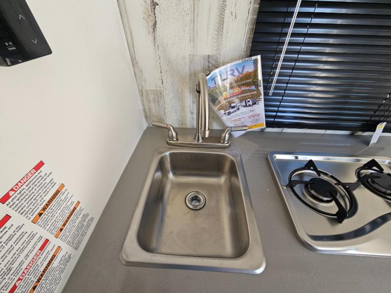 You won't believe all that is packed into this travel trailer! Prepare a delicious home cooked meal with the two burner stovetop, clean up the dishes in the 13" x 15" single bowl sink, and store any leftovers in the below the counter 12V 3 cu. ft. refrigerator, plus there is a trash can below additional countertop space next to the pantry. The front booth dinette is great for eating meals, playing games, and transforming into an extra sleeping space. There is shelving and overhead cabinets to store your items. The rear private bathroom has a 24" x 36" shower to freshen up in and a sliding barn door for privacy.