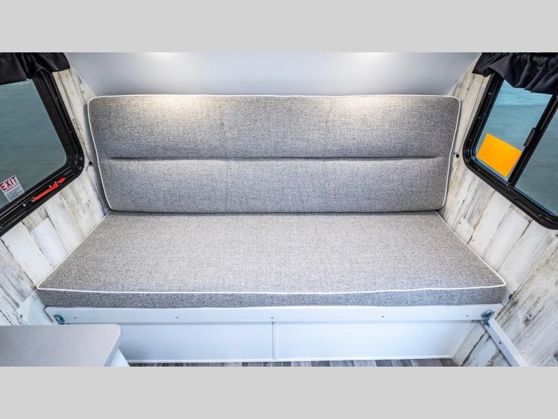 This travel trailer may be small in size, but it still packs in everything you will need for a fun camping trip! Prepare a delicious home cooked meal with the two burner stovetop, clean up the dishes in the single bowl sink, and store any leftovers in the 12V refrigerator. The booth dinette is great for eating meals, playing games, and transforming into an extra sleeping space. The front sofa/full bed can also be another sleeping space. There is shelving and overhead cabinets to store your items. The wet bathroom which has a 12V power vent to eliminate any unwanted steam.