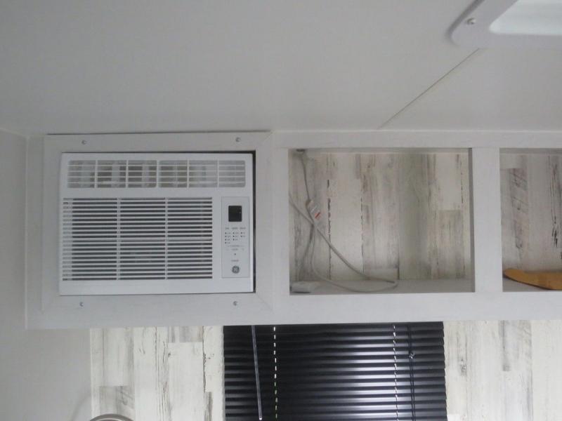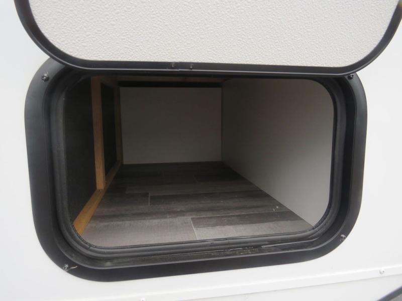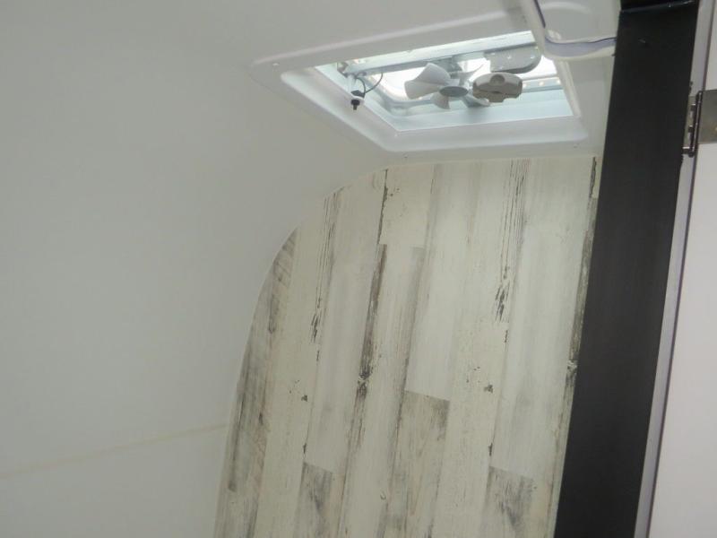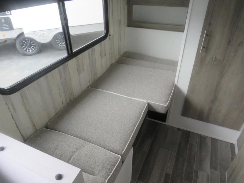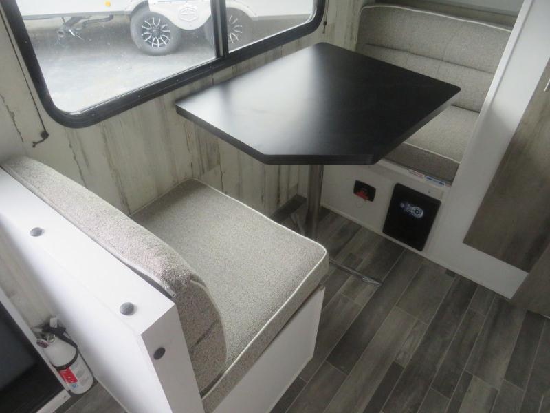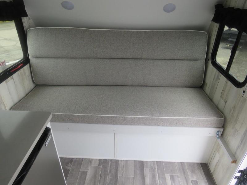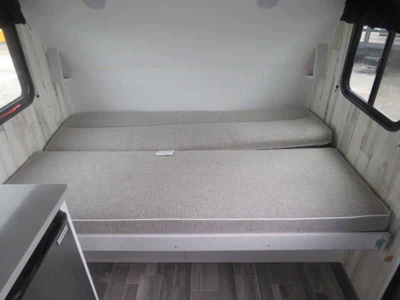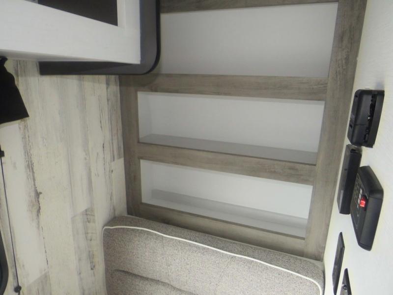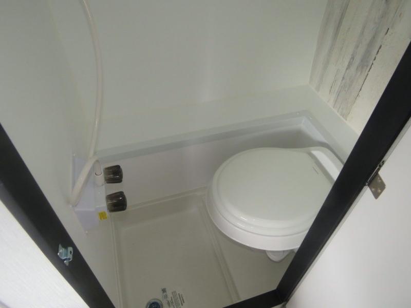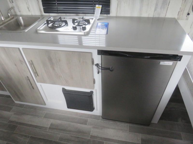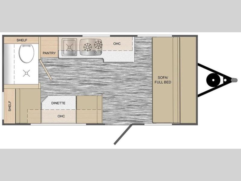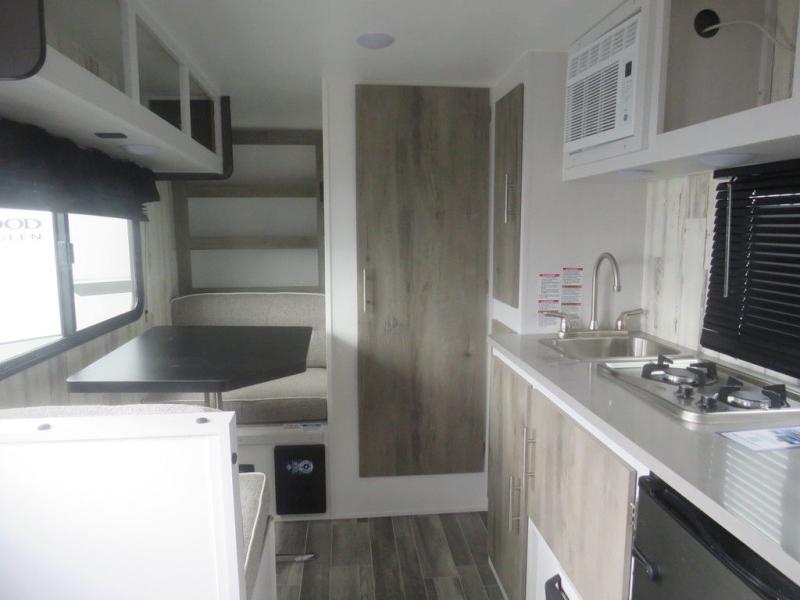 This travel trailer may be small in size, but it still packs in everything you will need for a fun camping trip! Prepare a delicious home cooked meal with the two burner stovetop, clean up the dishes in the single bowl sink, and store any leftovers in the 12V refrigerator. The booth dinette is great for eating meals, playing games, and transforming into an extra sleeping space. The front sofa/full bed can also be another sleeping space. There is shelving and overhead cabinets to store your items. The wet bathroom which has a 12V power vent to eliminate any unwanted steam.