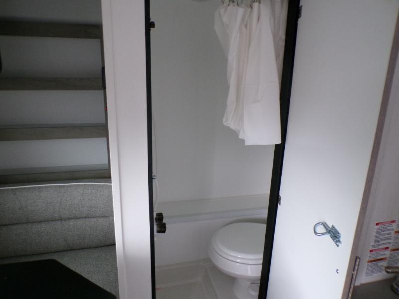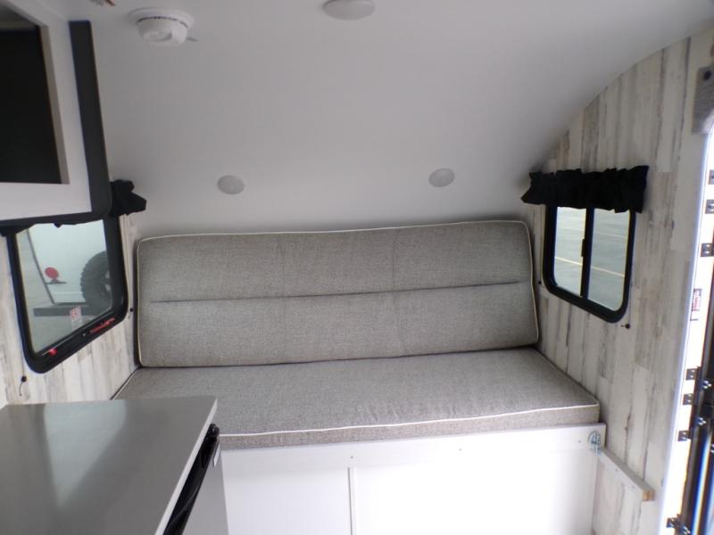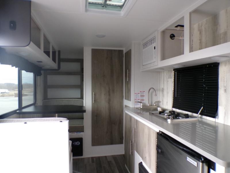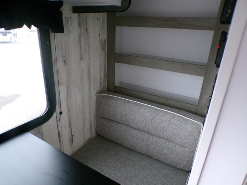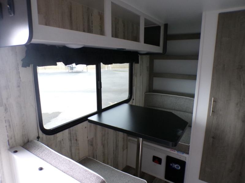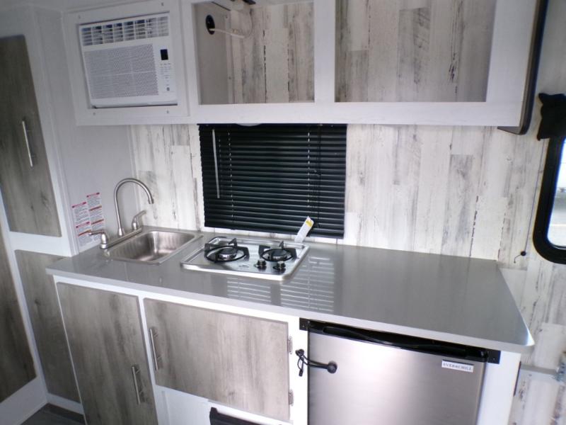 This travel trailer may be small in size, but it still packs in everything you will need for a fun camping trip! Prepare a delicious home cooked meal with the two burner stovetop, clean up the dishes in the single bowl sink, and store any leftovers in the 12V refrigerator. The booth dinette is great for eating meals, playing games, and transforming into an extra sleeping space. The front sofa/full bed can also be another sleeping space. There is shelving and overhead cabinets to store your items. The wet bathroom which has a 12V power vent to eliminate any unwanted steam.