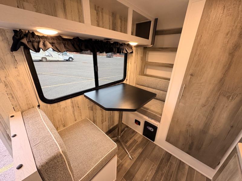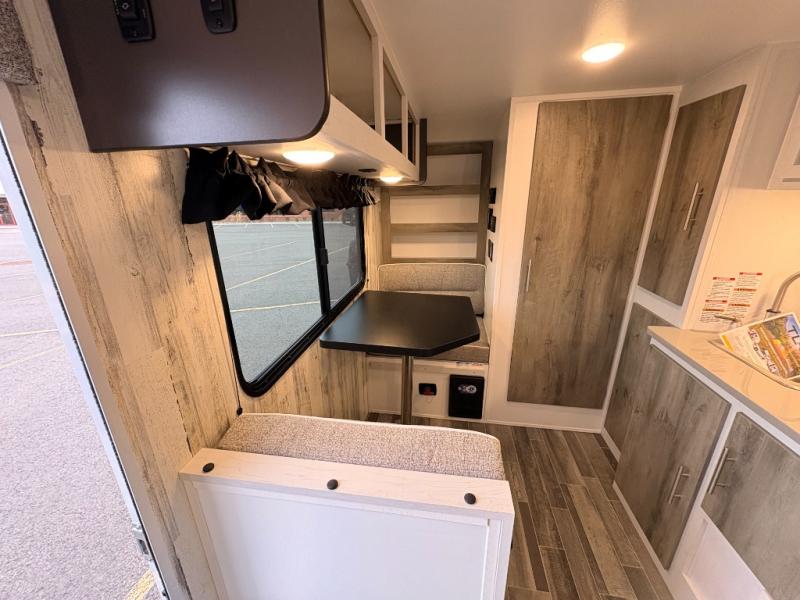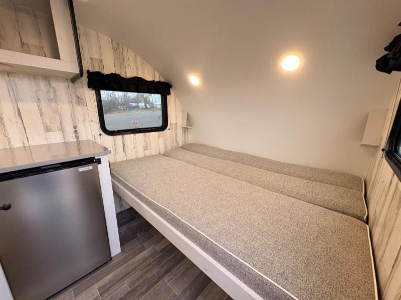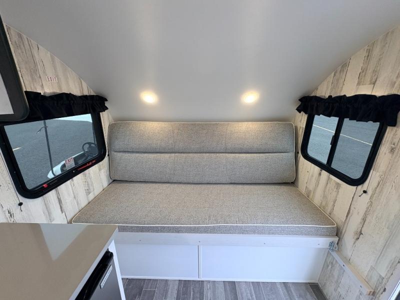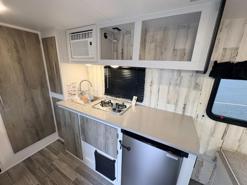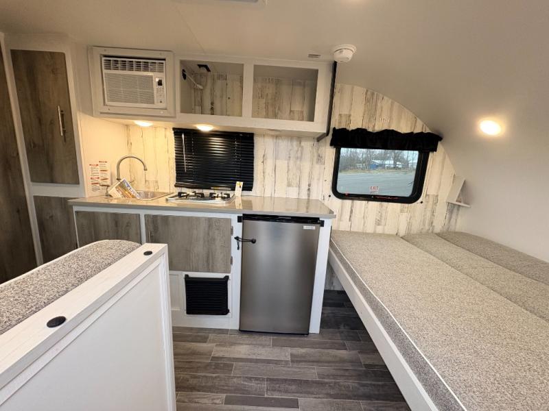 This travel trailer may be small in size, but it still packs in everything you will need for a fun camping trip! Prepare a delicious home cooked meal with the two burner stovetop, clean up the dishes in the single bowl sink, and store any leftovers in the 12V refrigerator. The booth dinette is great for eating meals, playing games, and transforming into an extra sleeping space. The front sofa/full bed can also be another sleeping space. There is shelving and overhead cabinets to store your items. The wet bathroom which has a 12V power vent to eliminate any unwanted steam.