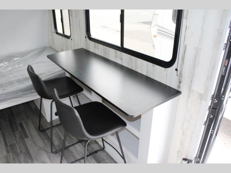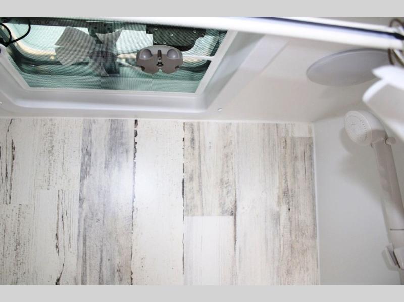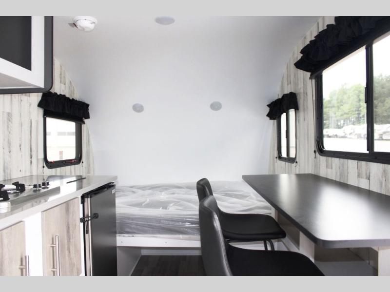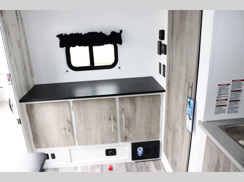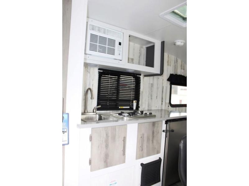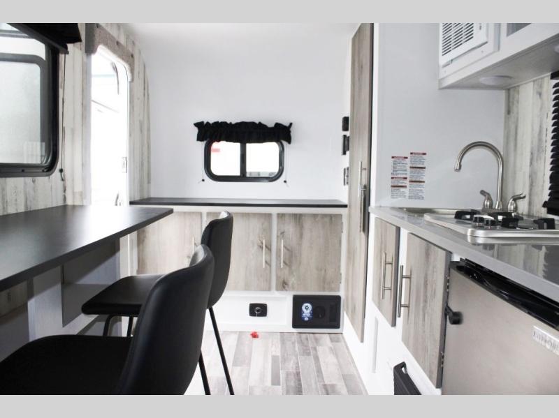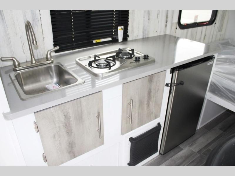 Head out on your greatest adventure with this travel trailer! Prepare a delicious home cooked meal with the two burner stovetop, clean up the dishes in the single bowl sink, and store any leftovers in the below the counter 12V 3 cu. ft. refrigerator. The bar tabletop dinette has two stools to sit on while you gaze out the window at your beautiful scenery. The front 54" x 75" bed offers a comfortable sleeping space at night. There is shelving and overhead cabinets to store your items. The 21" x 35" combo wet bathroom has a 12V power vent to eliminate any unwanted steam.
