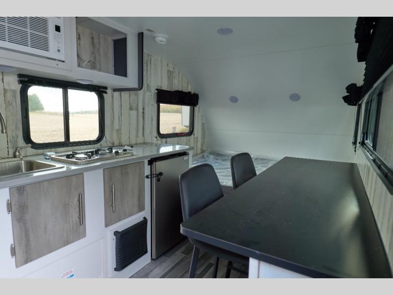 Head out on your greatest adventure with this travel trailer! Prepare a delicious home cooked meal with the two burner stovetop, clean up the dishes in the single bowl sink, and store any leftovers in the below the counter 12V 3 cu. ft. refrigerator. The bar tabletop dinette has two stools to sit on while you gaze out the window at your beautiful scenery. The front 54" x 75" bed offers a comfortable sleeping space at night. There is shelving and overhead cabinets to store your items. The 21" x 35" combo wet bathroom has a 12V power vent to eliminate any unwanted steam.