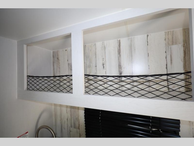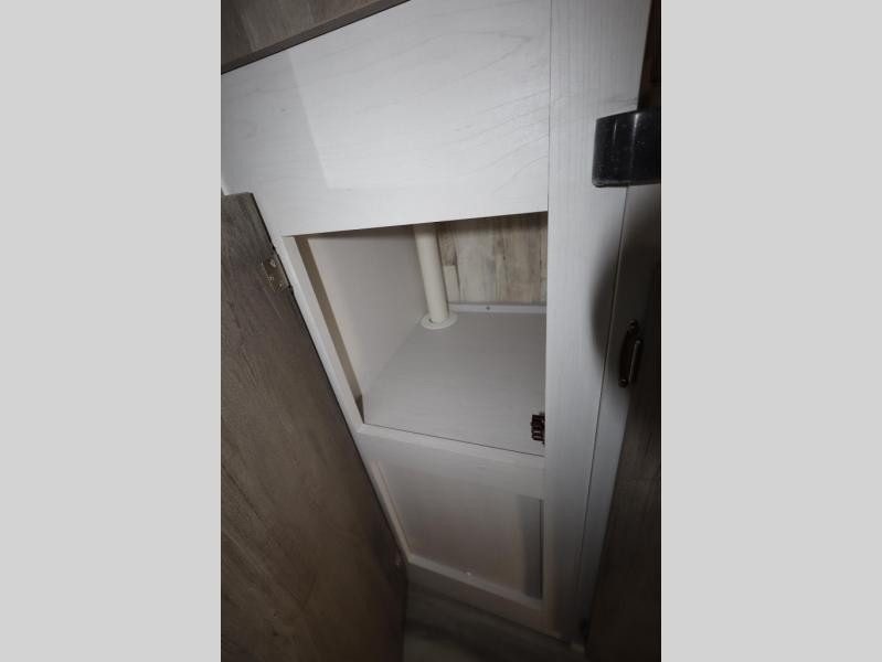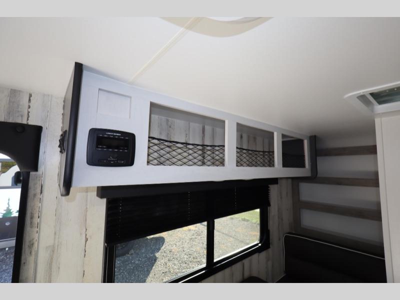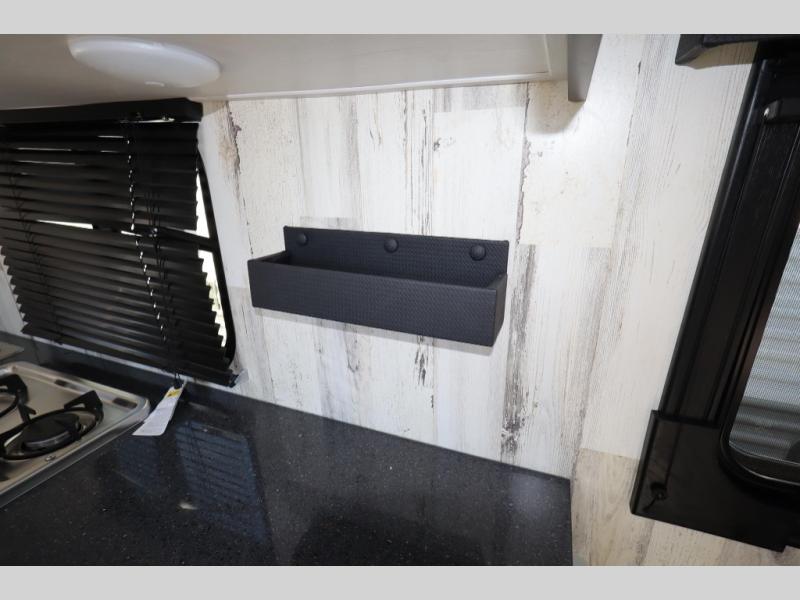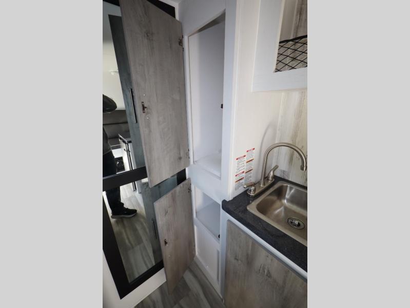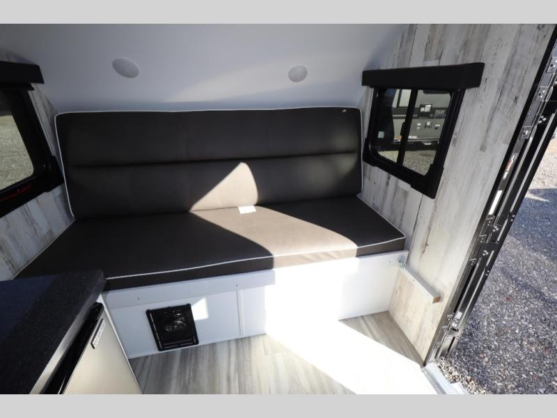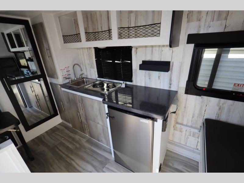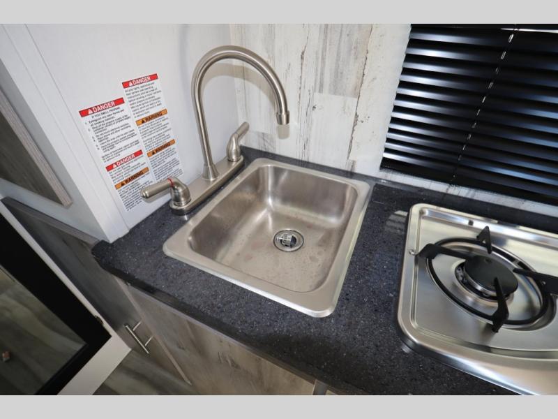 This travel trailer may be small in size, but it still packs in everything you will need for a fun camping trip! Prepare a delicious home cooked meal with the two burner stovetop, clean up the dishes in the single bowl sink, and store any leftovers in the 12V refrigerator. The booth dinette is great for eating meals, playing games, and transforming into an extra sleeping space. The front sofa/full bed can also be another sleeping space. There is shelving and overhead cabinets to store your items. The wet bathroom which has a 12V power vent to eliminate any unwanted steam.