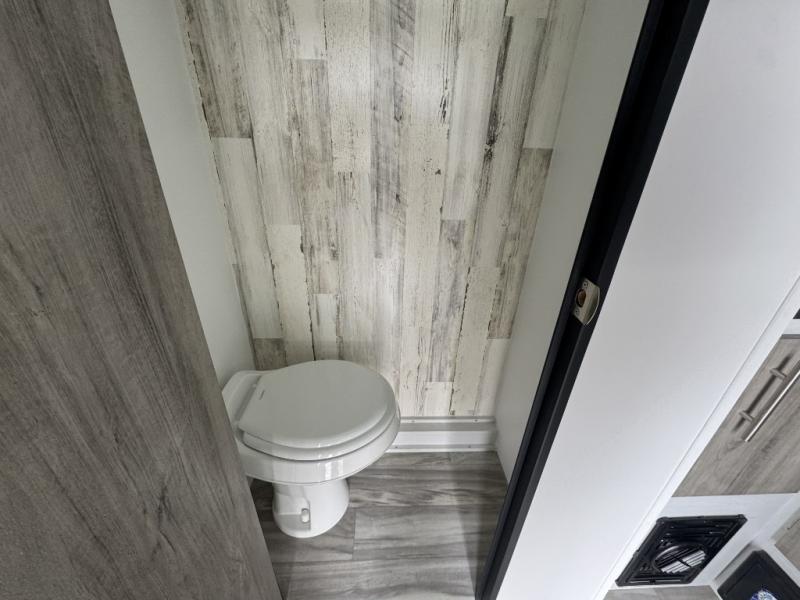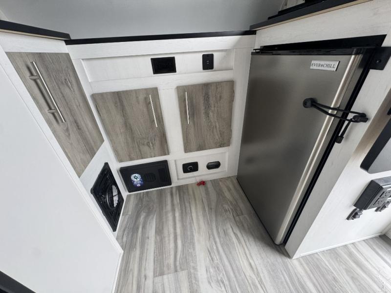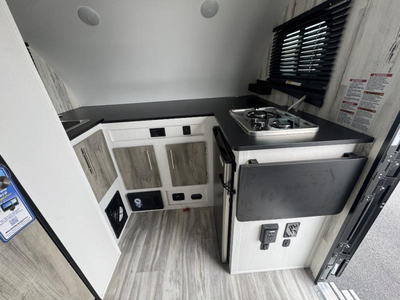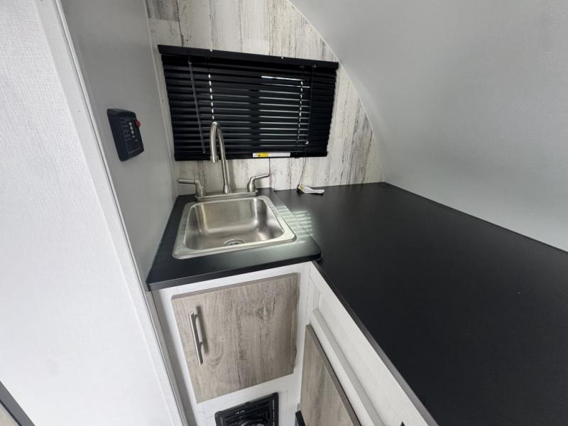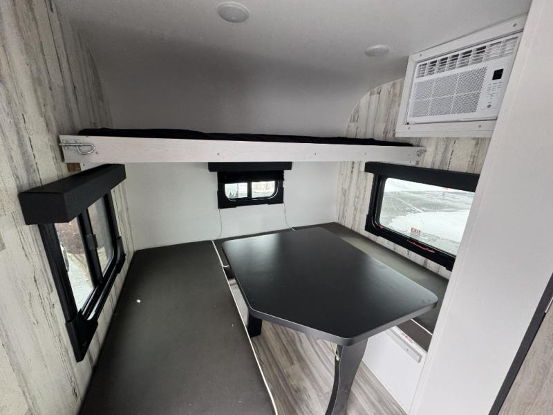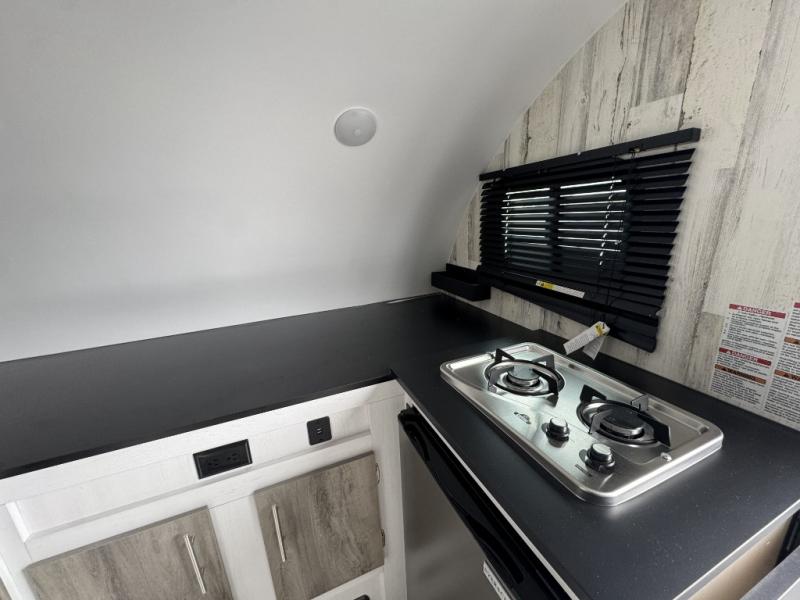 This lightweight and compact travel trailer will be perfect for trips to your favorite camping spot. There is a 12V refrigerator and two-burner stainless-steel stove top inside that will allow you to store and cook meals each day, and the rear booth dinette provides a place to dine together. This dinette can convert to a 54" x 74" bed plus there is a front bunk with a 150 lb. capacity for little ones. A private toilet onboard means you won't have to leave your camper in the middle of the night, and you'll stay comfortable thanks to the 6k BTU A/C and 18k BTU furnace!