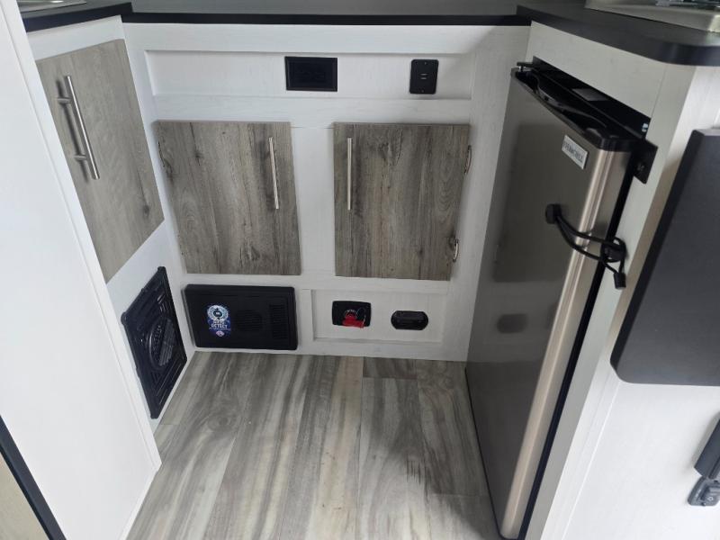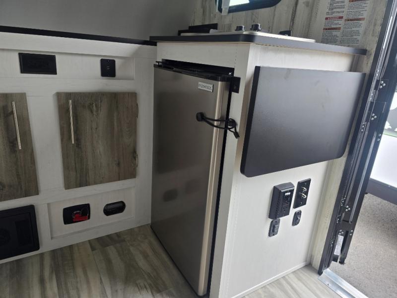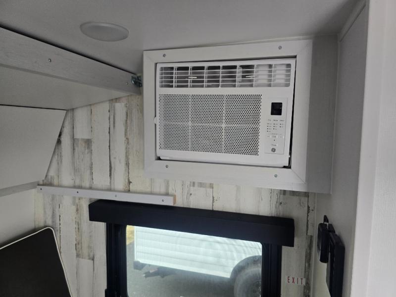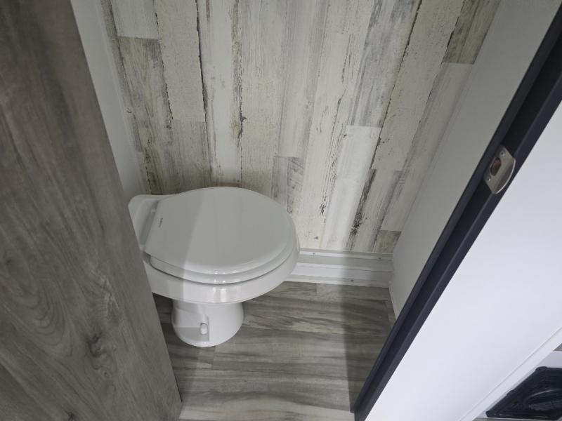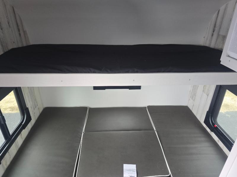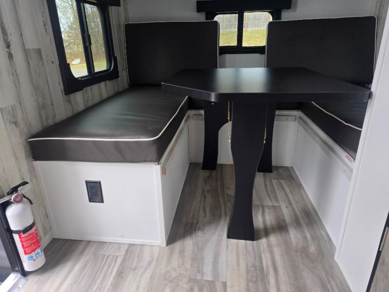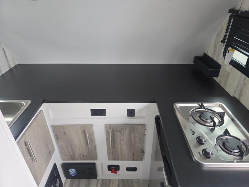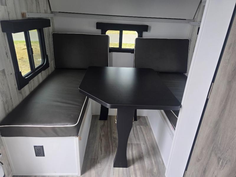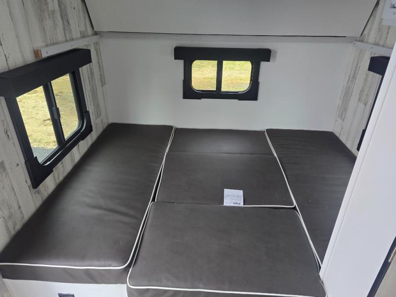 This lightweight and compact travel trailer will be perfect for trips to your favorite camping spot. There is a 12V refrigerator and two-burner stainless-steel stove top inside that will allow you to store and cook meals each day, and the rear booth dinette provides a place to dine together. This dinette can convert to a 54" x 74" bed plus there is a front bunk with a 150 lb. capacity for little ones. A private toilet onboard means you won't have to leave your camper in the middle of the night, and you'll stay comfortable thanks to the 6k BTU A/C and 18k BTU furnace!