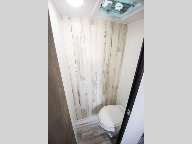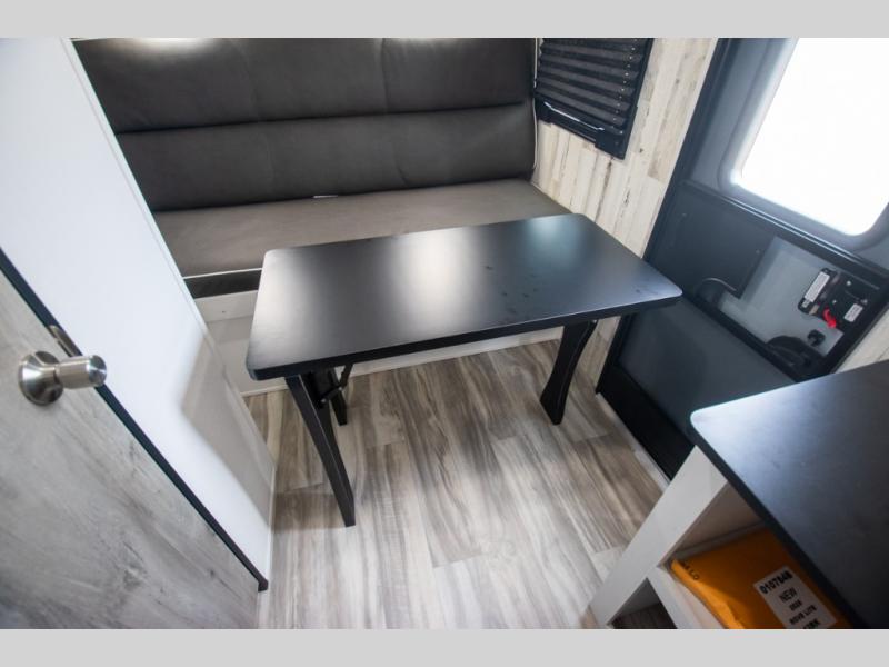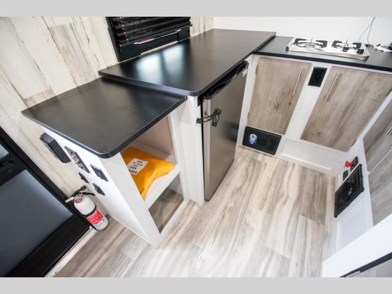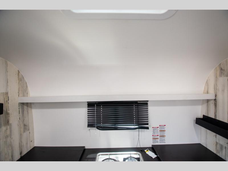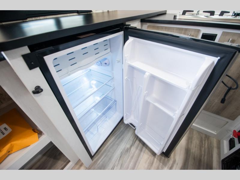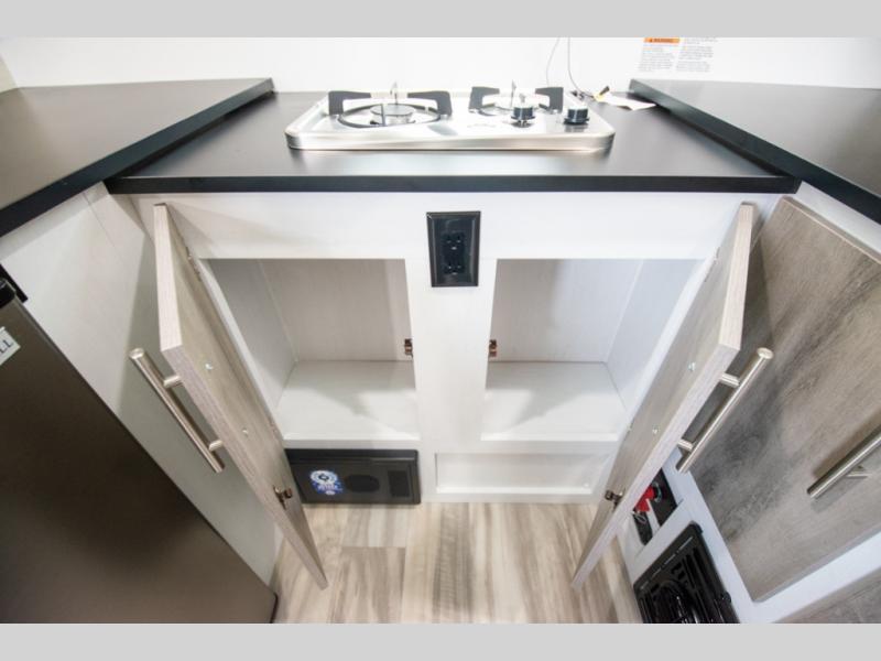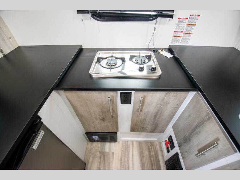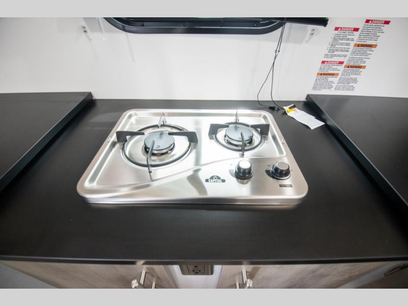 Pack your bags and head off on adventure in this lightweight travel trailer for two! Once you've unloaded your bags, you can set up the 7'6" awning, then head inside to make lunch on the two burner stainless steel stovetop. There is also ample counter space in the rear kitchen, plus a 3 cu. ft. 12V refrigerator to keep your food fresh. This unit also includes a private toilet for added convenience!