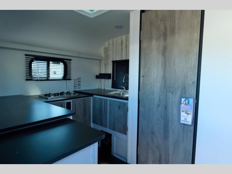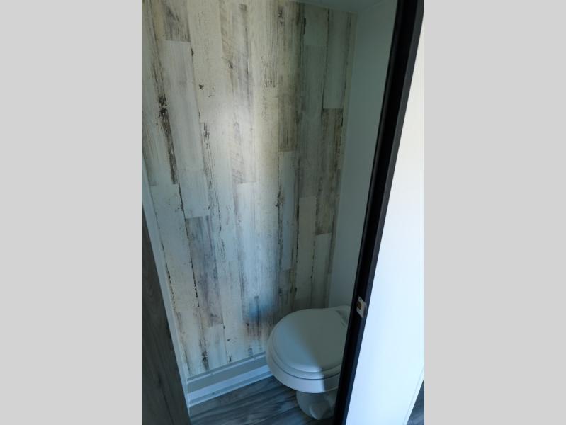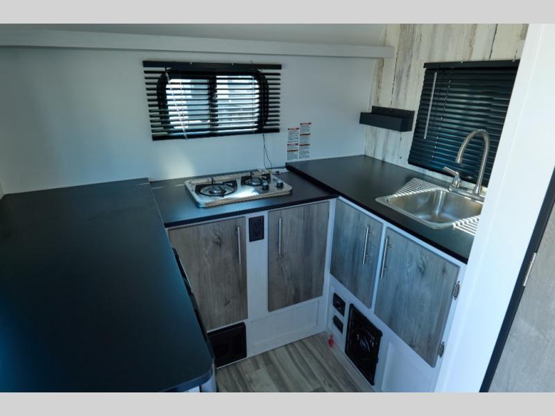 Pack your bags and head off on adventure in this lightweight travel trailer for two! Once you've unloaded your bags, you can set up the 7'6" awning, then head inside to make lunch on the two burner stainless steel stovetop. There is also ample counter space in the rear kitchen, plus a 3 cu. ft. 12V refrigerator to keep your food fresh. This unit also includes a private toilet for added convenience!