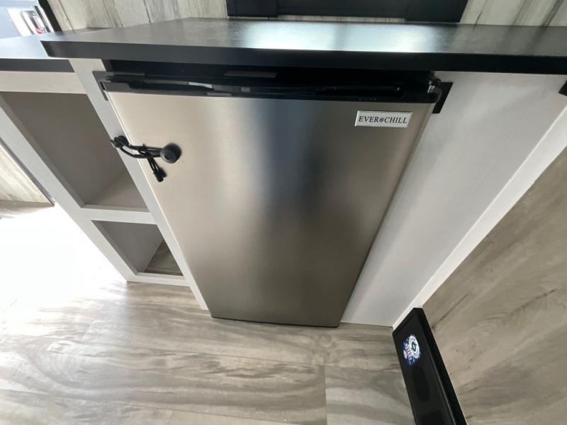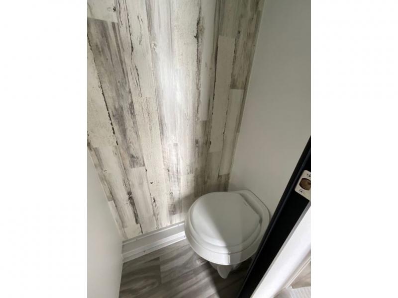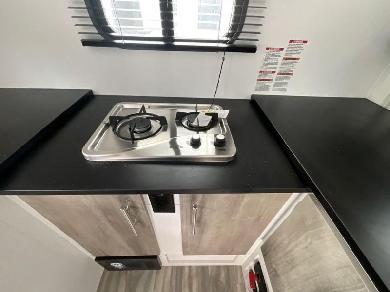 Pack your bags and head off on adventure in this lightweight travel trailer for two! Once you've unloaded your bags, you can set up the 7'6" awning, then head inside to make lunch on the two burner stainless steel stovetop. There is also ample counter space in the rear kitchen, plus a 3 cu. ft. 12V refrigerator to keep your food fresh. This unit also includes a private toilet for added convenience!